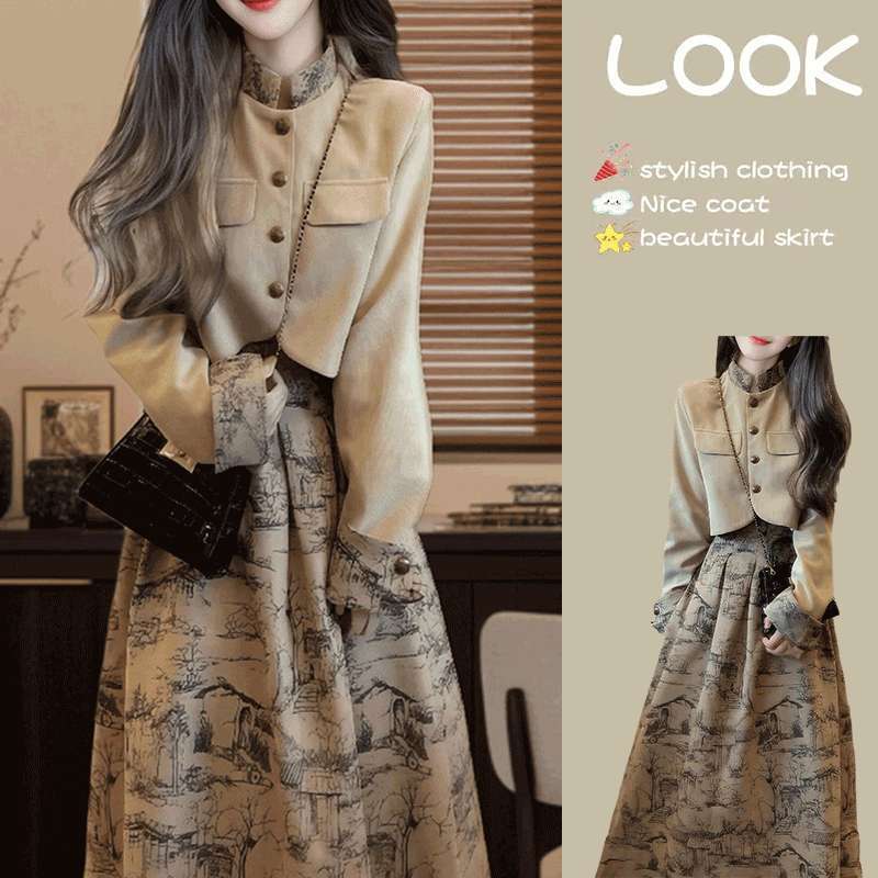 새로운 중국 스타일 우아한 양면 웨이드 쇼트 코트 여성의 2025 가을 및 겨울 새로운 Guofeng 오버 스커트 고급 사교계 투피스 세트스토어 가기