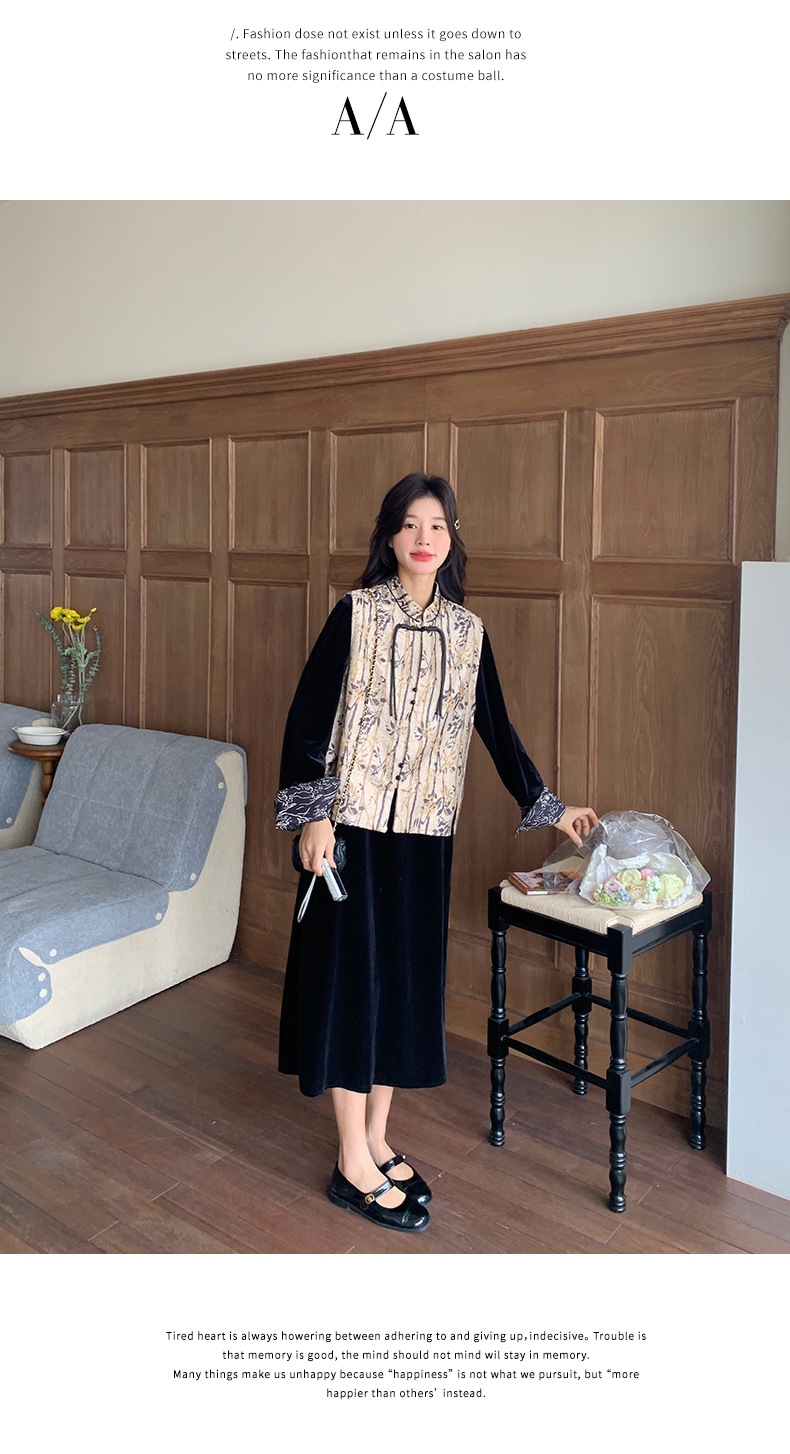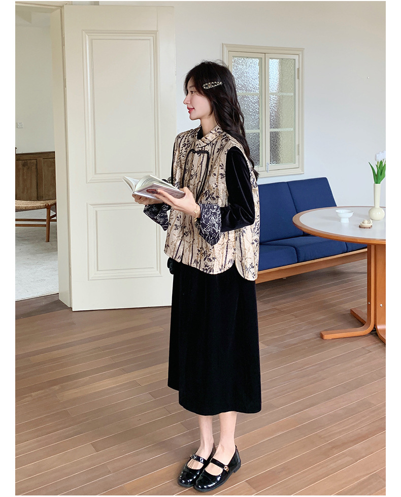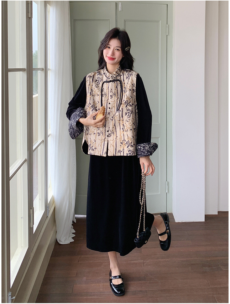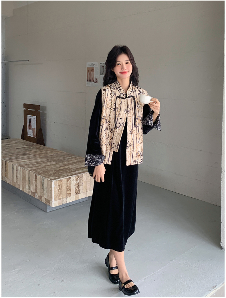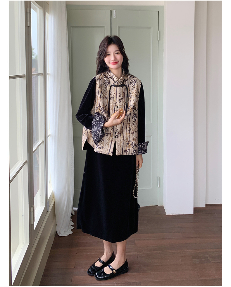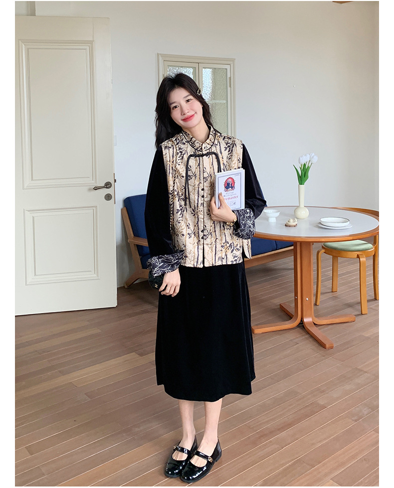 [Mengmei] 25 봄 스타일 새로운 중국 스타일 국가 스타일 원피스 세트 여성 레트로 버튼 조끼 벨벳 투피스 세트스토어 가기