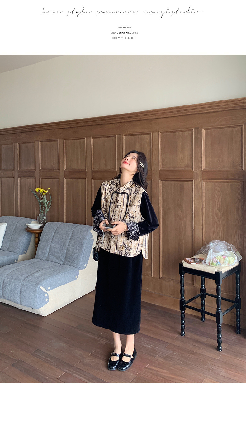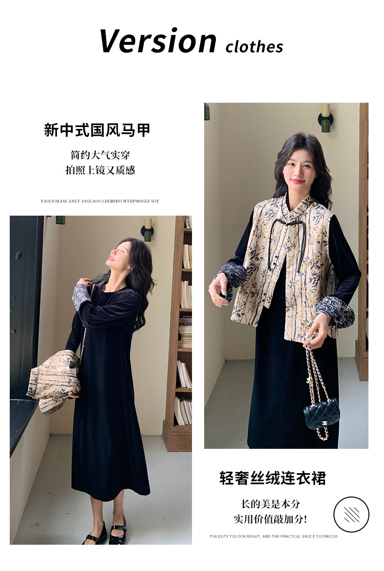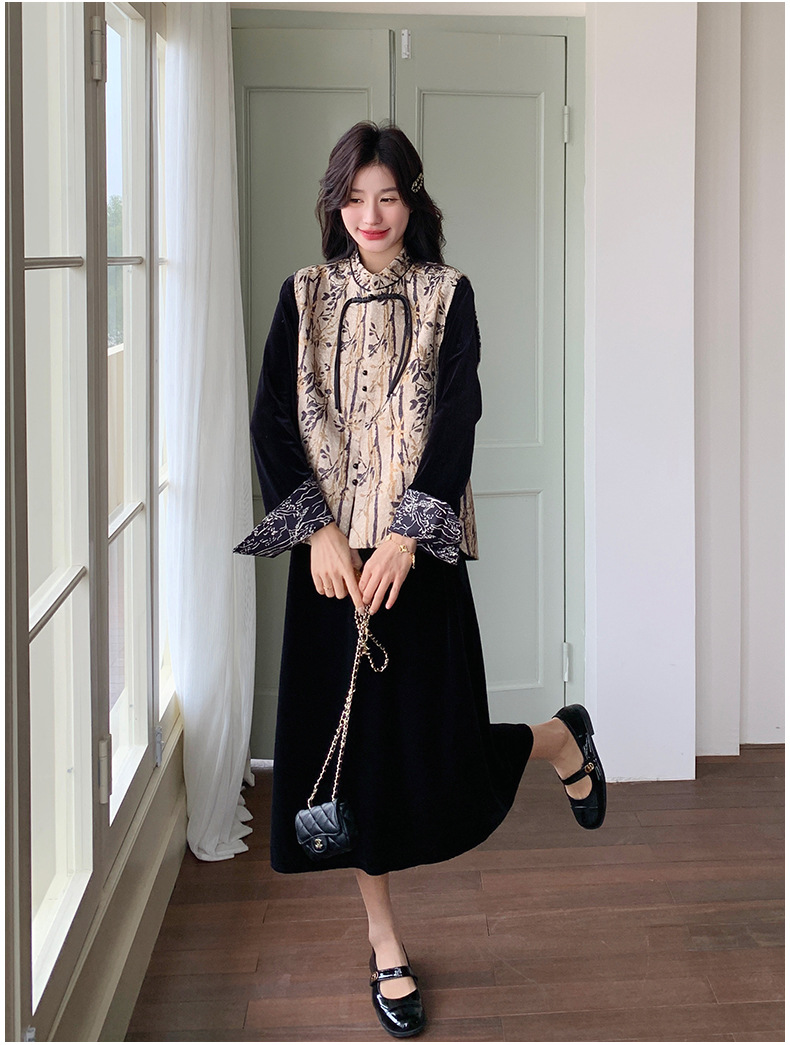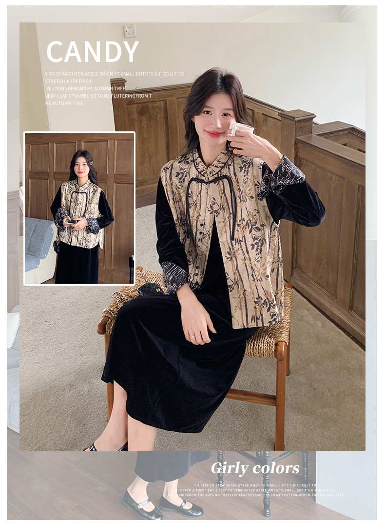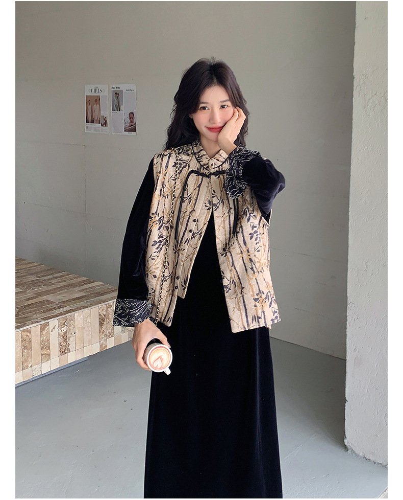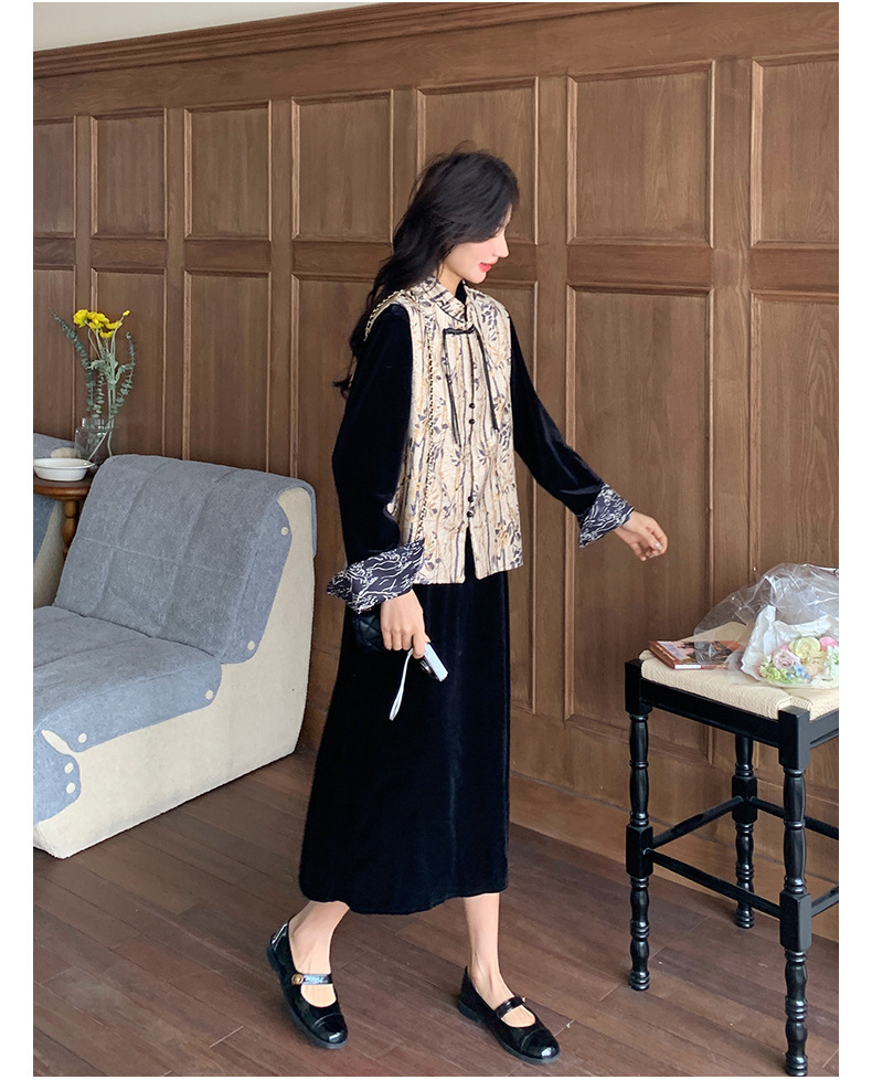 [Mengmei] 25 봄 스타일 새로운 중국 스타일 국가 스타일 원피스 세트 여성 레트로 버튼 조끼 벨벳 투피스 세트스토어 가기