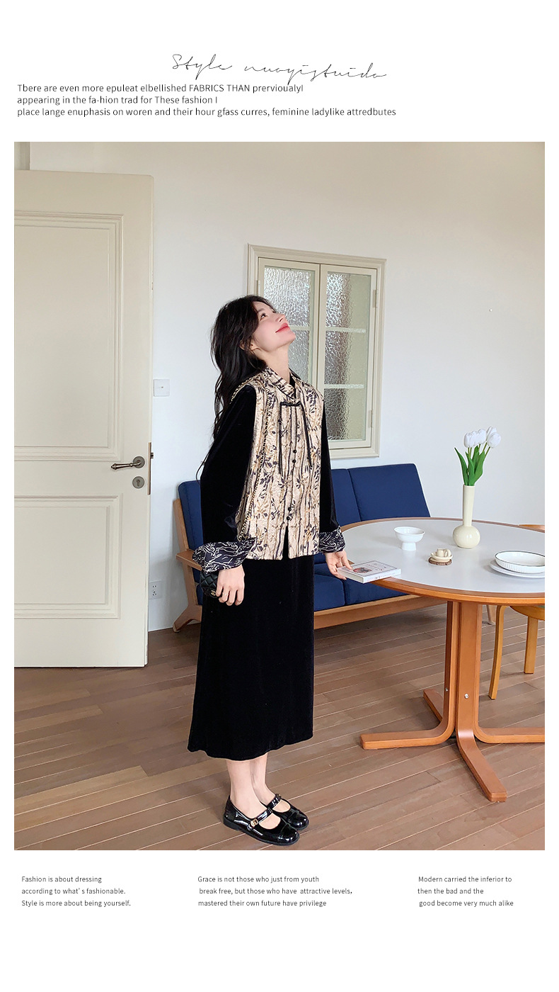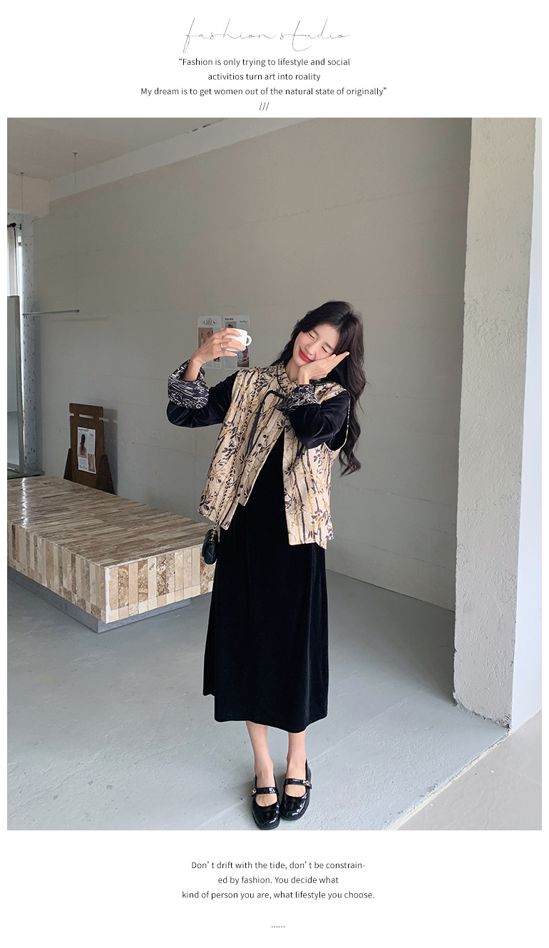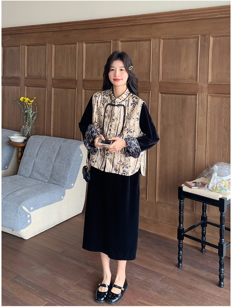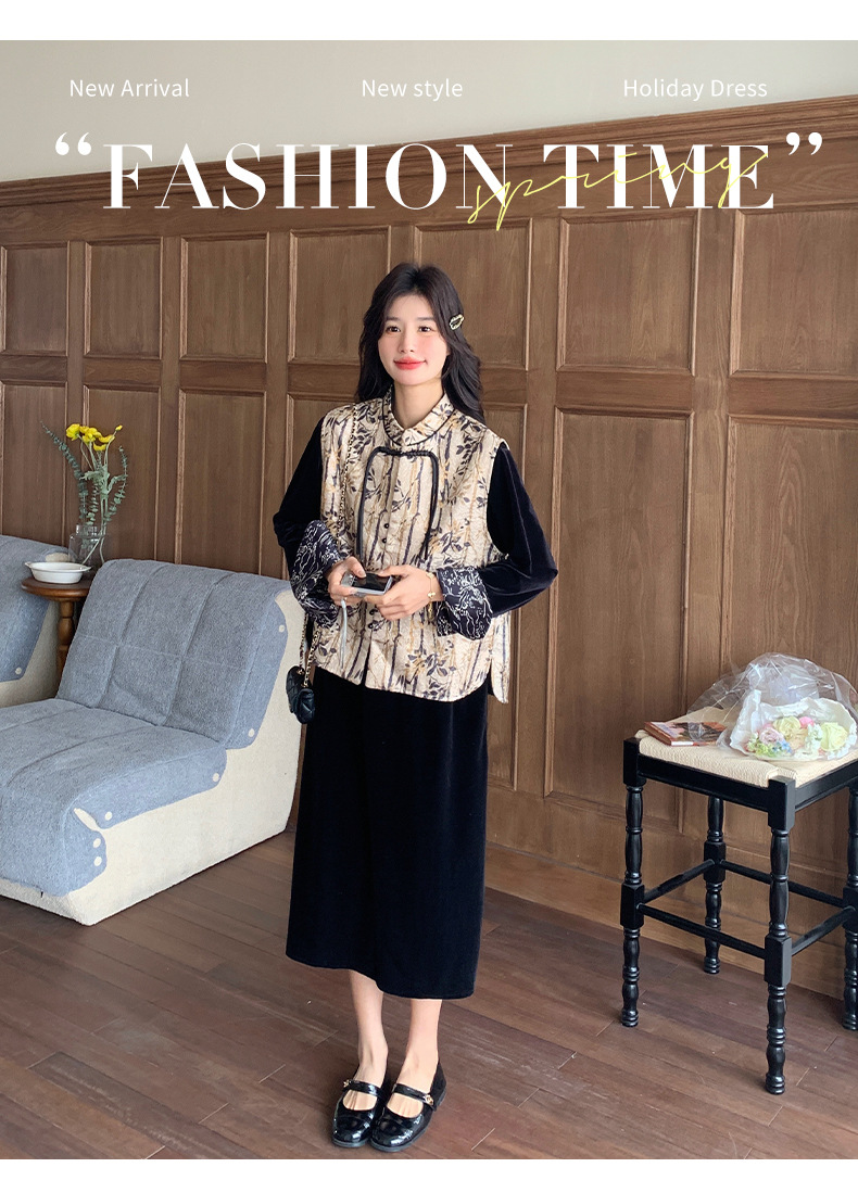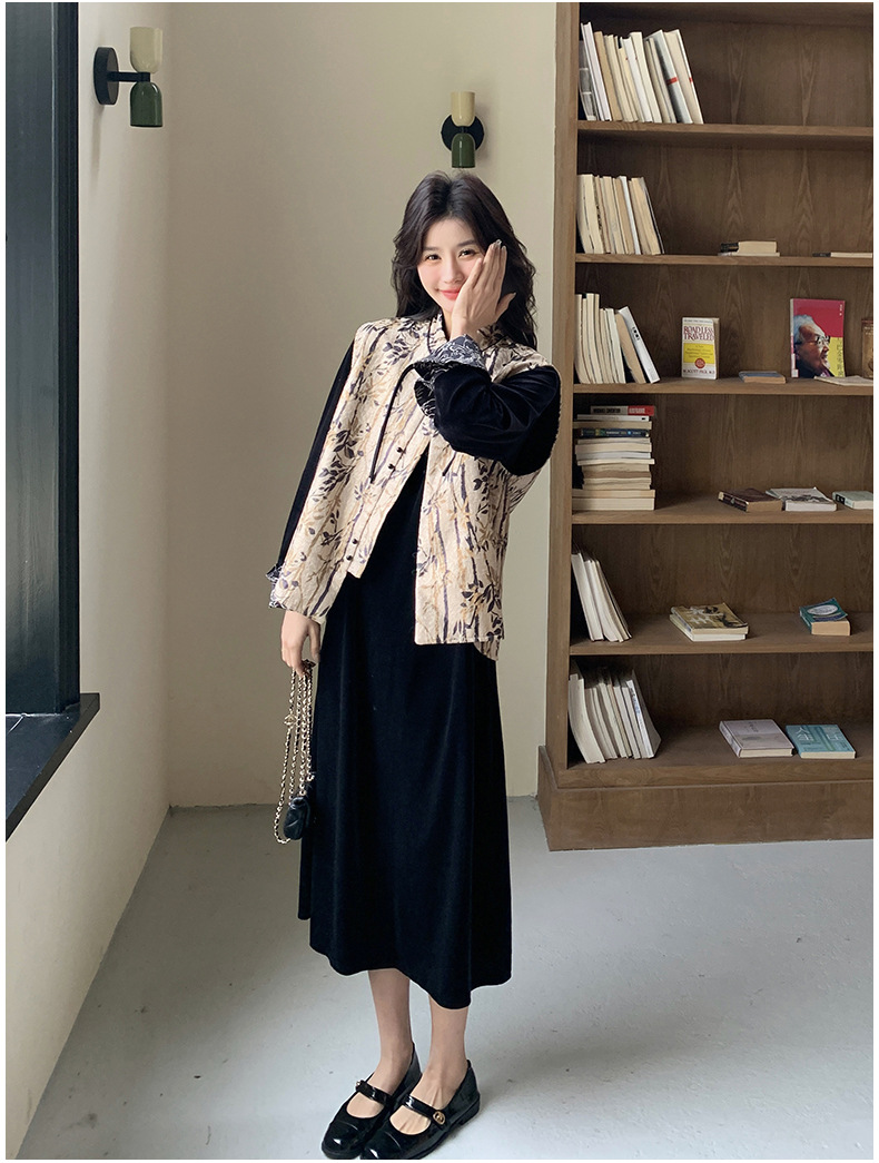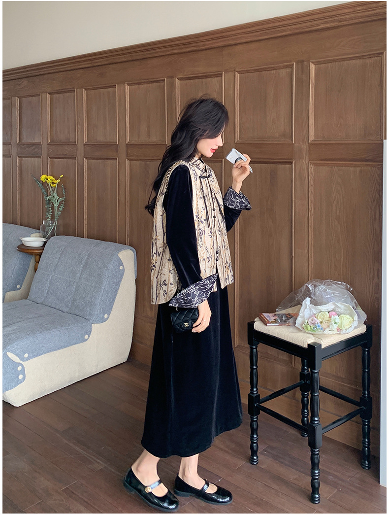 [Mengmei] 25 봄 스타일 새로운 중국 스타일 국가 스타일 원피스 세트 여성 레트로 버튼 조끼 벨벳 투피스 세트스토어 가기