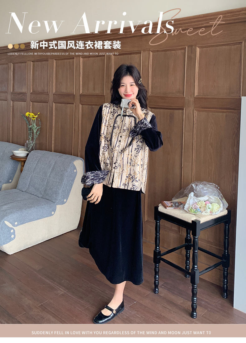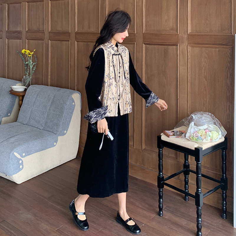 [Mengmei] 25 봄 스타일 새로운 중국 스타일 국가 스타일 원피스 세트 여성 레트로 버튼 조끼 벨벳 투피스 세트