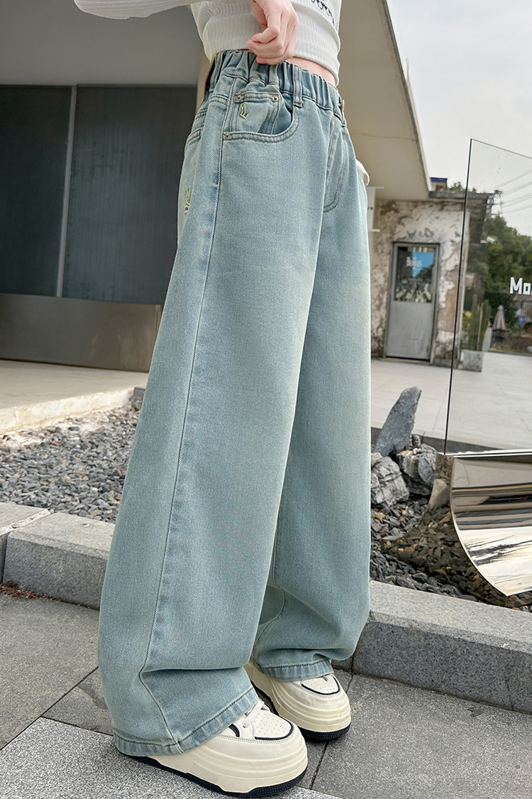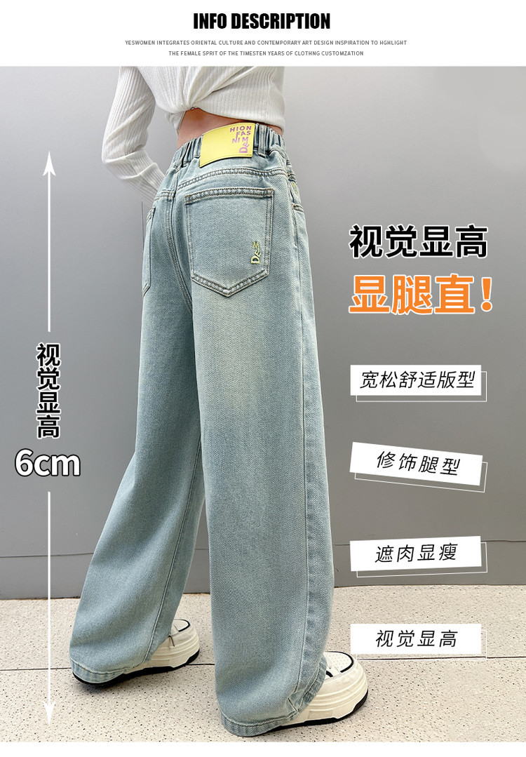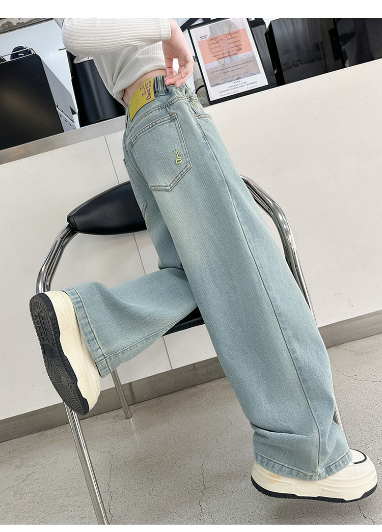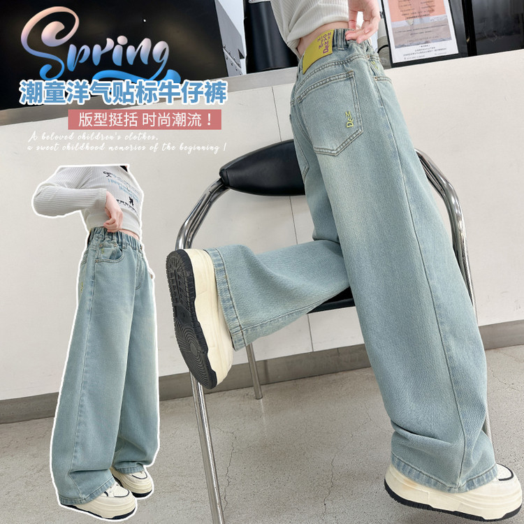 소녀 청바지 봄과 가을 2025 새로운 어린이 세련된 와이드 레그 바지 소녀의 봄 라벨 스트레이트 바지