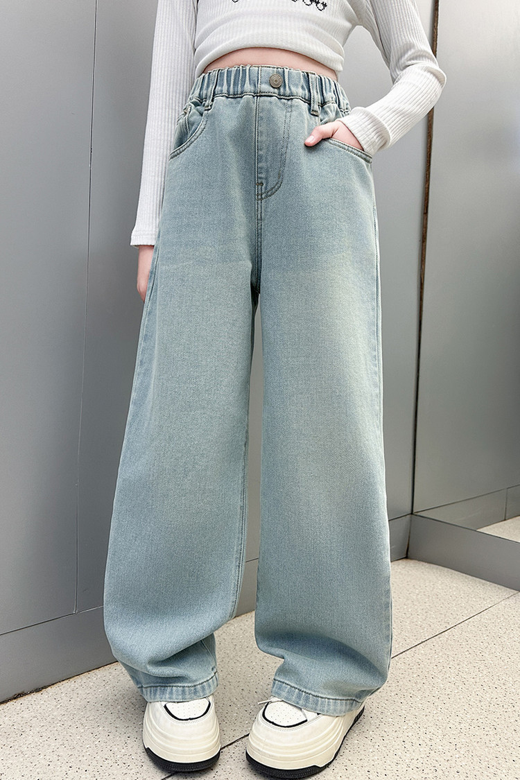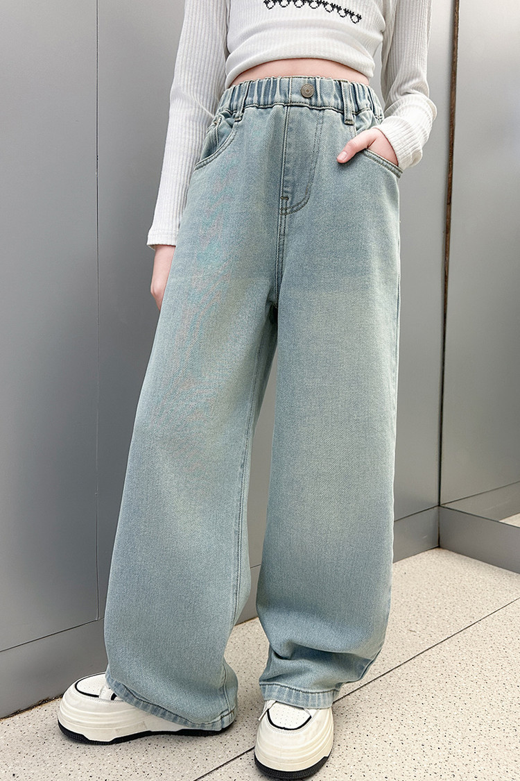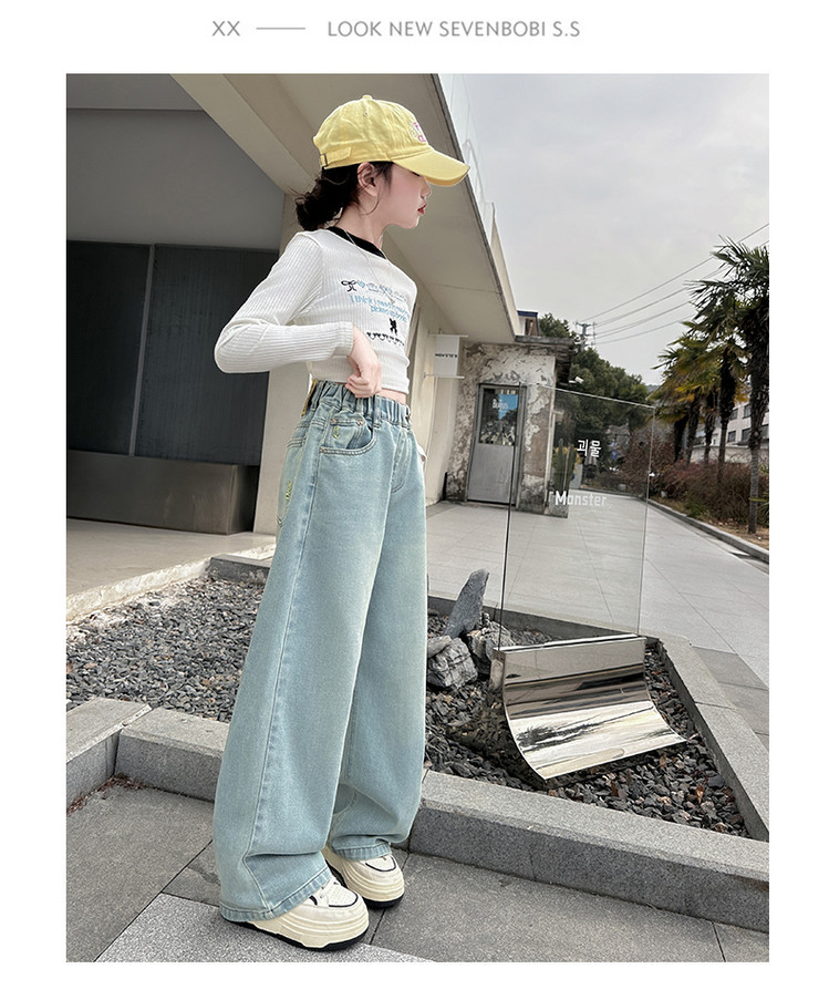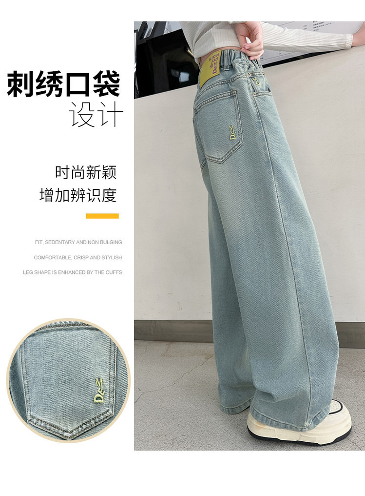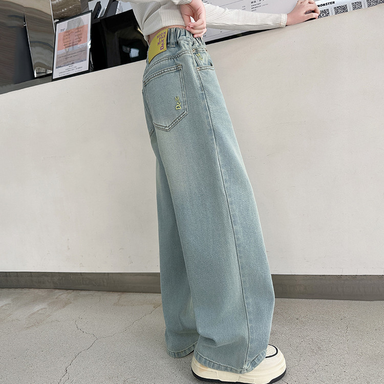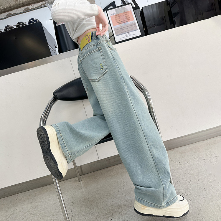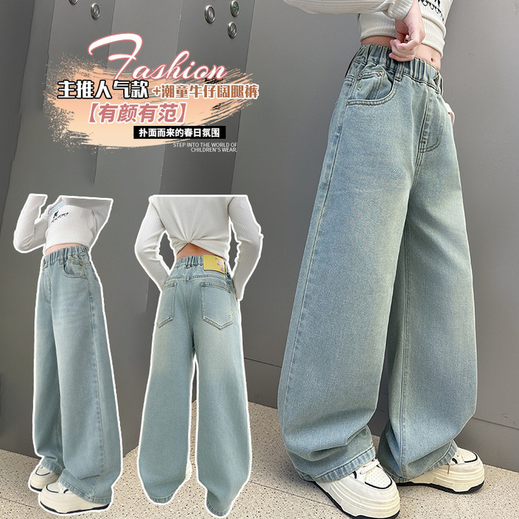 소녀 청바지 봄과 가을 2025 새로운 어린이 세련된 와이드 레그 바지 소녀의 봄 라벨 스트레이트 바지스토어 가기