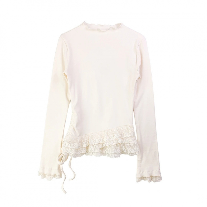 크림 화이트 더블 레이스 바느질 하프 하이 칼라 긴팔 티셔츠 여성의 가을과 겨울 슬림-핏 드로우 스트링 내부 양털 탑