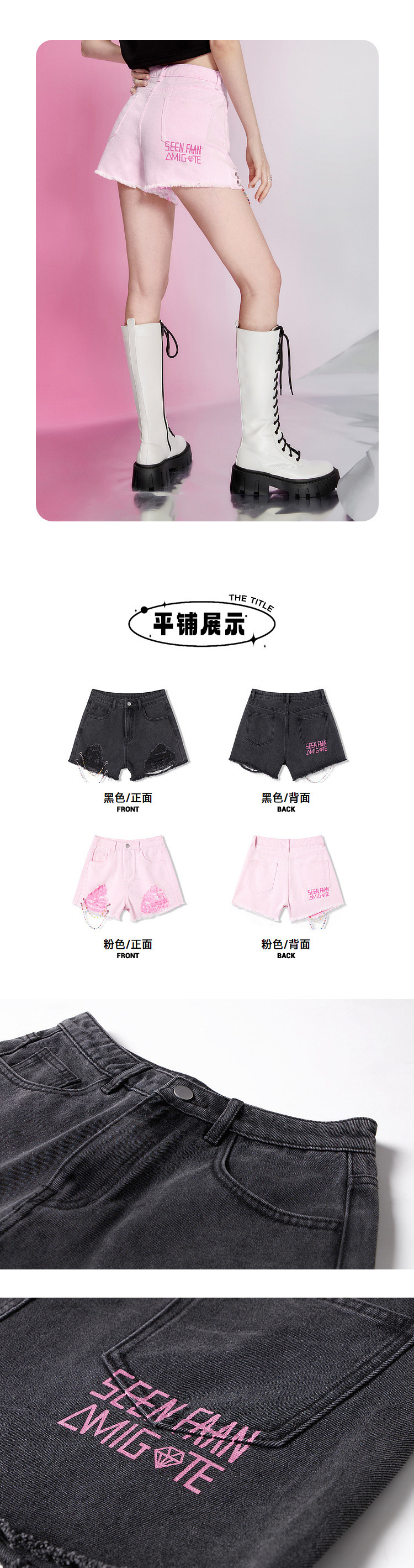 세탁 된 데님 반바지 여성의 녹 릭 체인 디자인 센스 스트리트 패션 핫 바지스토어 가기