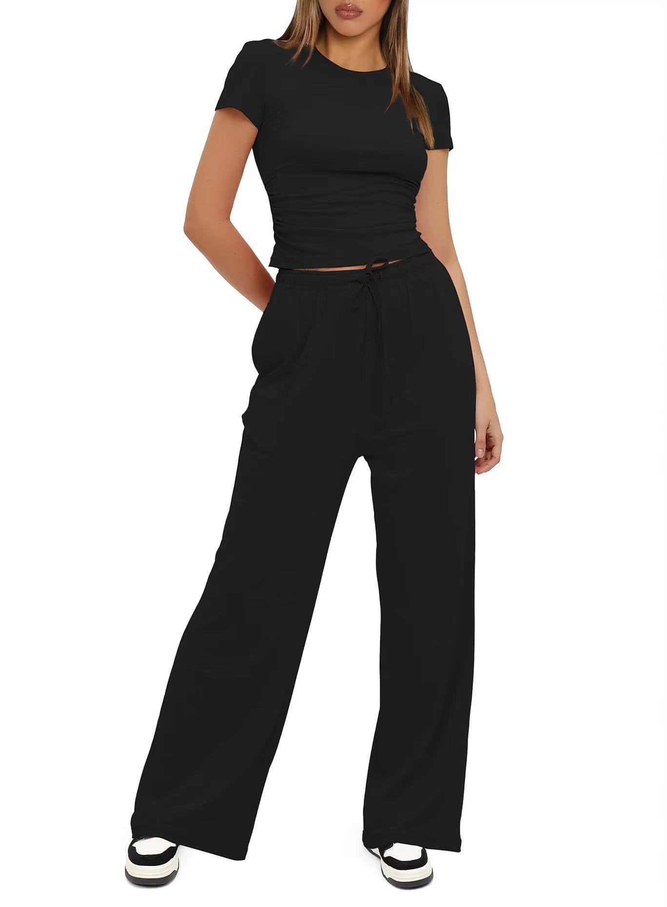 2025 유럽 및 미국 무역 아마존 여성용 투피스 캐주얼 세트 주름 장식 패션 반팔 상의 와이드 팬츠