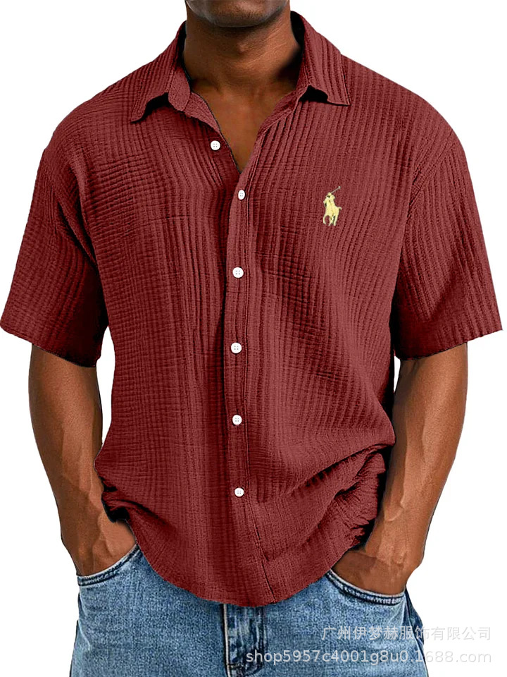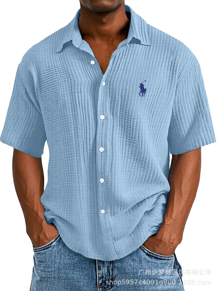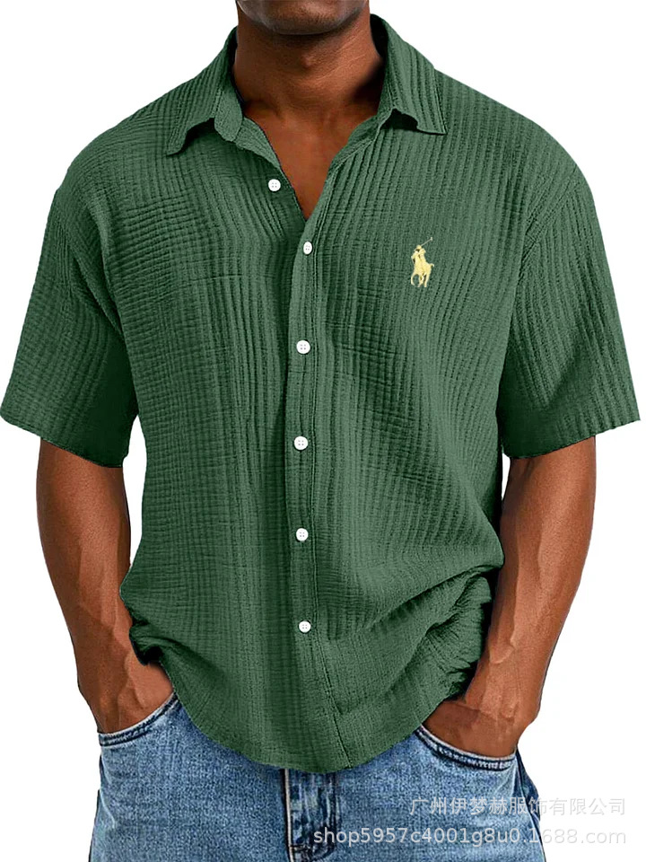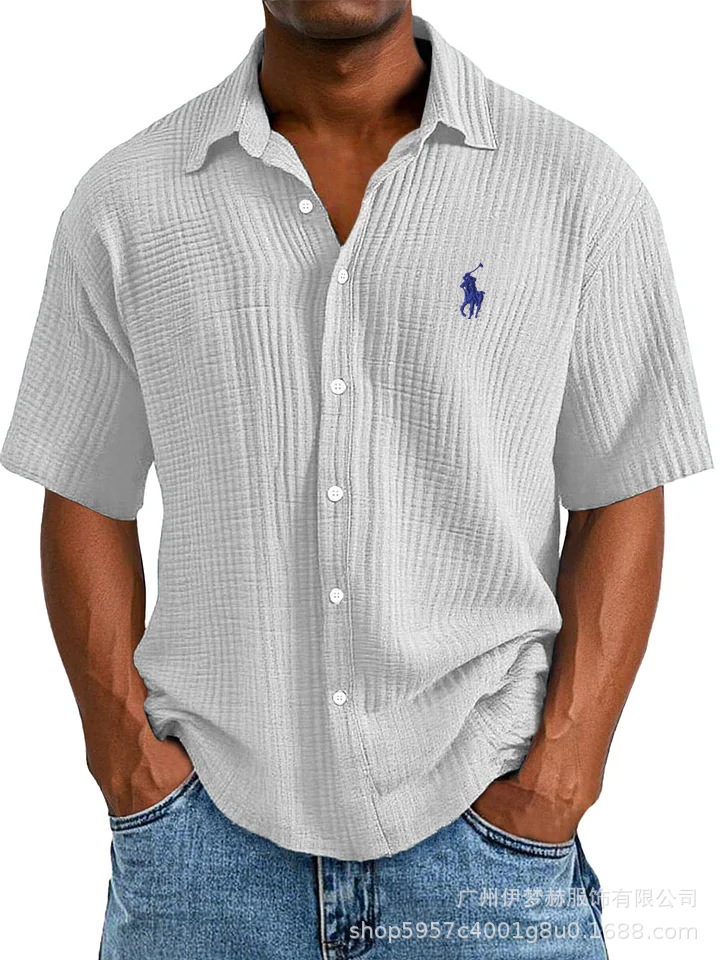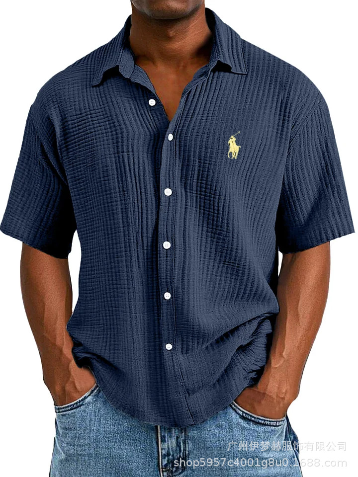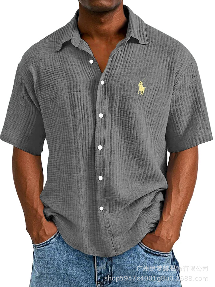 Tiktok temu2025 새로운 크로스 국경 플러스 사이즈 셔츠 자수 남성용 느슨한 면 짧은 소매 옷깃 셔츠