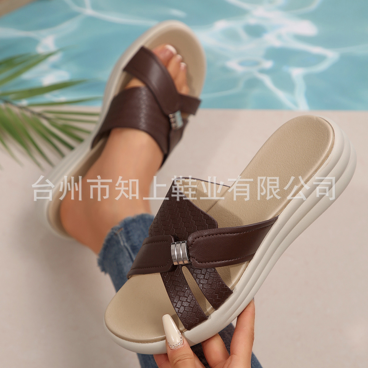 跨境软底妈妈拖鞋女夏季新款平底拼色一字拖露趾中年女凉拖鞋外穿