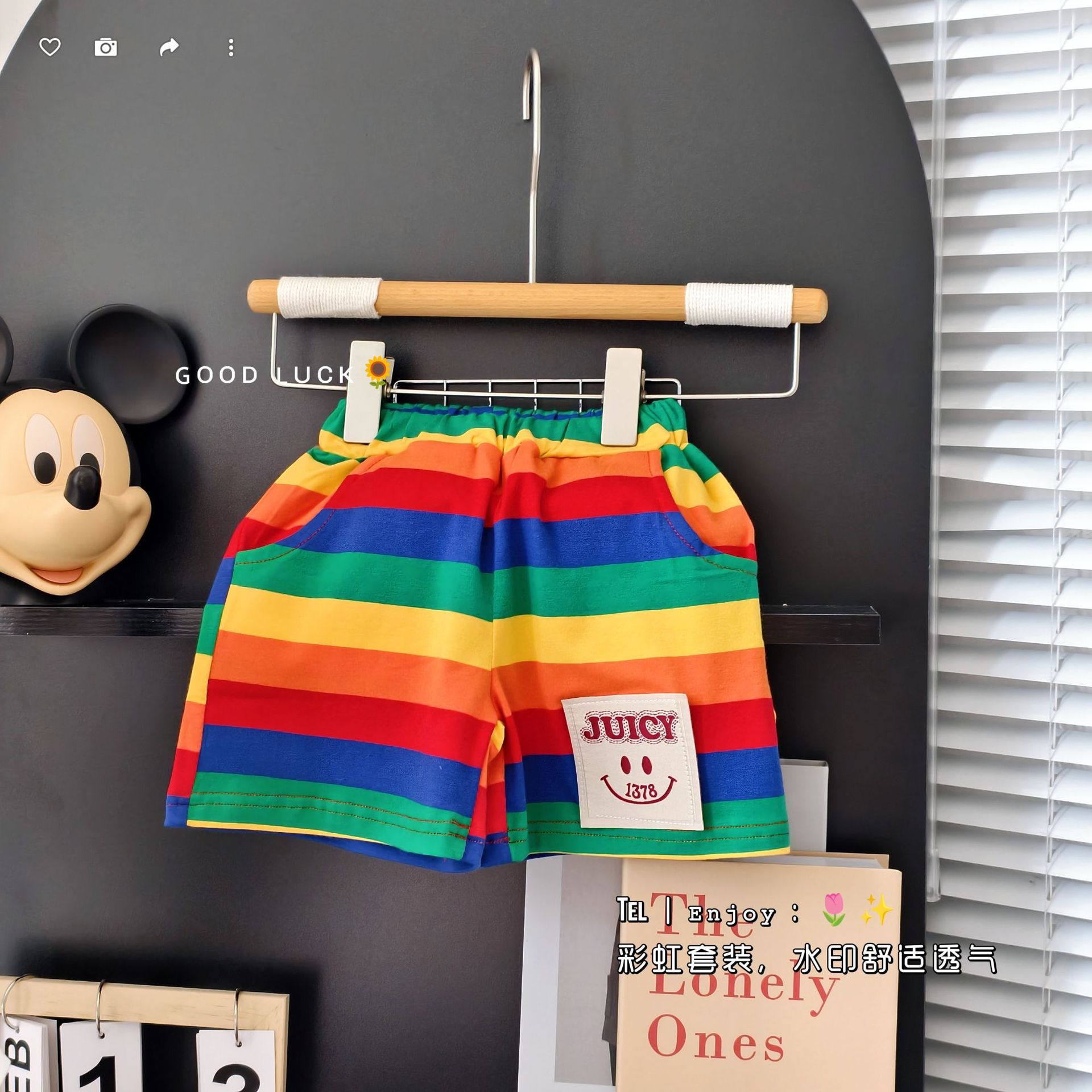 Zhili 아동복 여름 어린이 새 유치원 남녀 보물 무지개 줄무늬 스마일리 캐주얼 느슨한 편안한 반바지