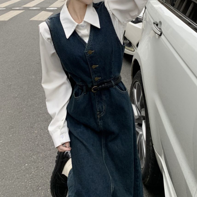 프랑스 스타일 우아한 세트 캐주얼 올 매치 화이트 셔츠 스태킹 레트로 데님 빅 원피스 봄 새로운 패션 투피스 세트스토어 가기