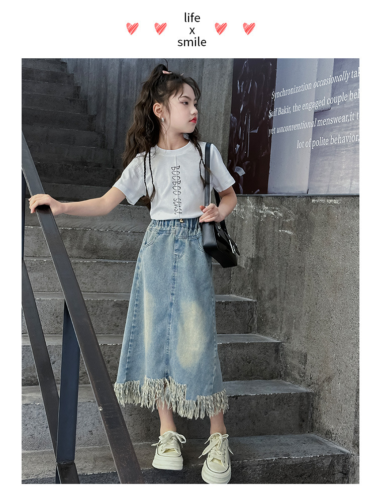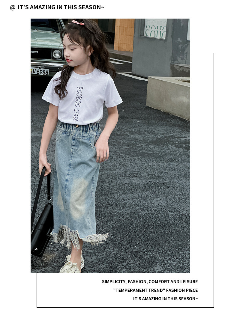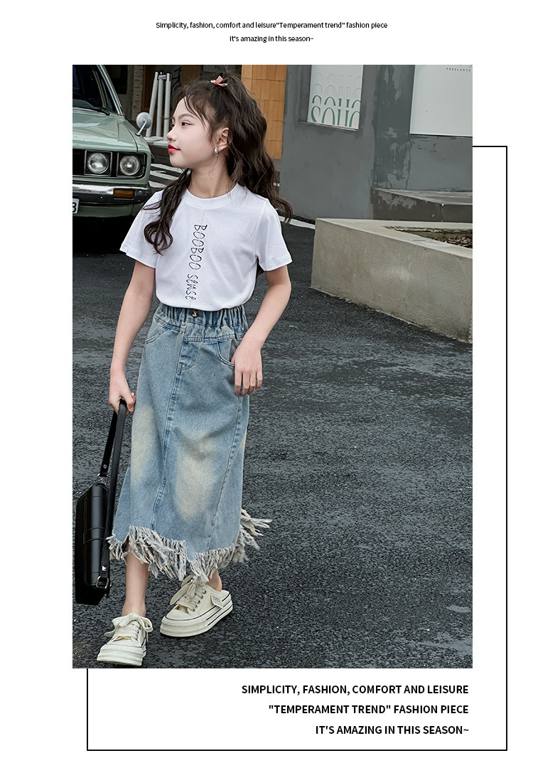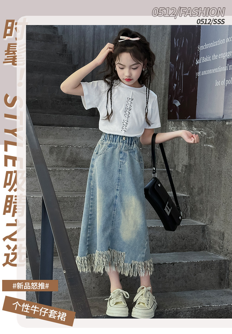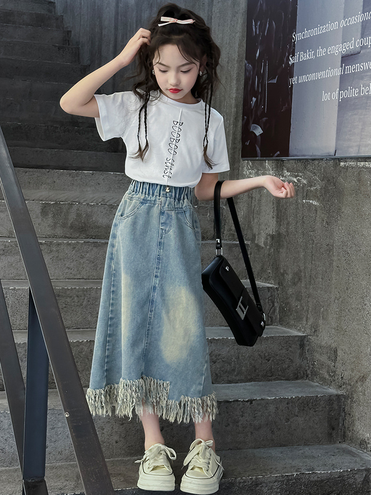 소녀 세트 2025 년 여름 새로운 어린이 서양식 분할 술 데님 치마 반팔 티셔츠 투피스 세트
