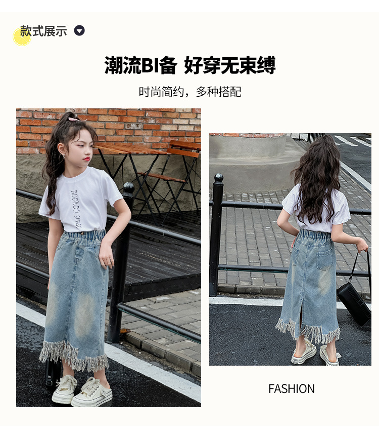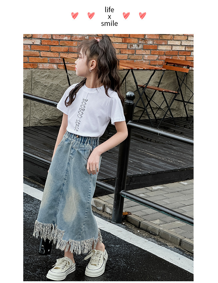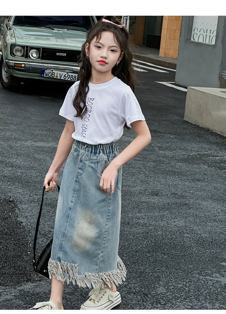 소녀 세트 2025 년 여름 새로운 어린이 서양식 분할 술 데님 치마 반팔 티셔츠 투피스 세트스토어 가기