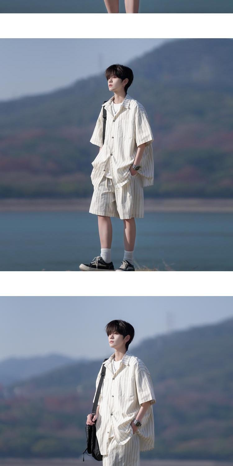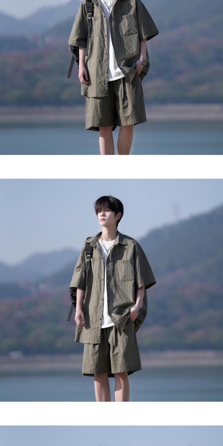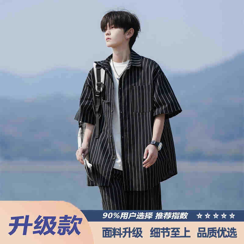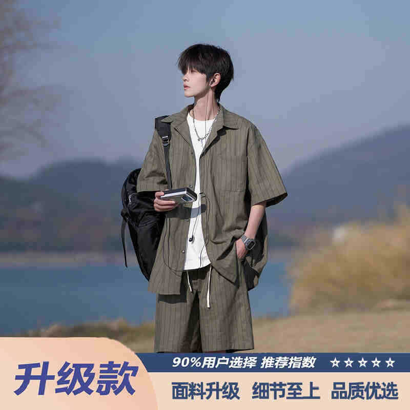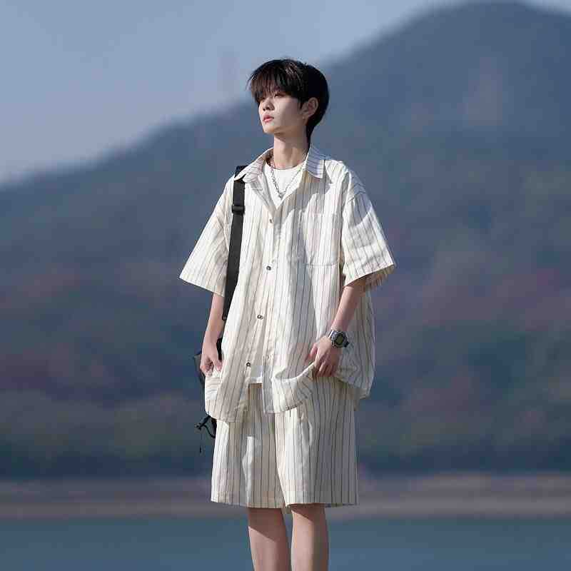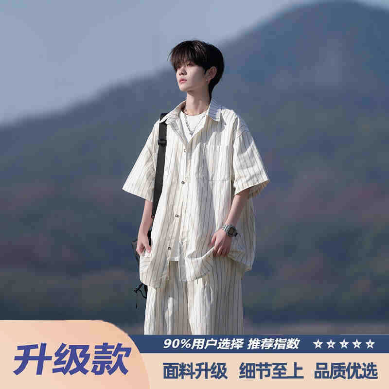 NASA 줄무늬 반팔 셔츠 남자의 여름 2025 느슨한 캐주얼 일본 도시 십대 투피스 세트