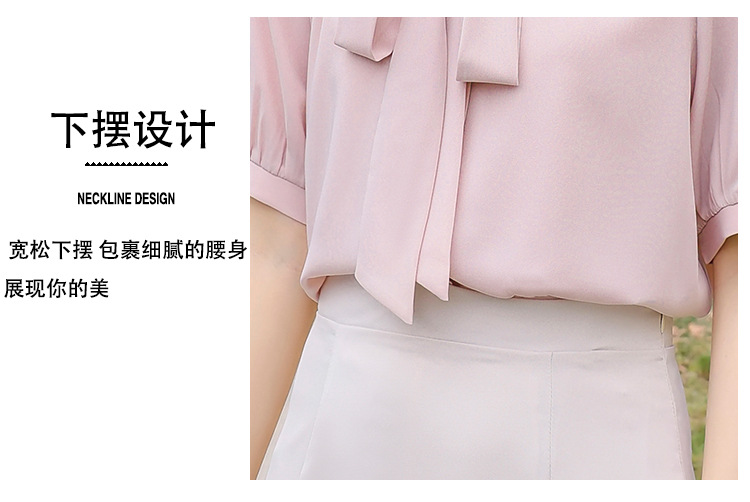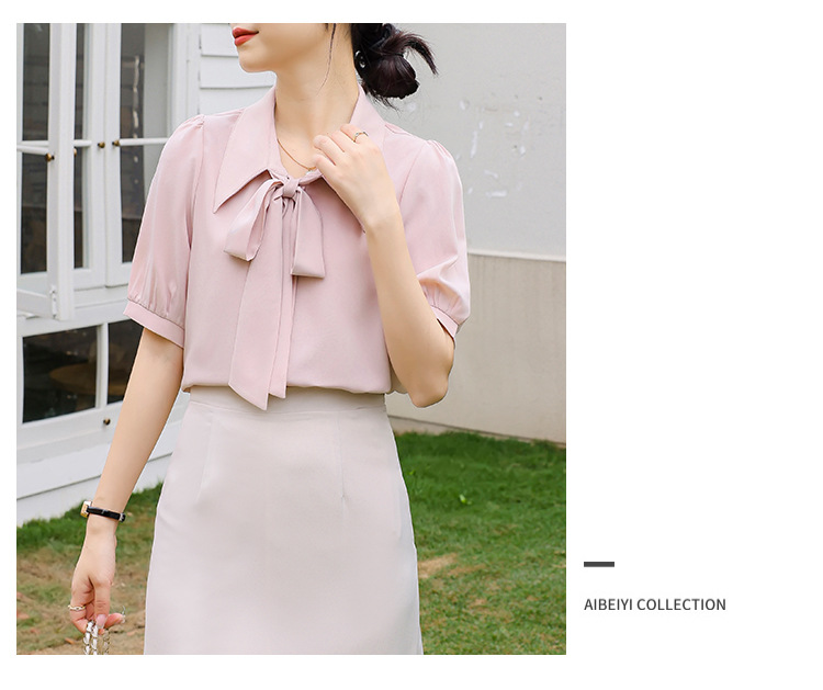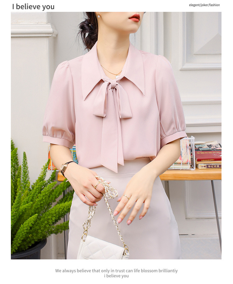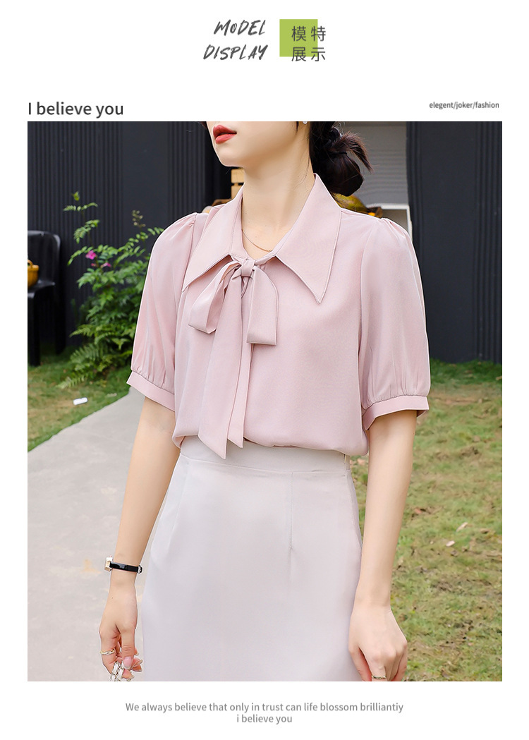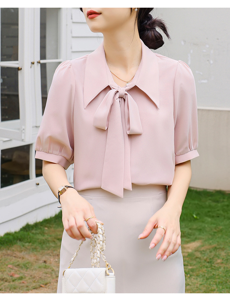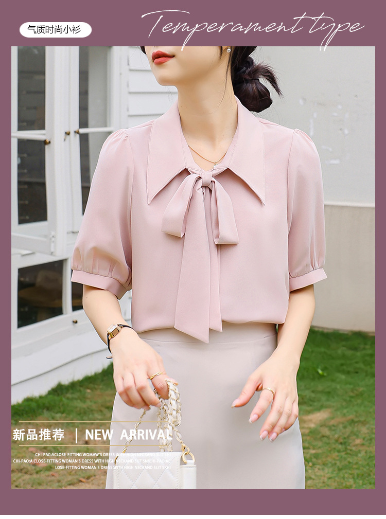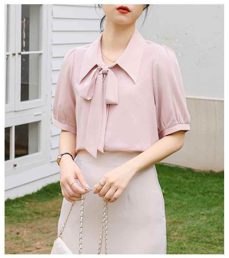 무광택 새틴 핑크 리본 반팔 셔츠 여성용 쉬폰 올 매치 한국식 달콤한 여름 얇은 드레이프 틈새 홍콩 스타일스토어 가기