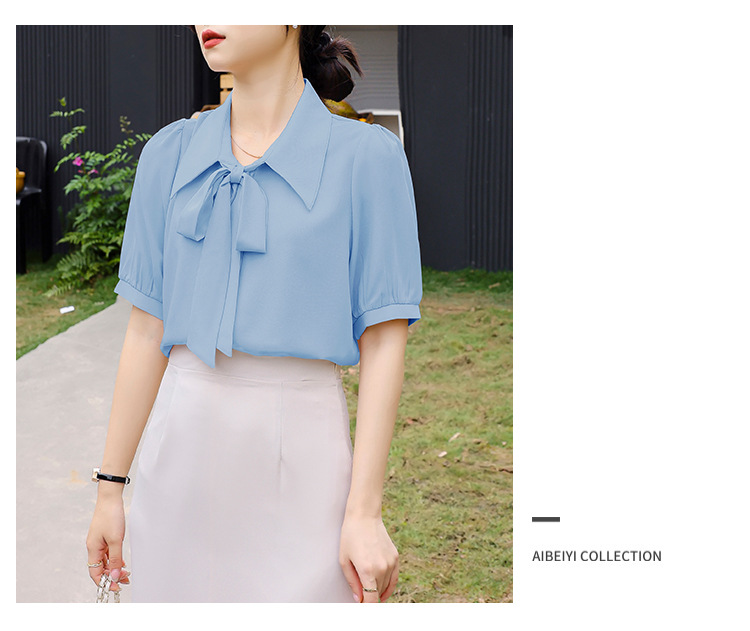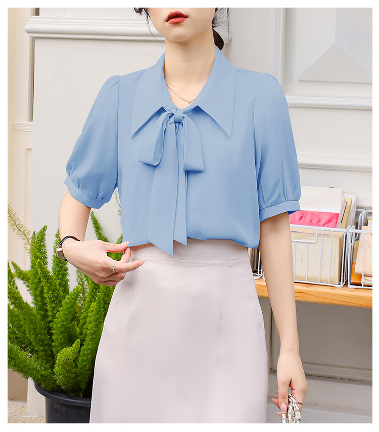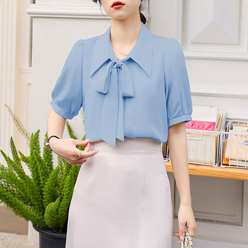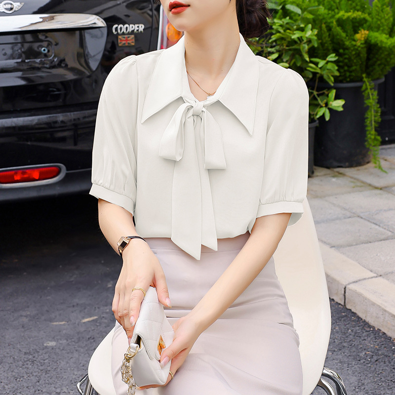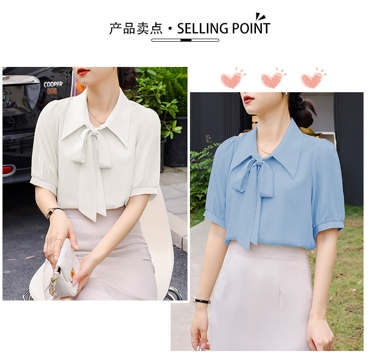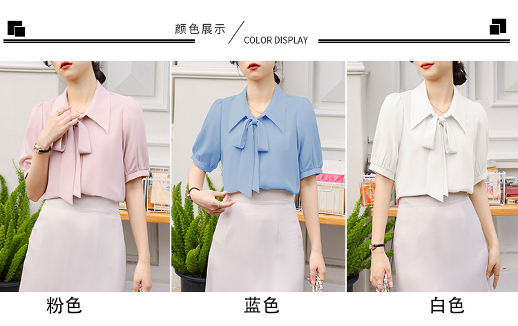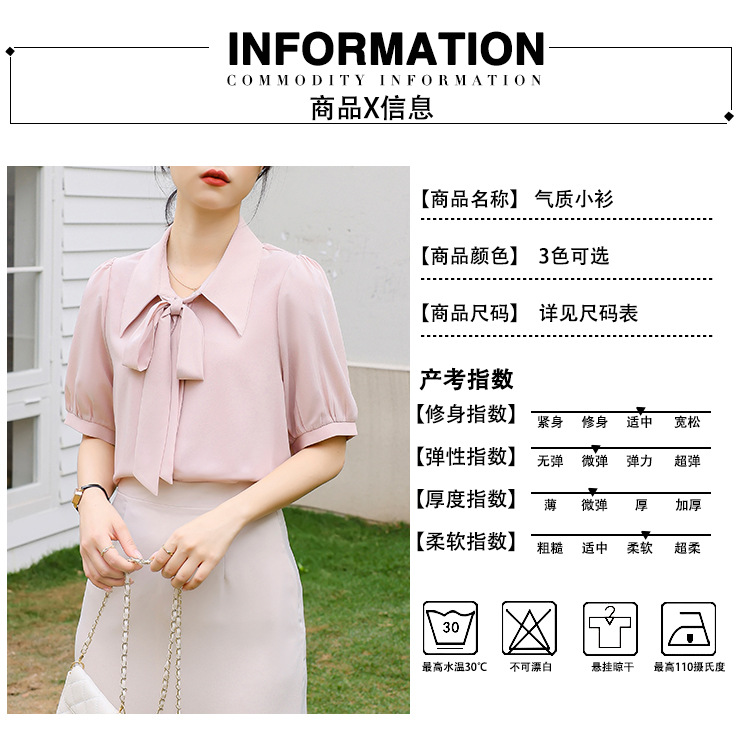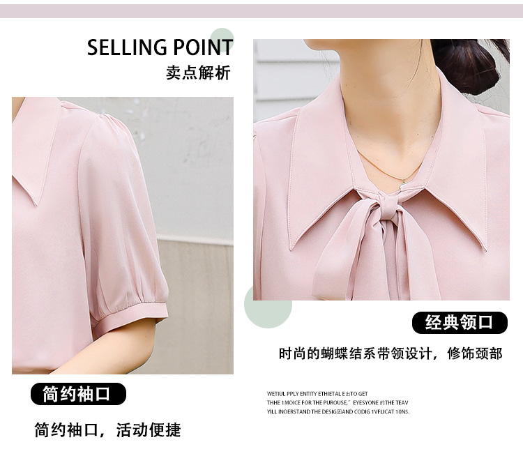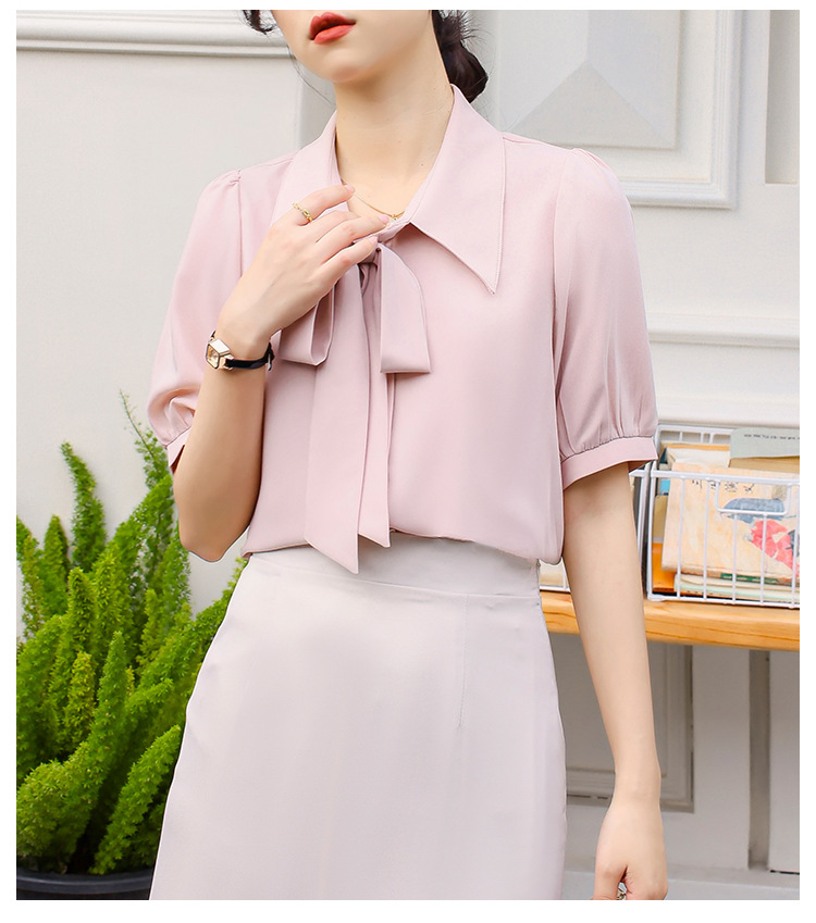 무광택 새틴 핑크 리본 반팔 셔츠 여성용 쉬폰 올 매치 한국식 달콤한 여름 얇은 드레이프 틈새 홍콩 스타일스토어 가기