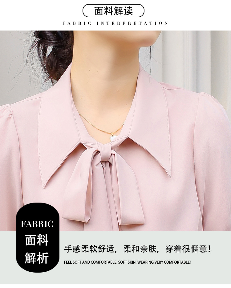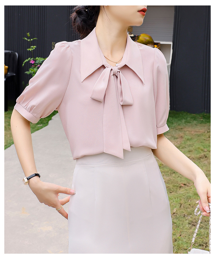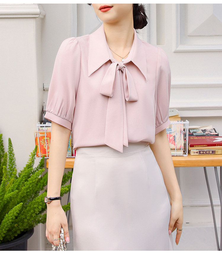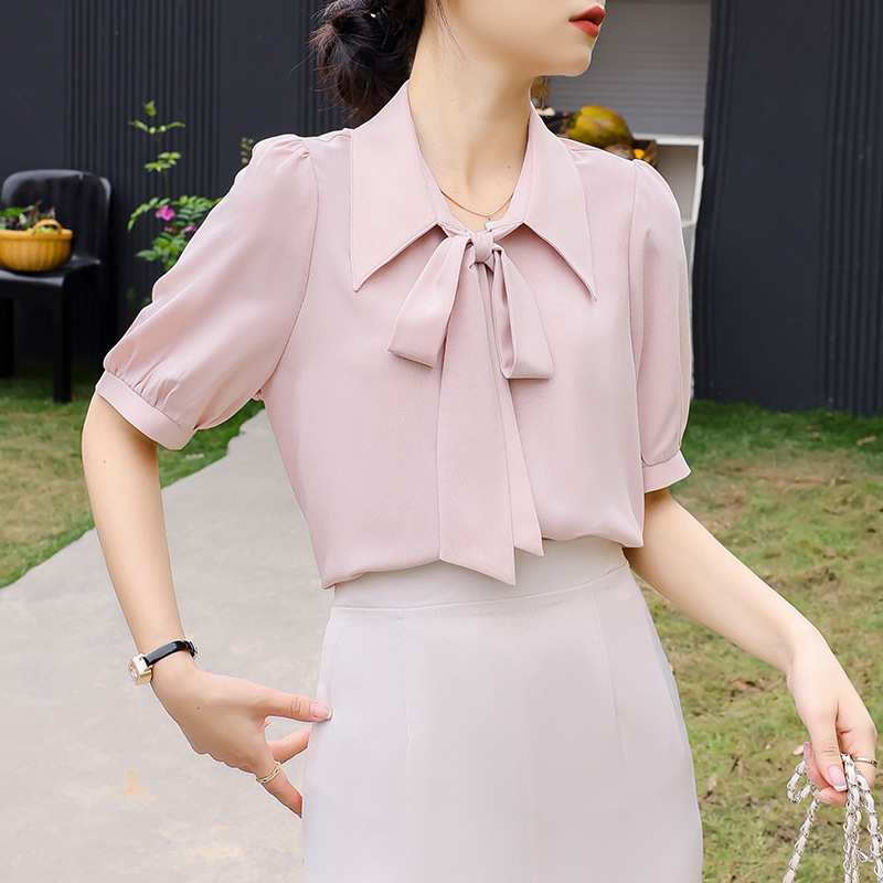 무광택 새틴 핑크 리본 반팔 셔츠 여성용 쉬폰 올 매치 한국식 달콤한 여름 얇은 드레이프 틈새 홍콩 스타일
