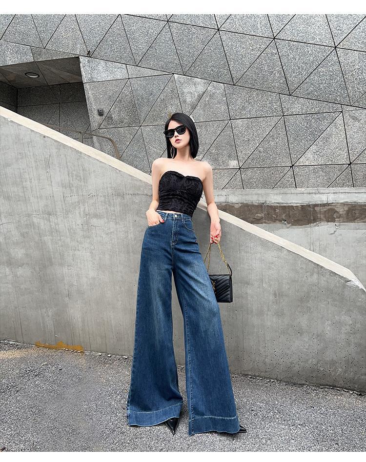 블루 와이드 레그 청바지 여성용 2025 봄과 가을 새로운 높은 허리 고기 커버 마이크로 혼 스트레이트 캐주얼 바지