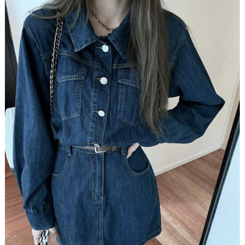 프랑스 레트로 데님 셔츠 원피스 디자인 높은 허리 슬림 핏 짧은 원피스 패션 올 매치 긴 소매 A 라인 원피스스토어 가기