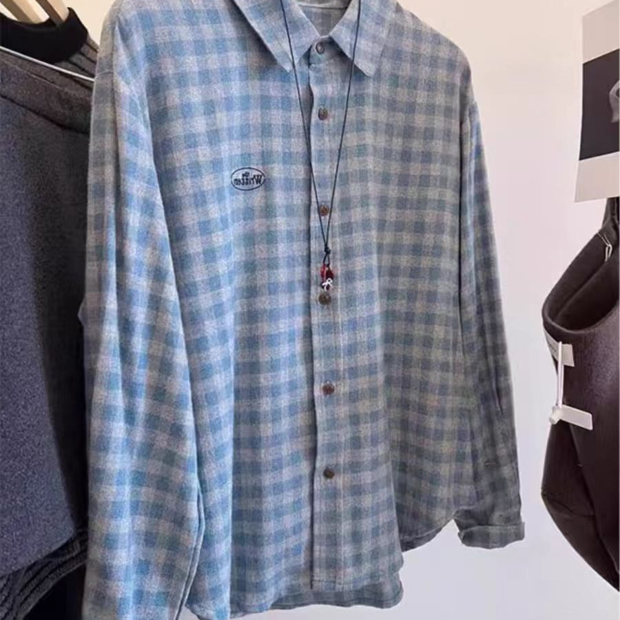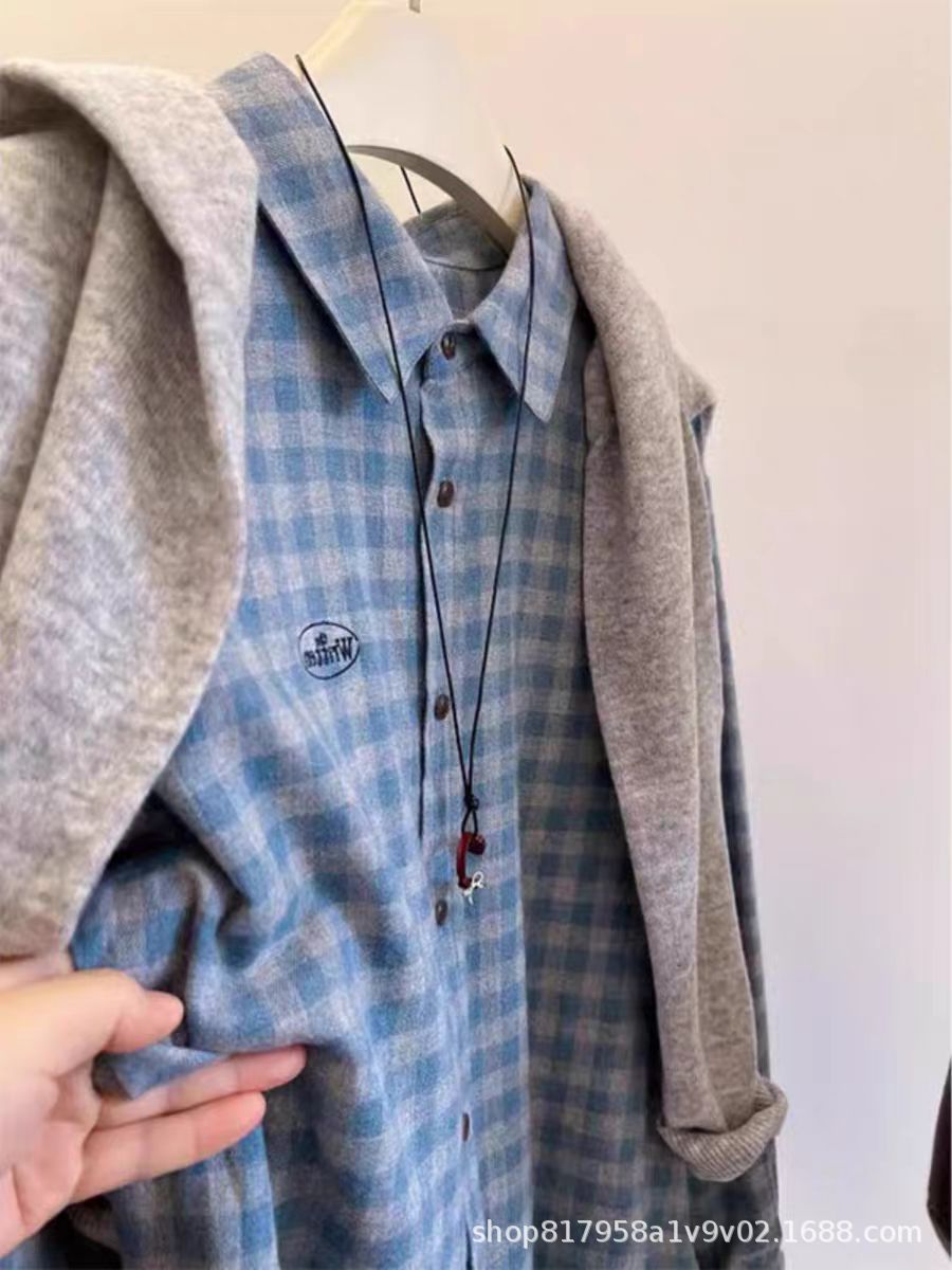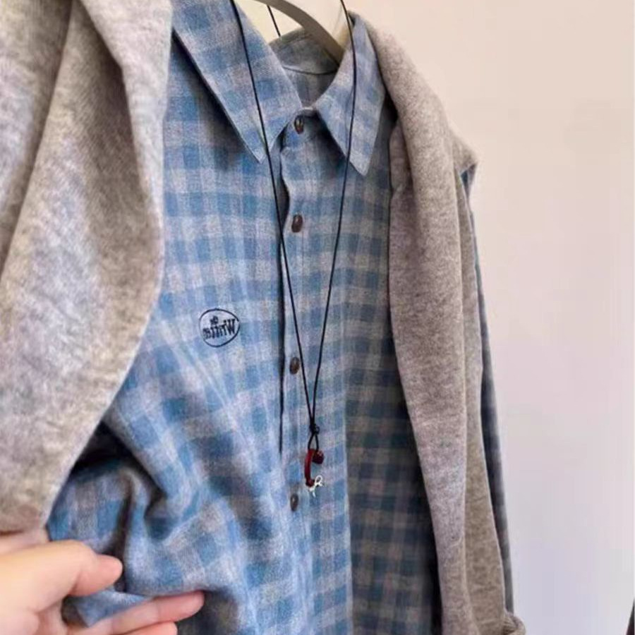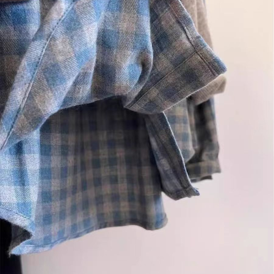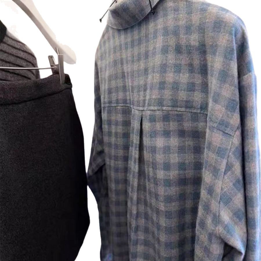 예술적 레트로 그레이 블루 플레이드 셔츠 여성의 나이를 줄이는 한국 스타일 느슨한 셔츠 재킷 여성의 봄과 가을 2025스토어 가기