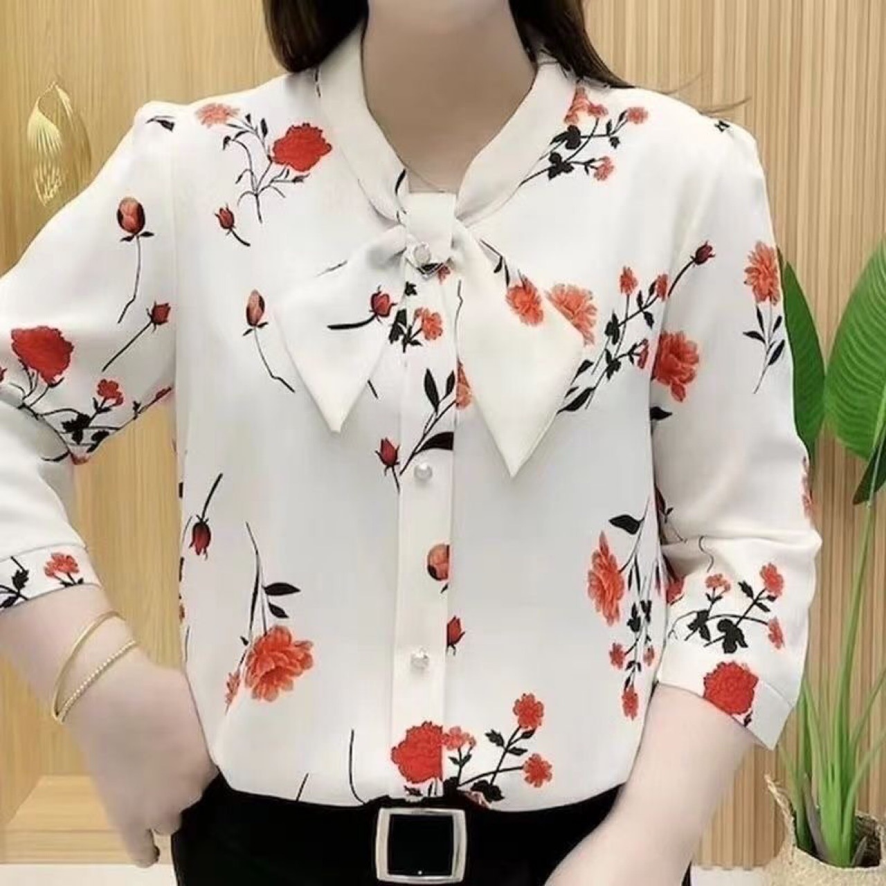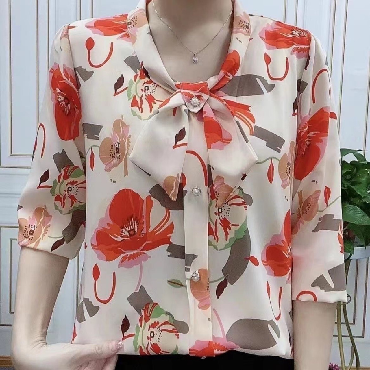 7부 소매 리본 시폰 셔츠 2024 여름 엄마룩 루즈핏 슬림핏 얇은 셔츠 여성 무료배송 플러스 사이즈 여성복