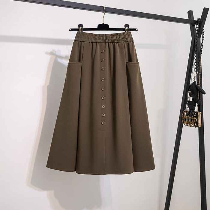 포켓 스커트 여성 2025 봄 새 스타일 슬림 A 라인 스커트 커버 크로스 캐주얼 엘라스토 중간 길이 우산 스커트