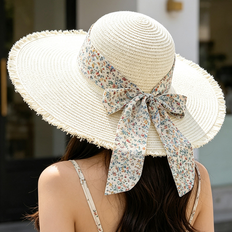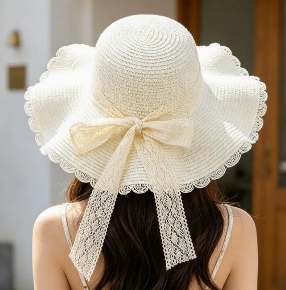 • 플라워 레이스 리본 베이지 (챙 12cm)