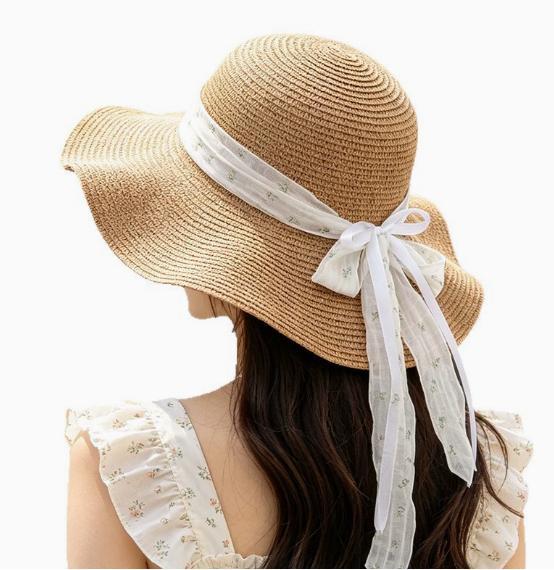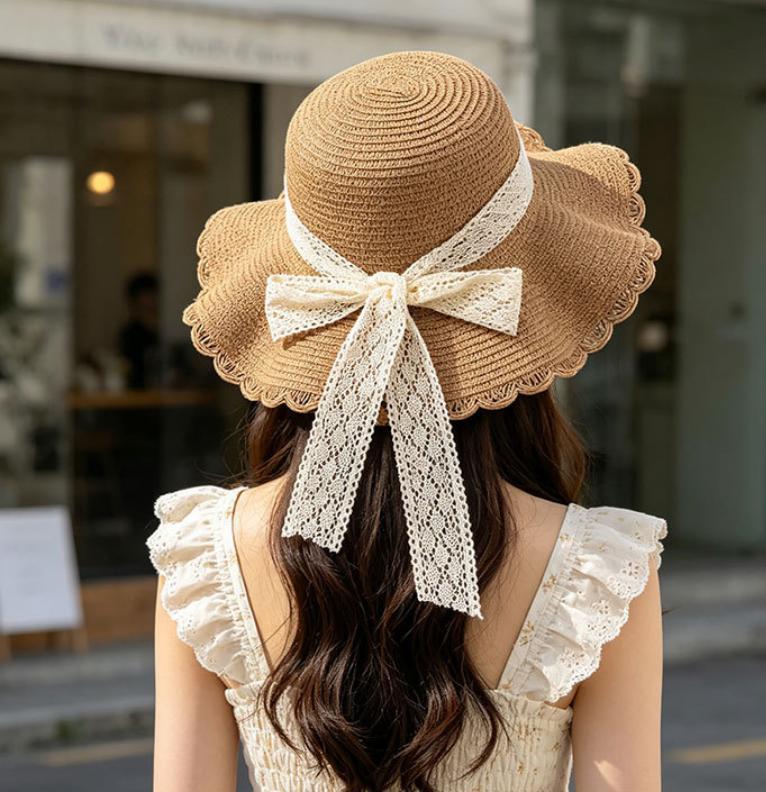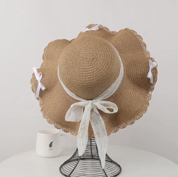 • 019 롱 레이스 진주 리본 밀짚모자 카키 (챙 길이 10cm)