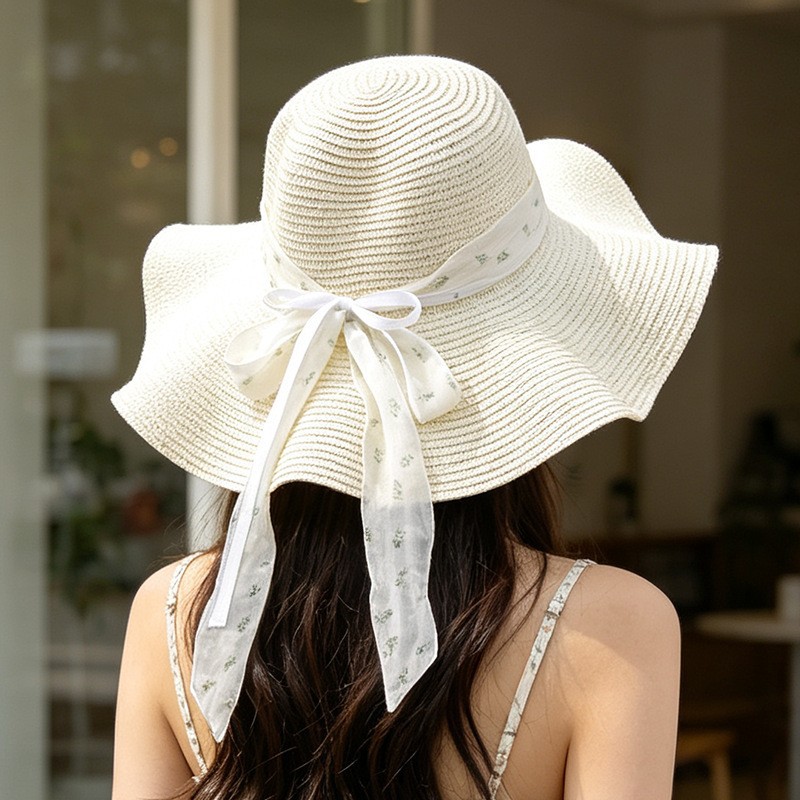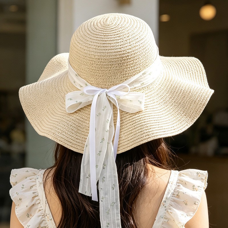 • 019 롱 레이스 진주 리본 밀짚모자 베이지 (챙 10cm)