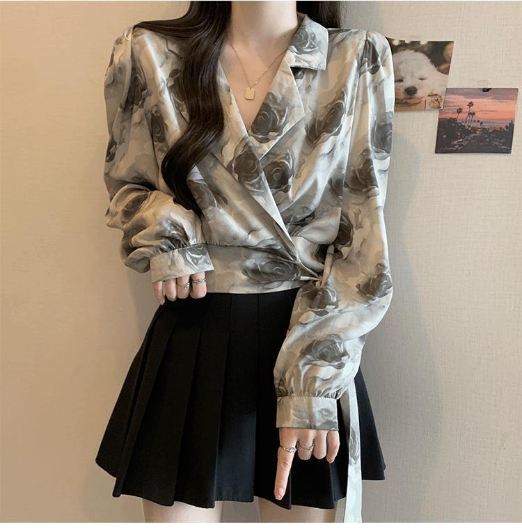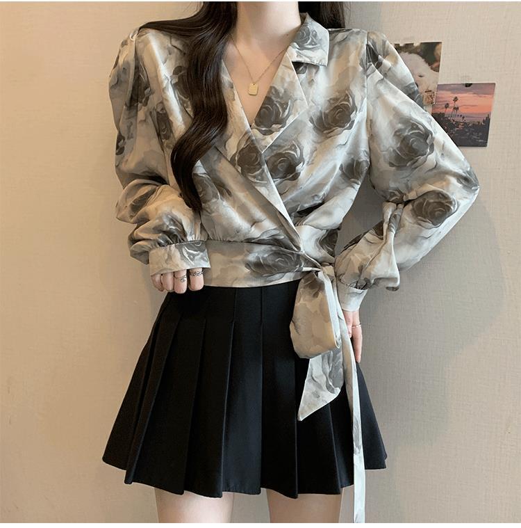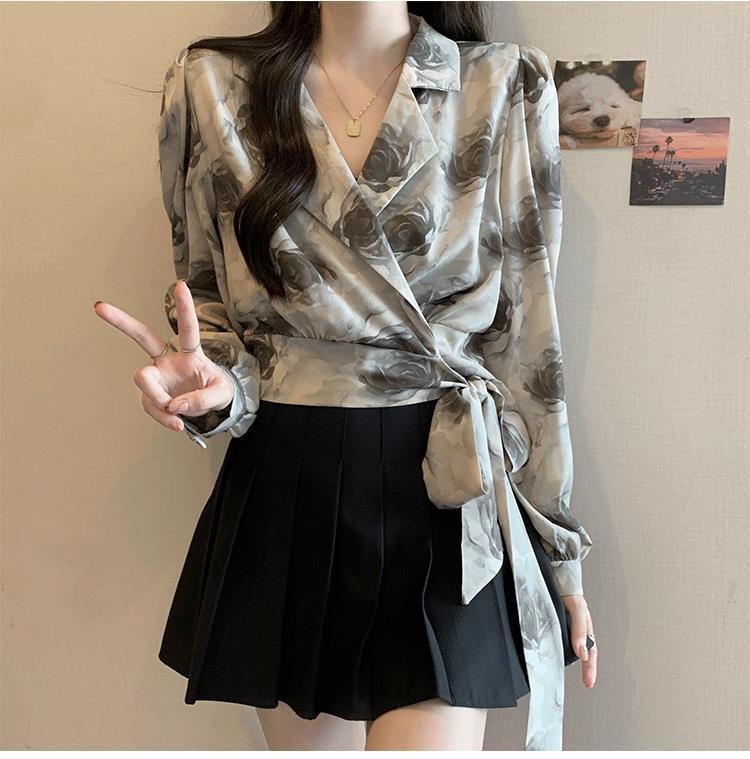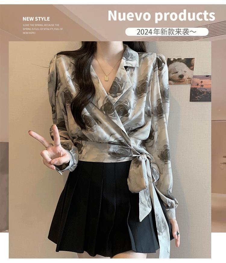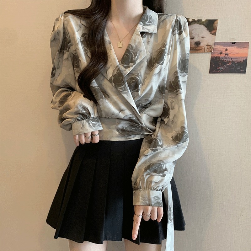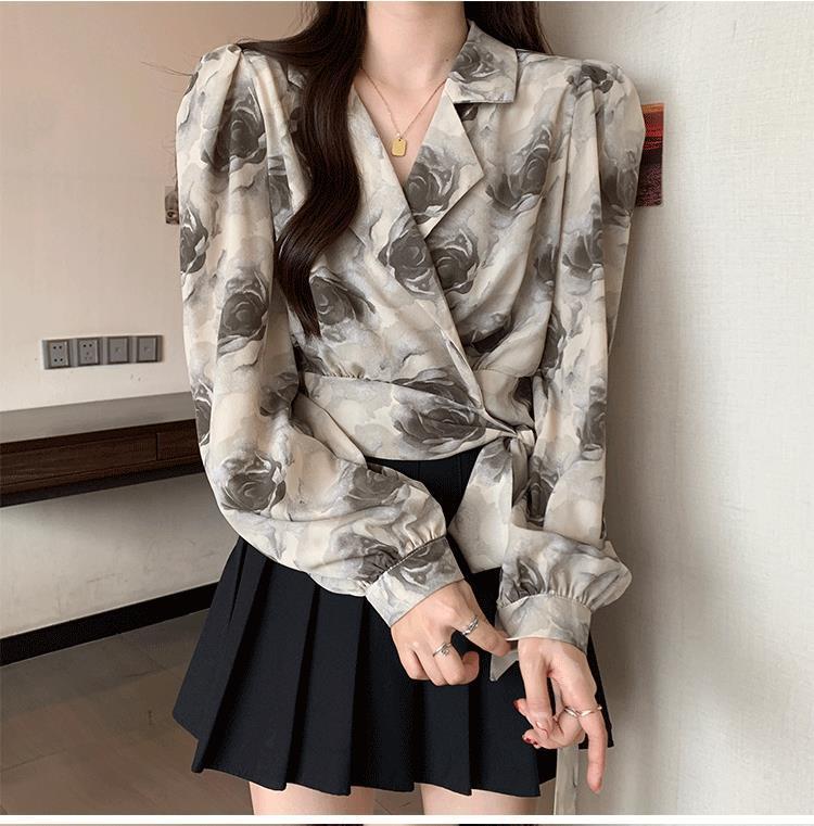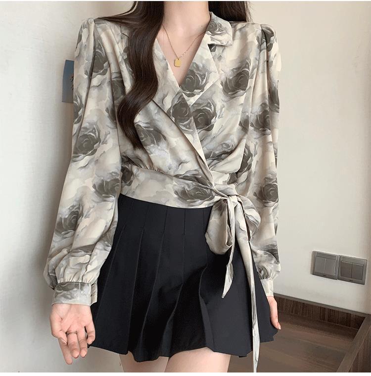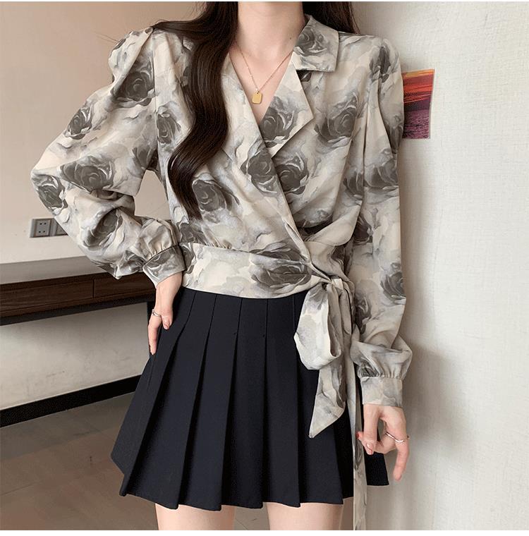 프랑스 스타일의 세트 칼라 스트랩 허리 플로럴 셔츠 여성의 가을 플러스 사이즈 통통녀 복고풍 조명스토어 가기