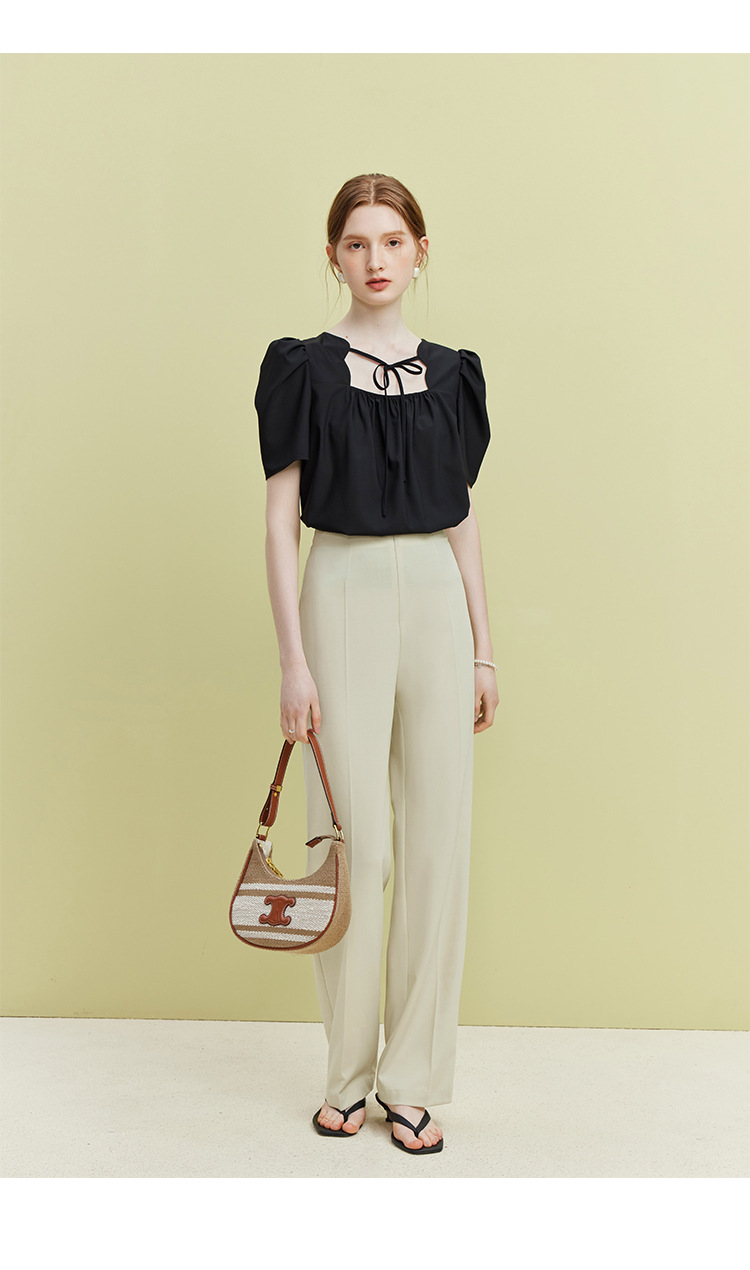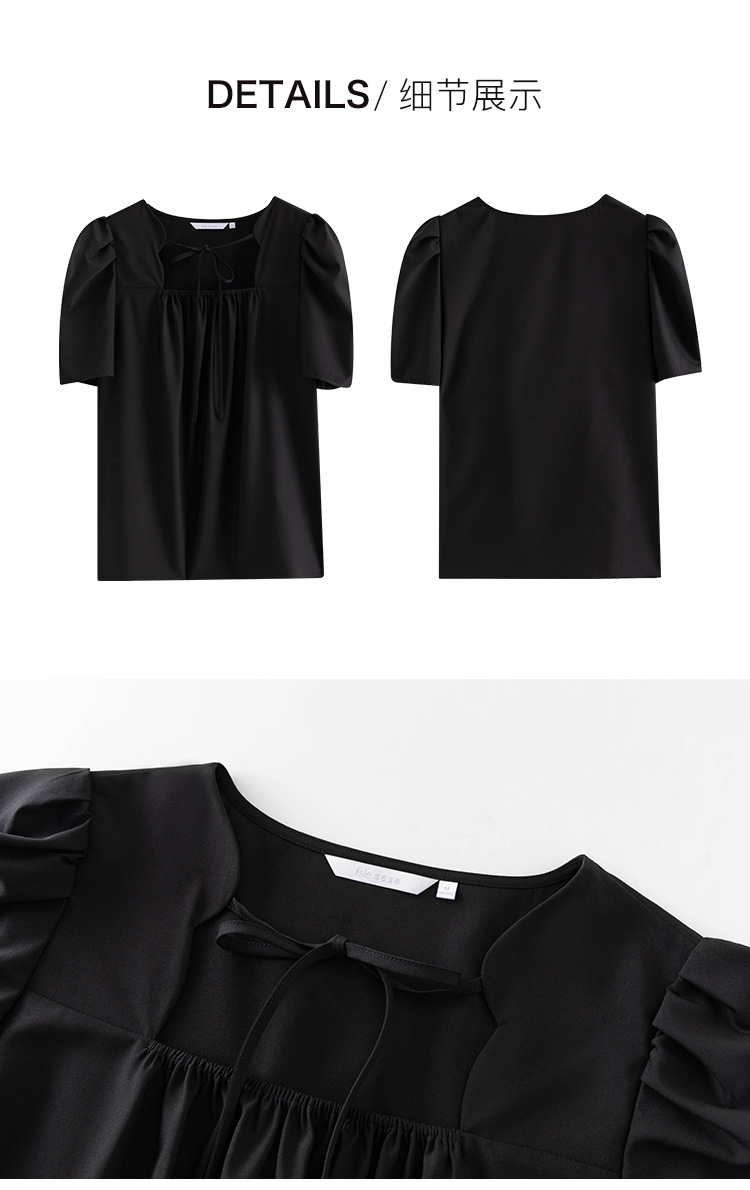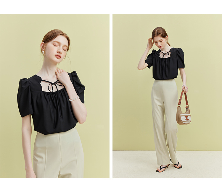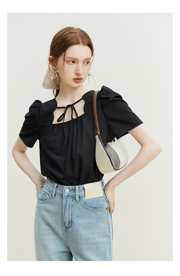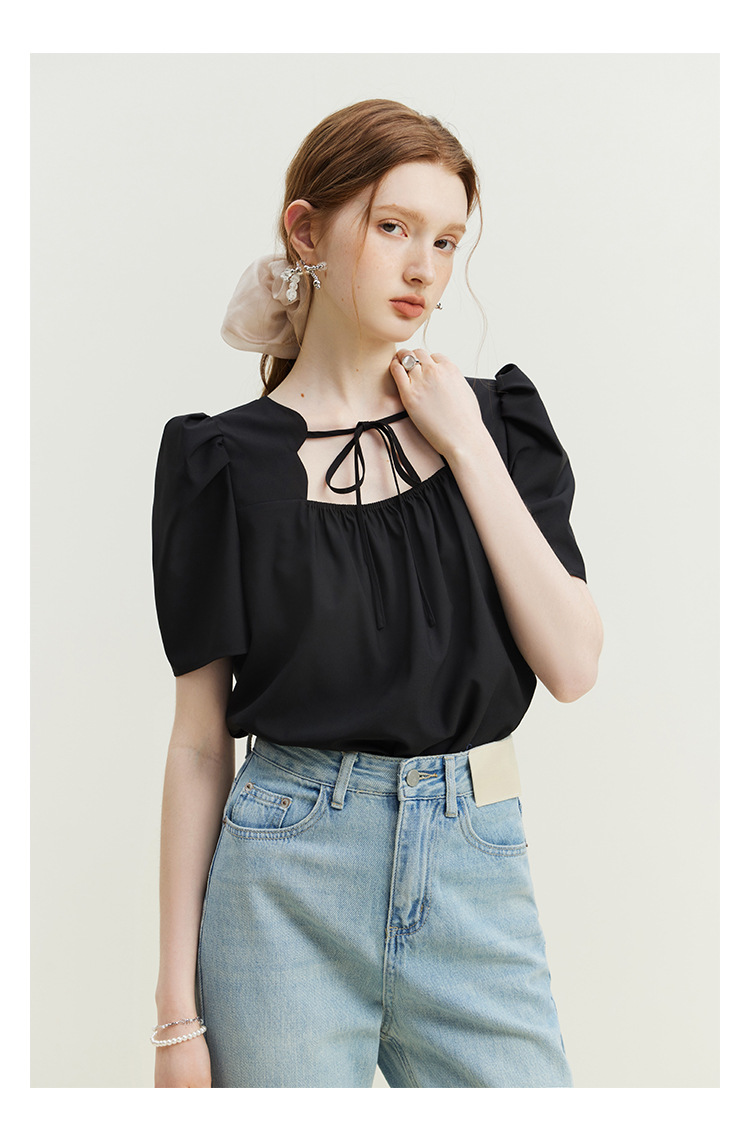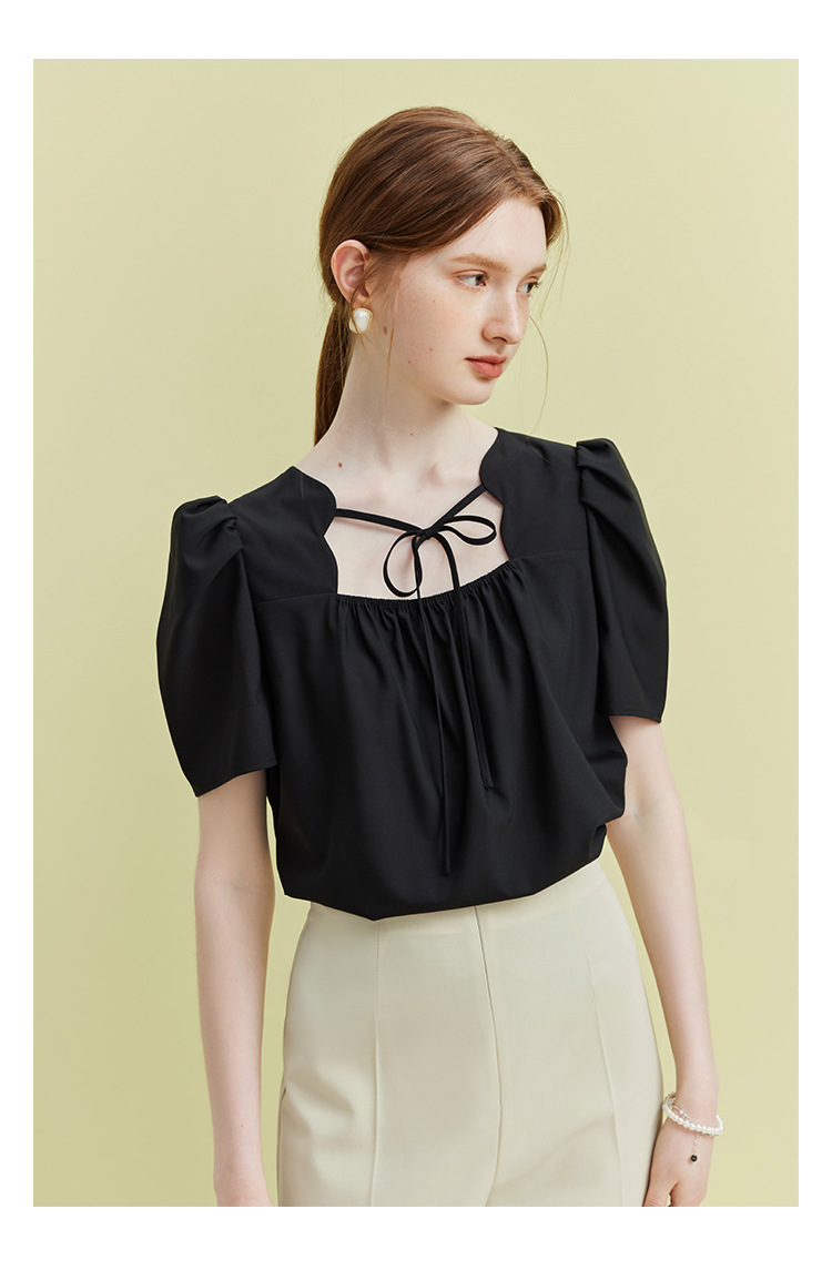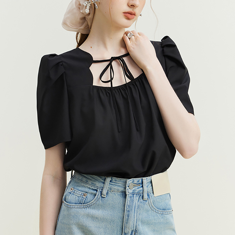 그물 피겨 프렌치 퍼프 소매 반팔 셔츠 여성 디자인 틈새 여름 스퀘어 칼라 탑