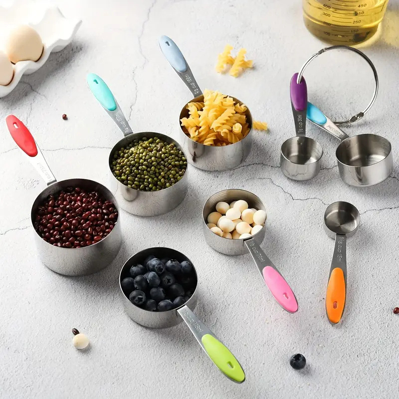 재고 국경 8 조각 스테인레스 스틸 측정 컵 실리콘 핸들 베이킹 측정 가제트 조리기구스토어 가기