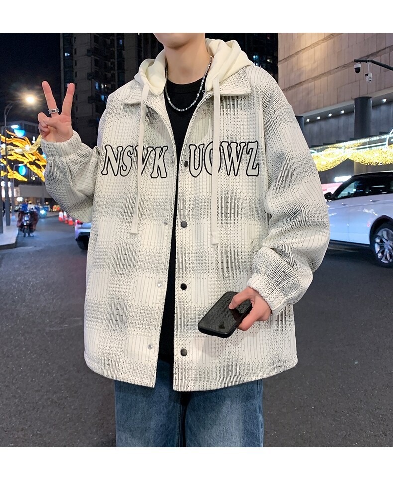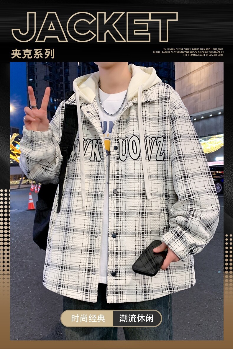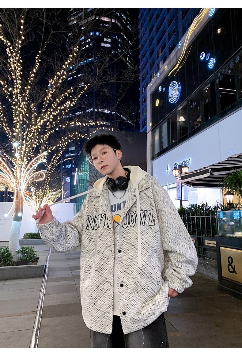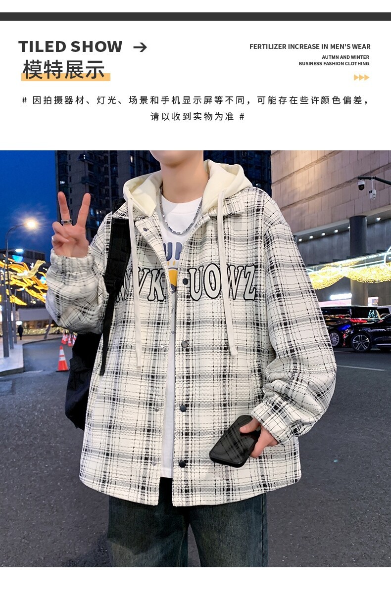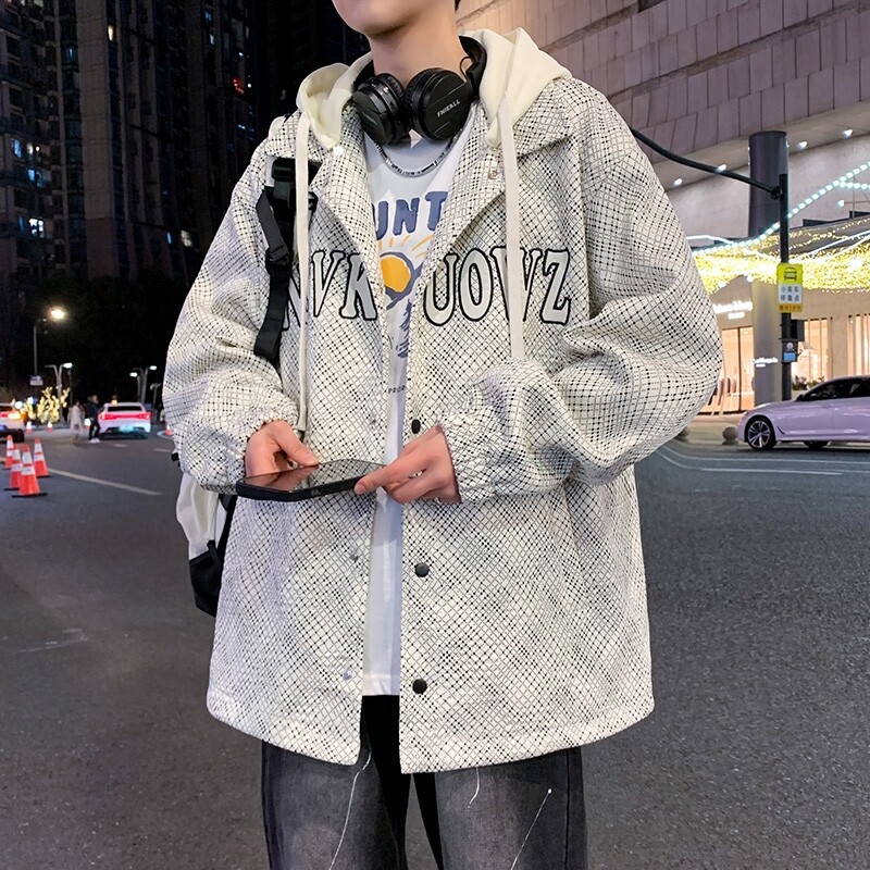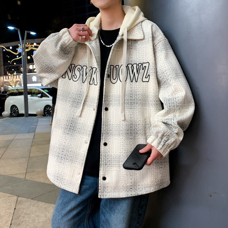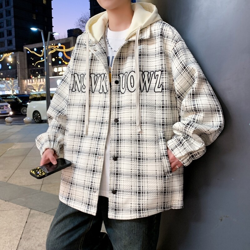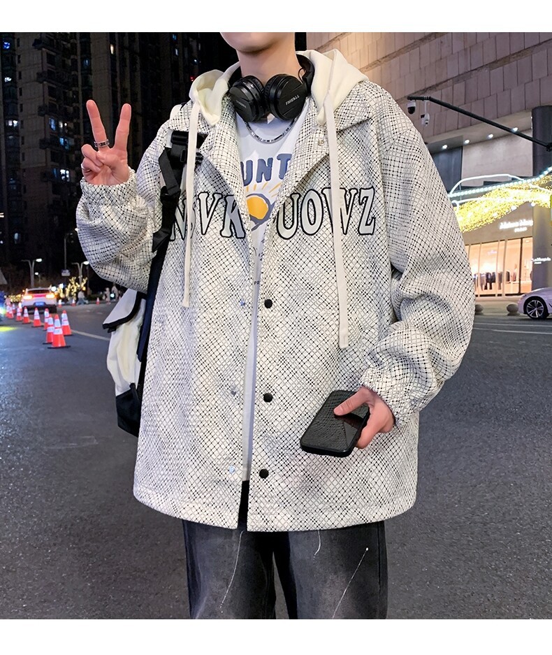 가짜 투피스 후드 재킷 남자의 봄과 가을 2025 새로운 격자 무늬 재킷 남자의 유행 브랜드 청소년 홍콩 스타일 옷스토어 가기