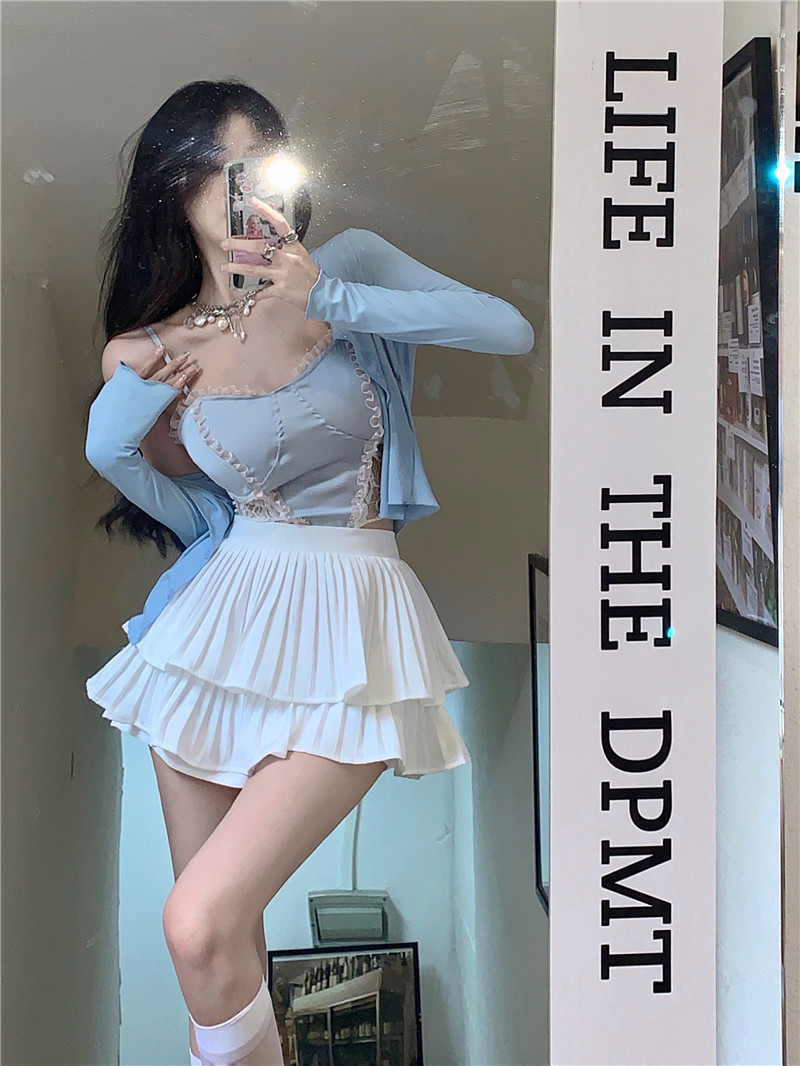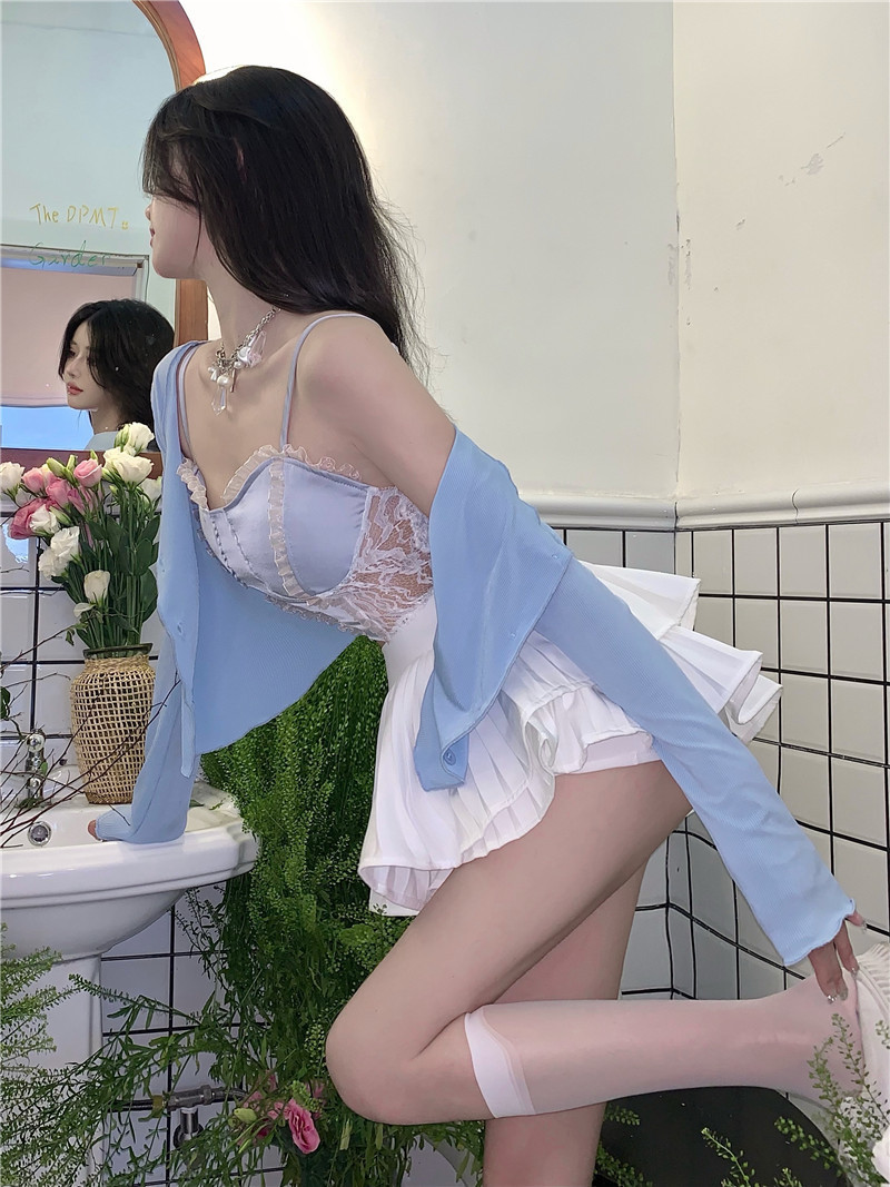 싱글/세트 섹시한 스파이스 소녀 레이스 카미솔 여성 여름 탑 카디건 코트 높은 허리 스커트 여성스토어 가기