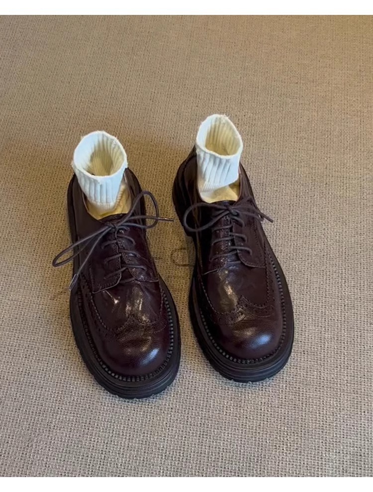 양가죽 버전 ~ 레트로 블랙 고급 브로그 작은 가죽 신발 여성용 레이스 업 두꺼운 밑창 가죽 로퍼 싱글 슈즈