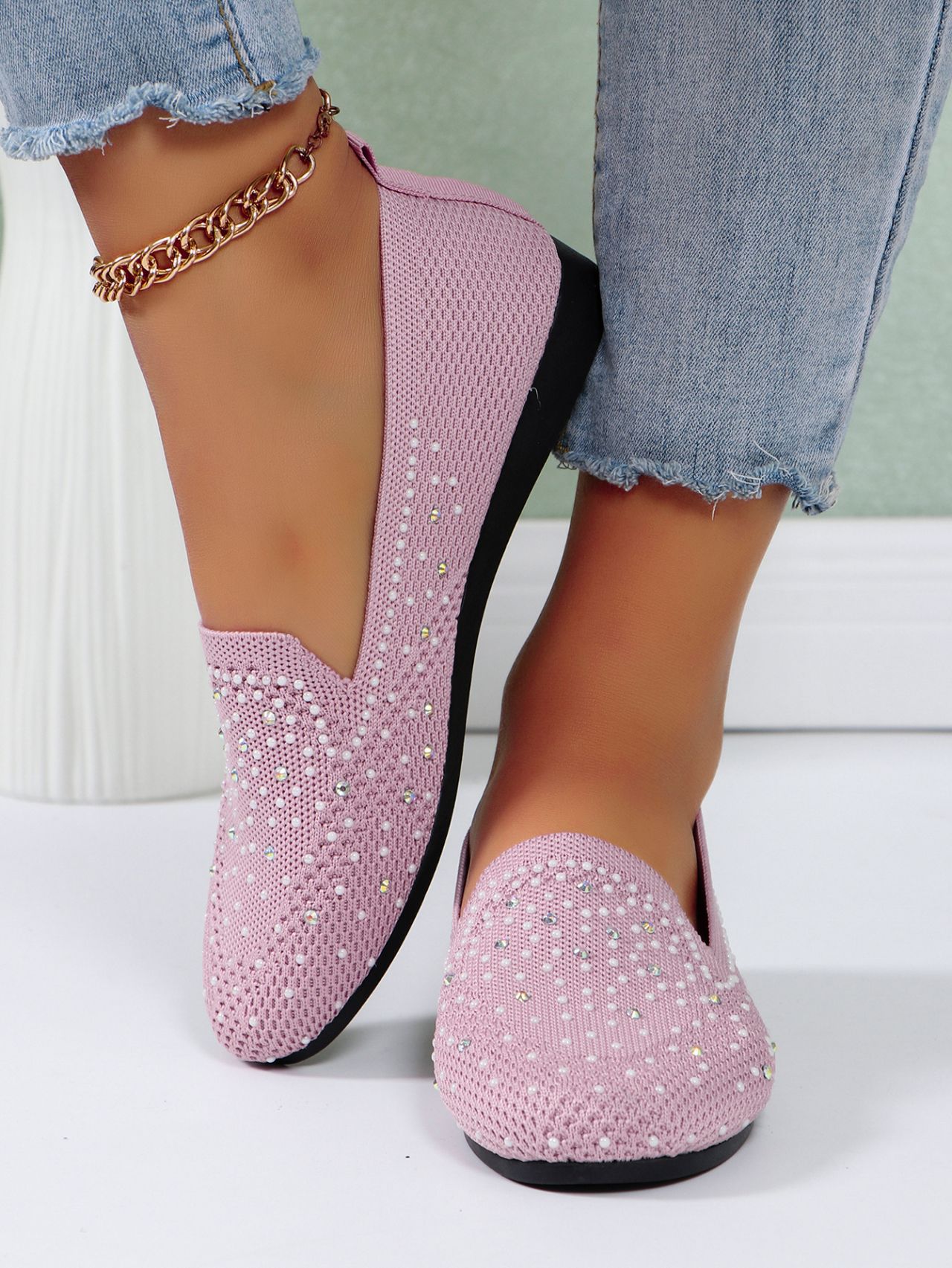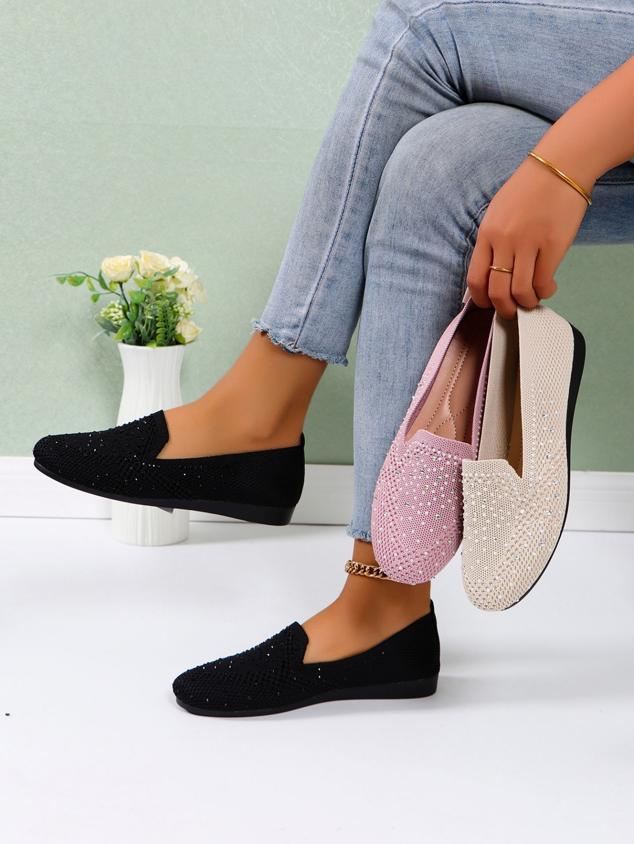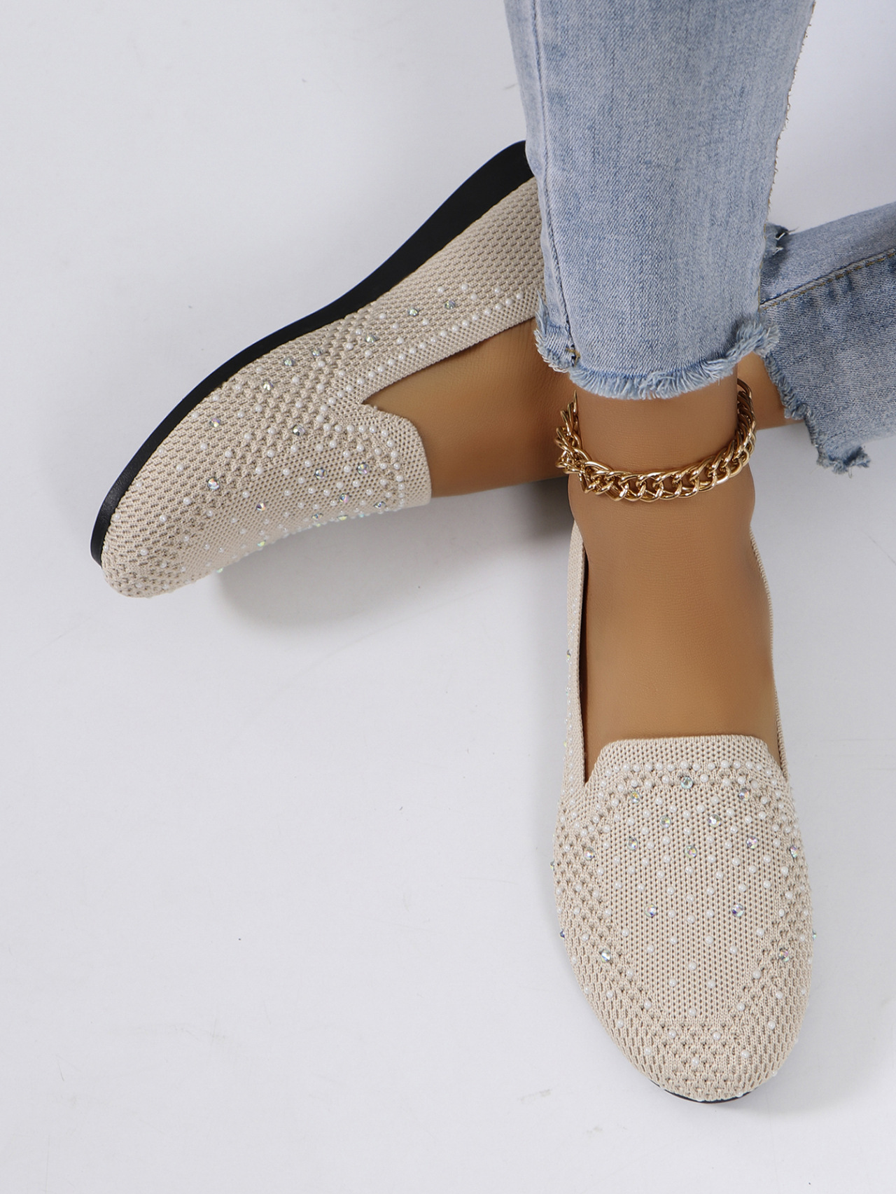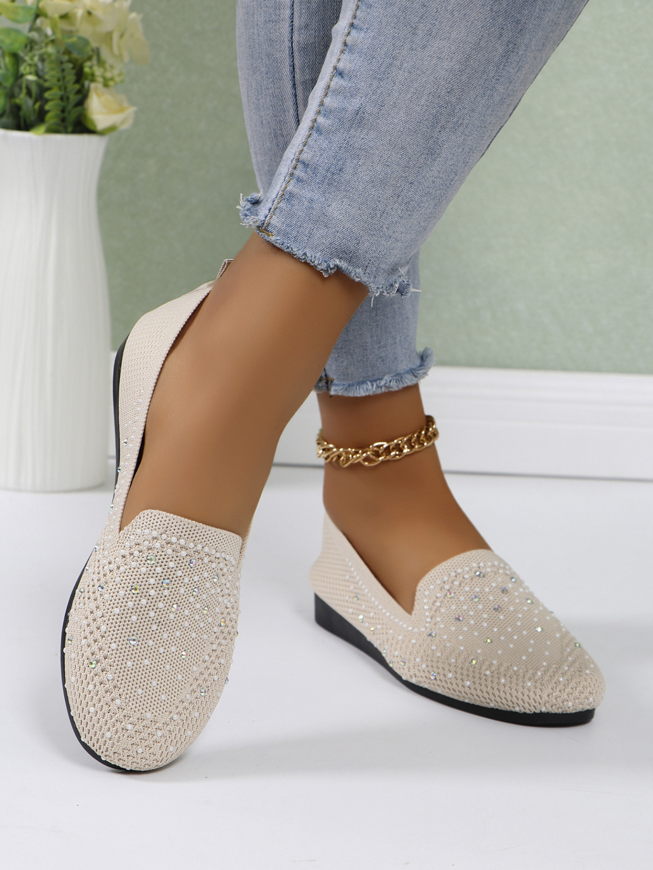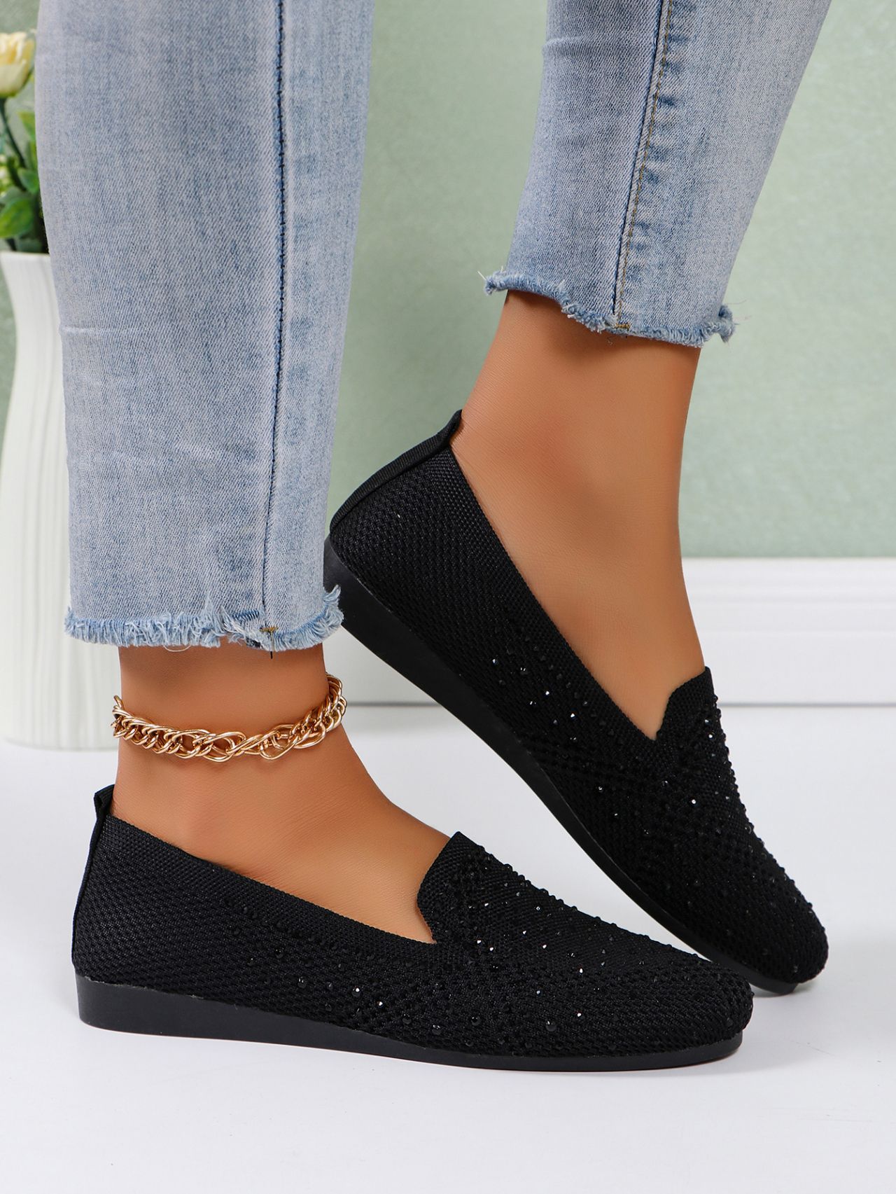 국경 간 플러스 사이즈 캐주얼 플랫 신발 여성 2025 봄 드릴 얕은 부드러운 신발 여성 새로운 단색 메쉬스토어 가기