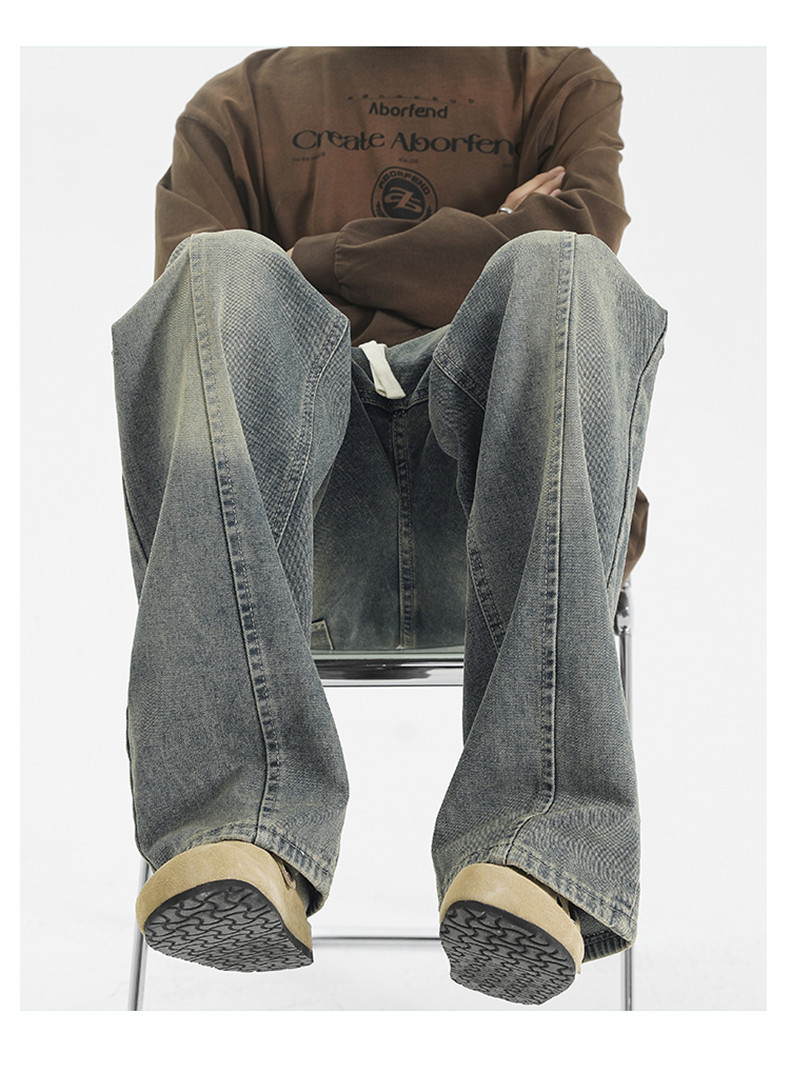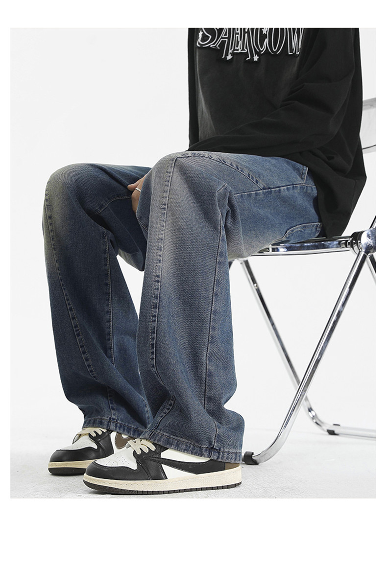 NASA 세탁 빈티지 데님 바지 남자 봄과 가을 느슨한 스트레이트 스트리트 힙합 드로스트링 캐주얼 롱 바지스토어 가기