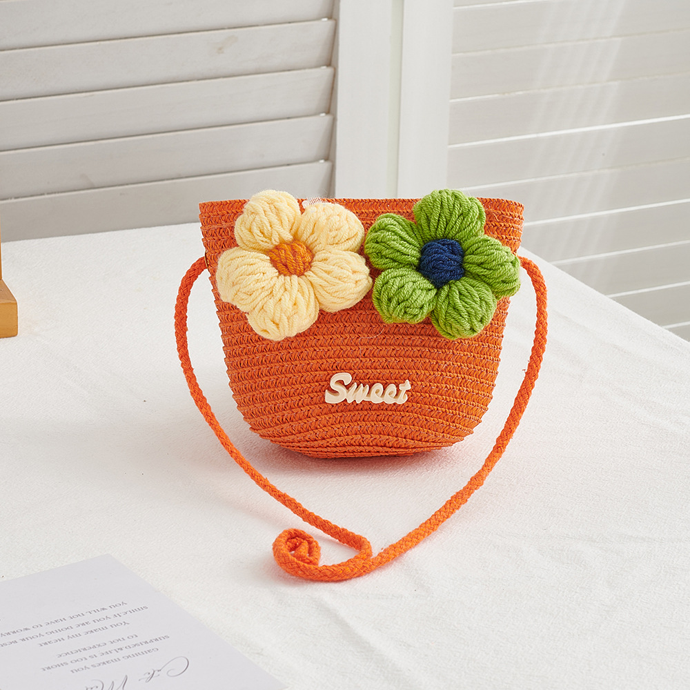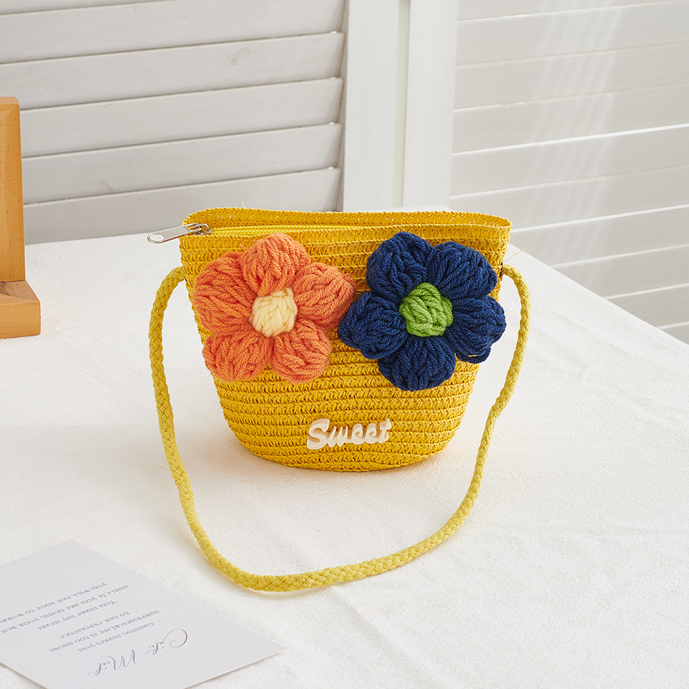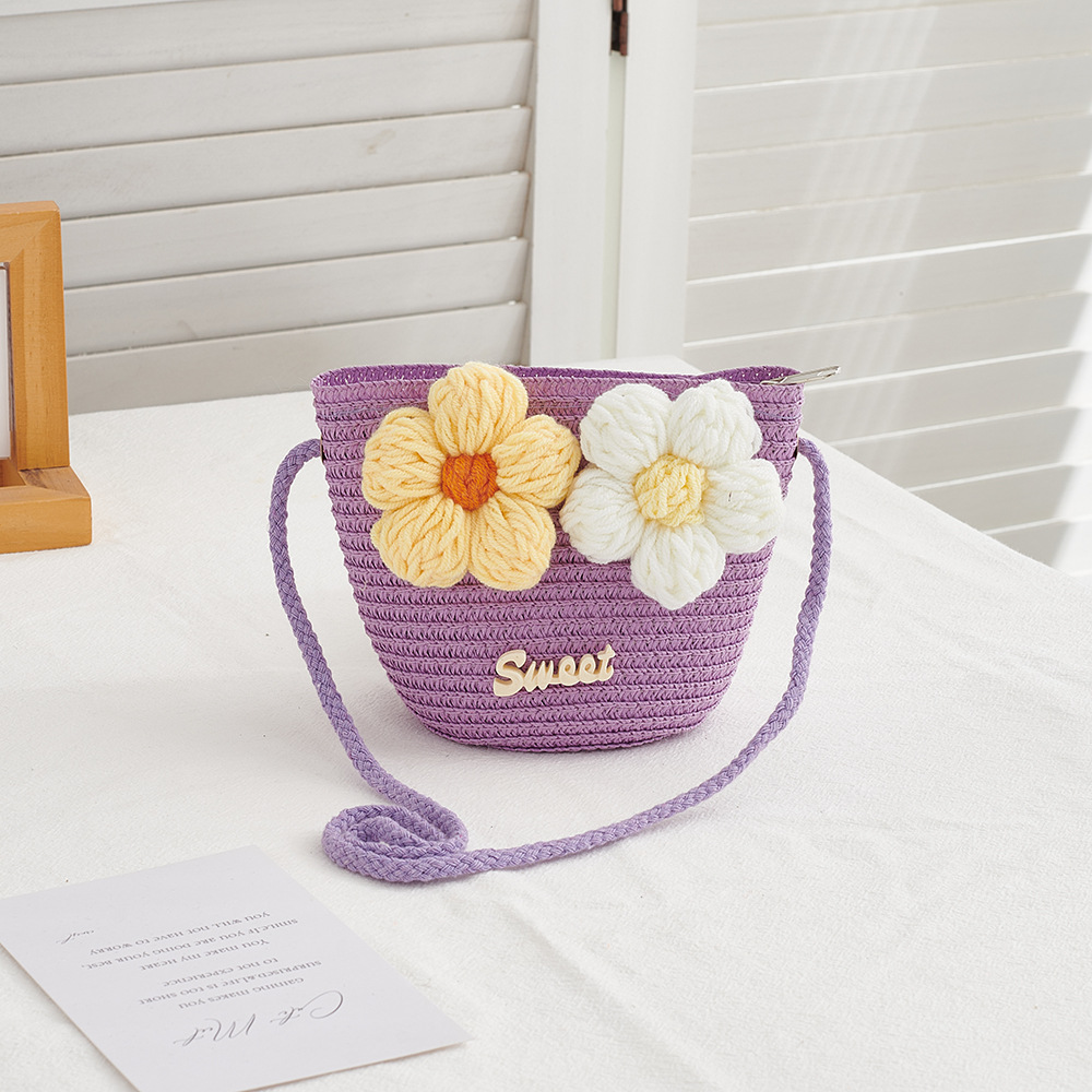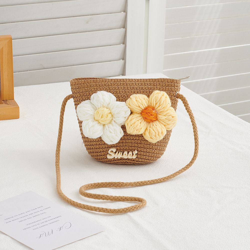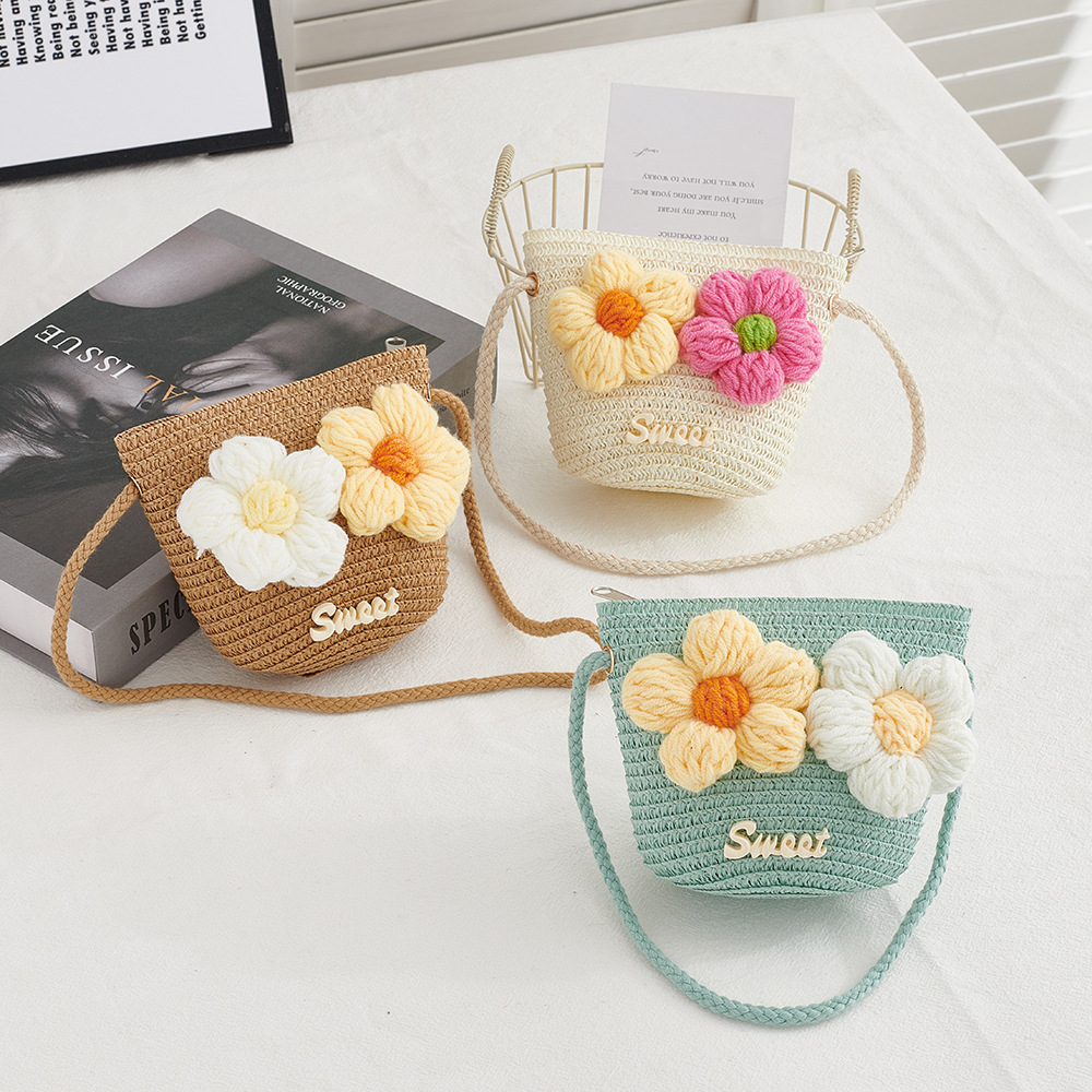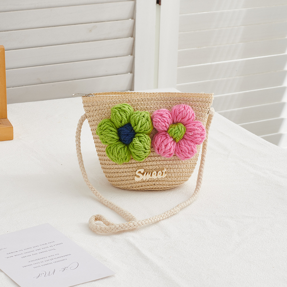 한국 스타일 봄과 여름 꽃 밀짚 작은 가방 짠 어린이 야외 여행 작은 사첼 동전 지갑 휴대 전화 가방