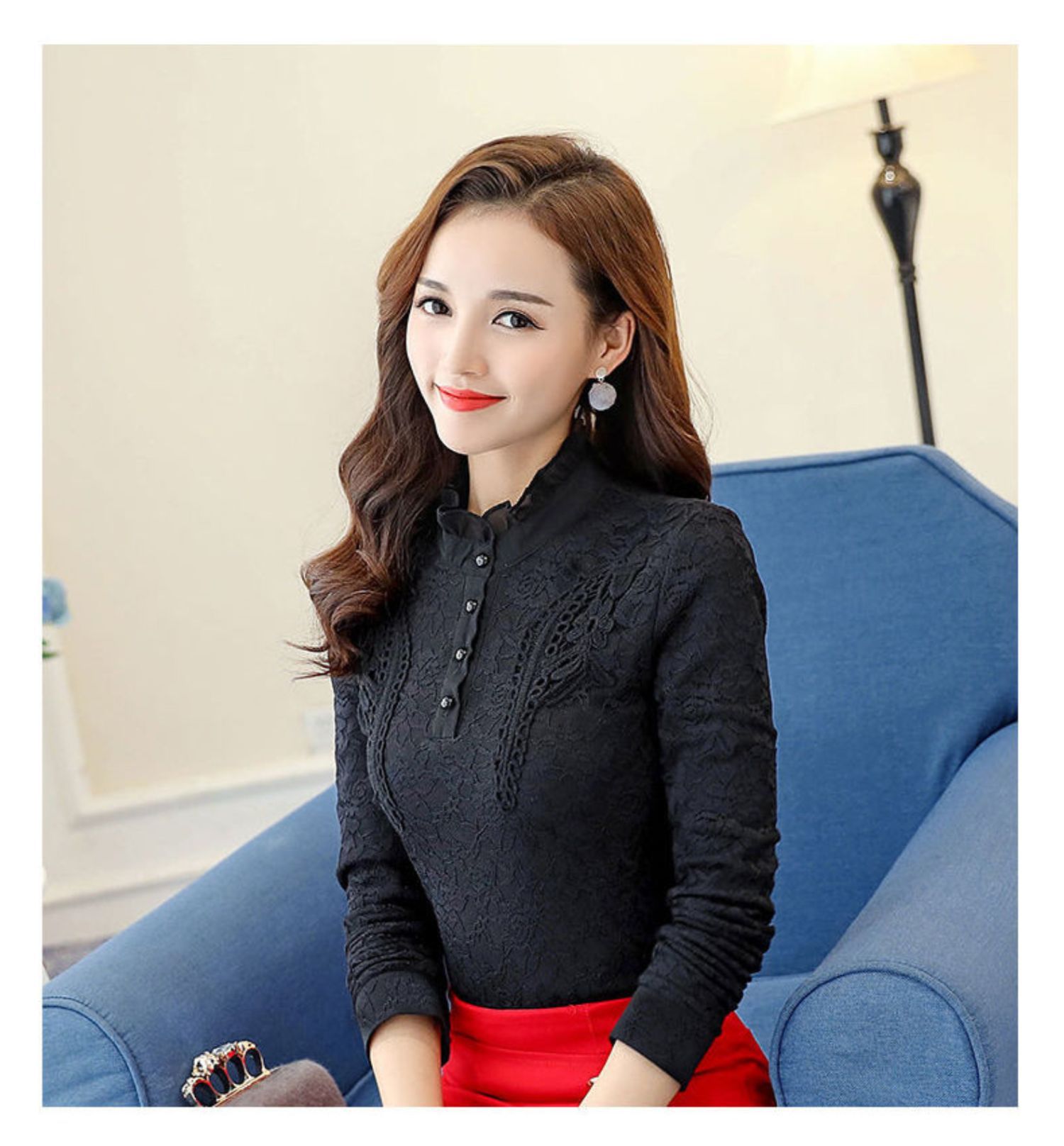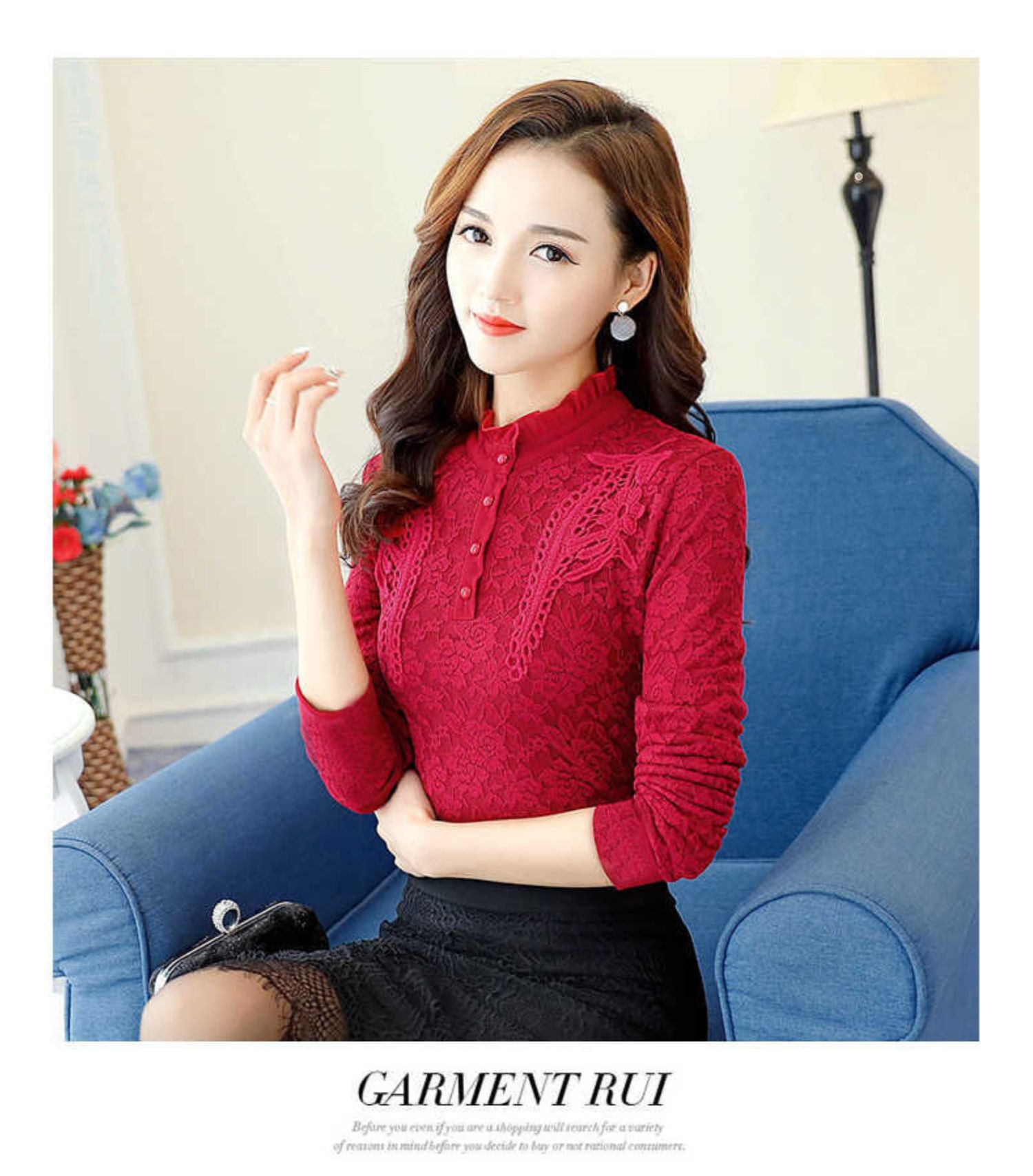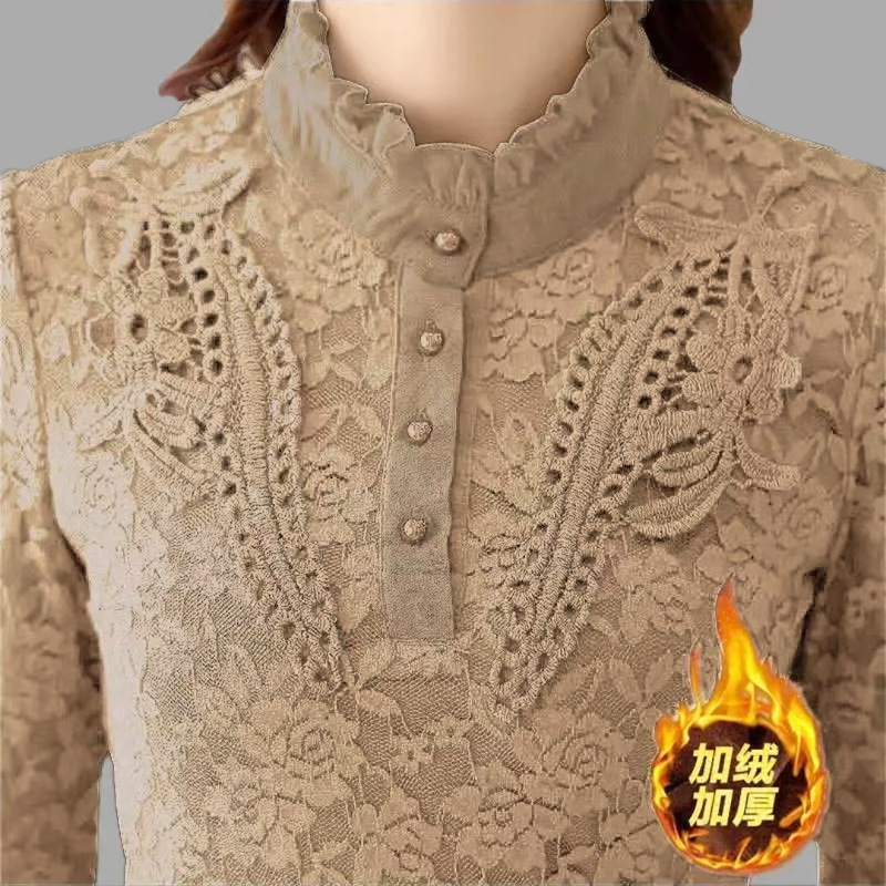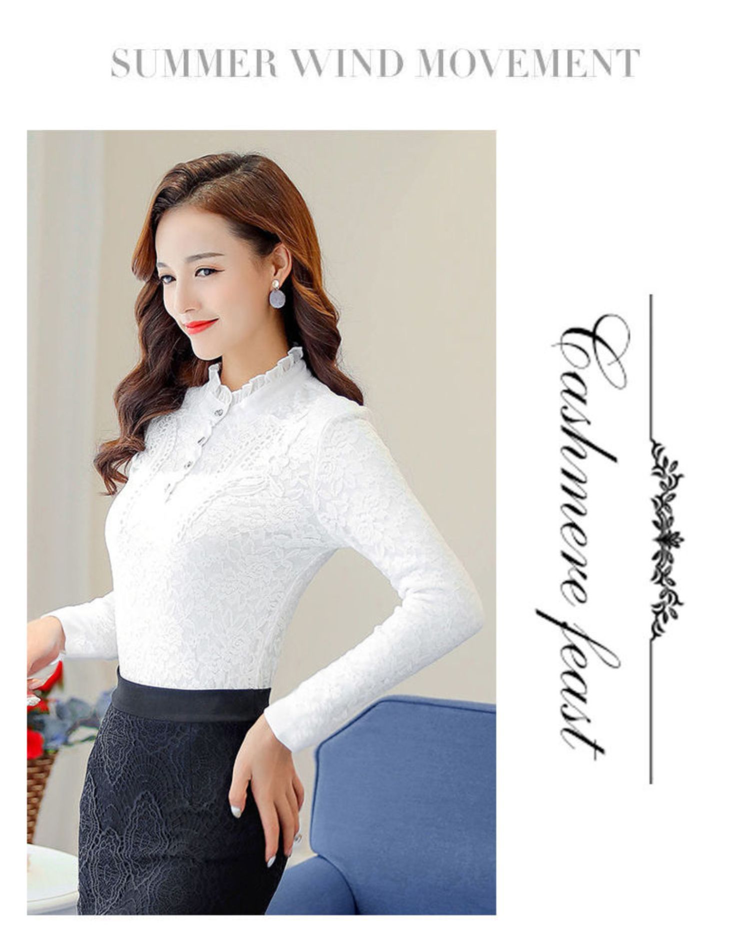기모 두꺼운 가을과 겨울 새로운베이스 셔츠 여성용 유행 레이스 셔츠 내부 플러스 사이즈 슬림핏 슬리밍 탑 셔츠