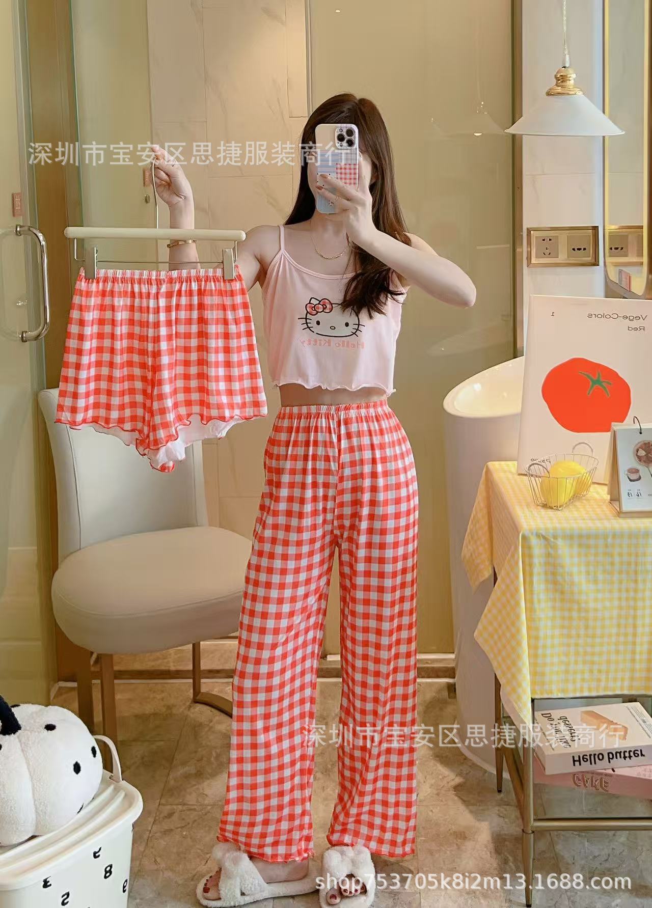 새로운 유럽과 미국의 국경 간 여성 잠옷 슬링 3 피스 세트 아마존 대외 무역 동남아시아 여름 홈 의류 잠옷