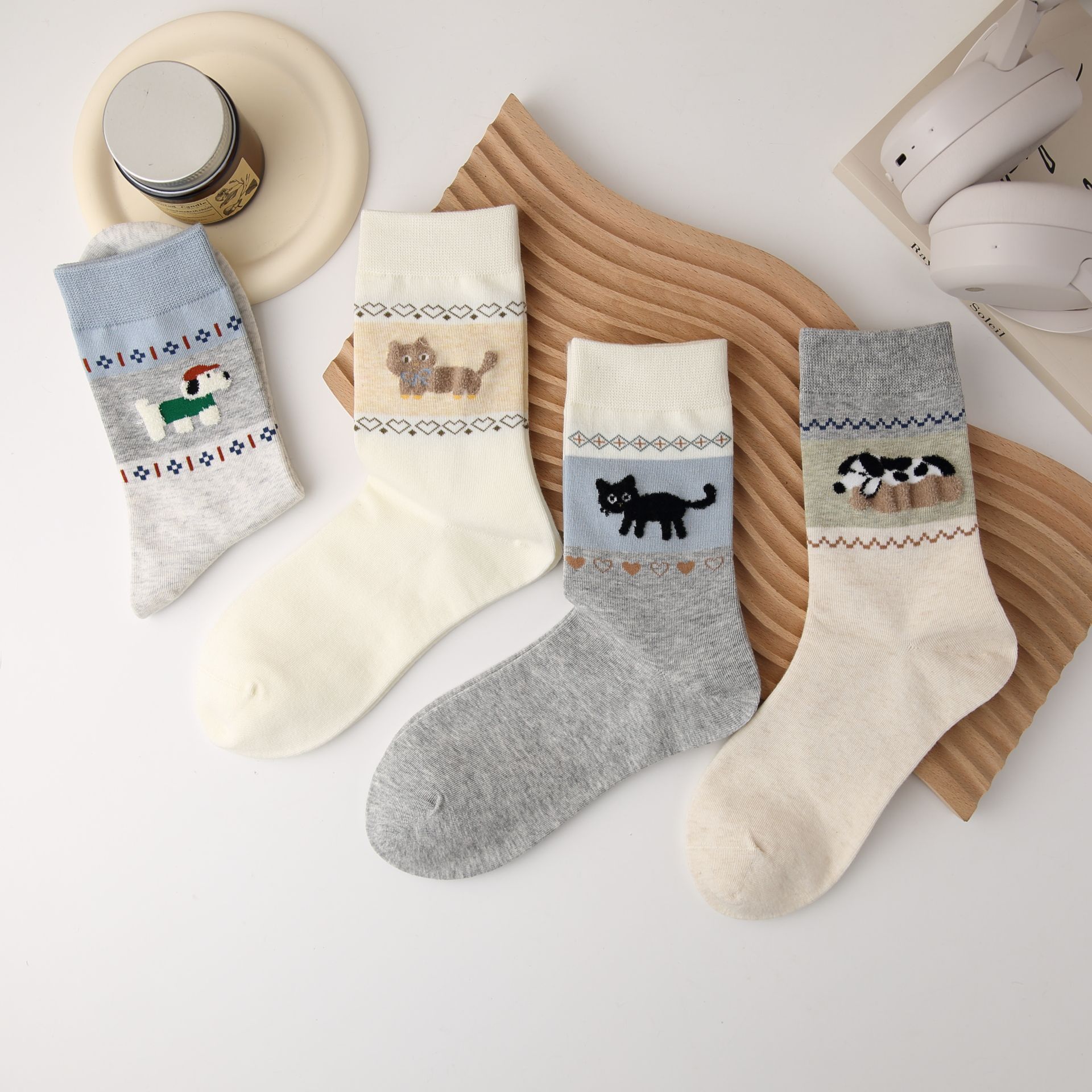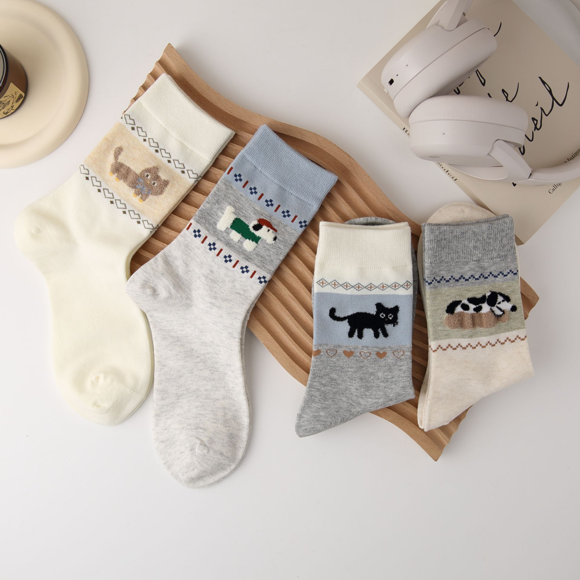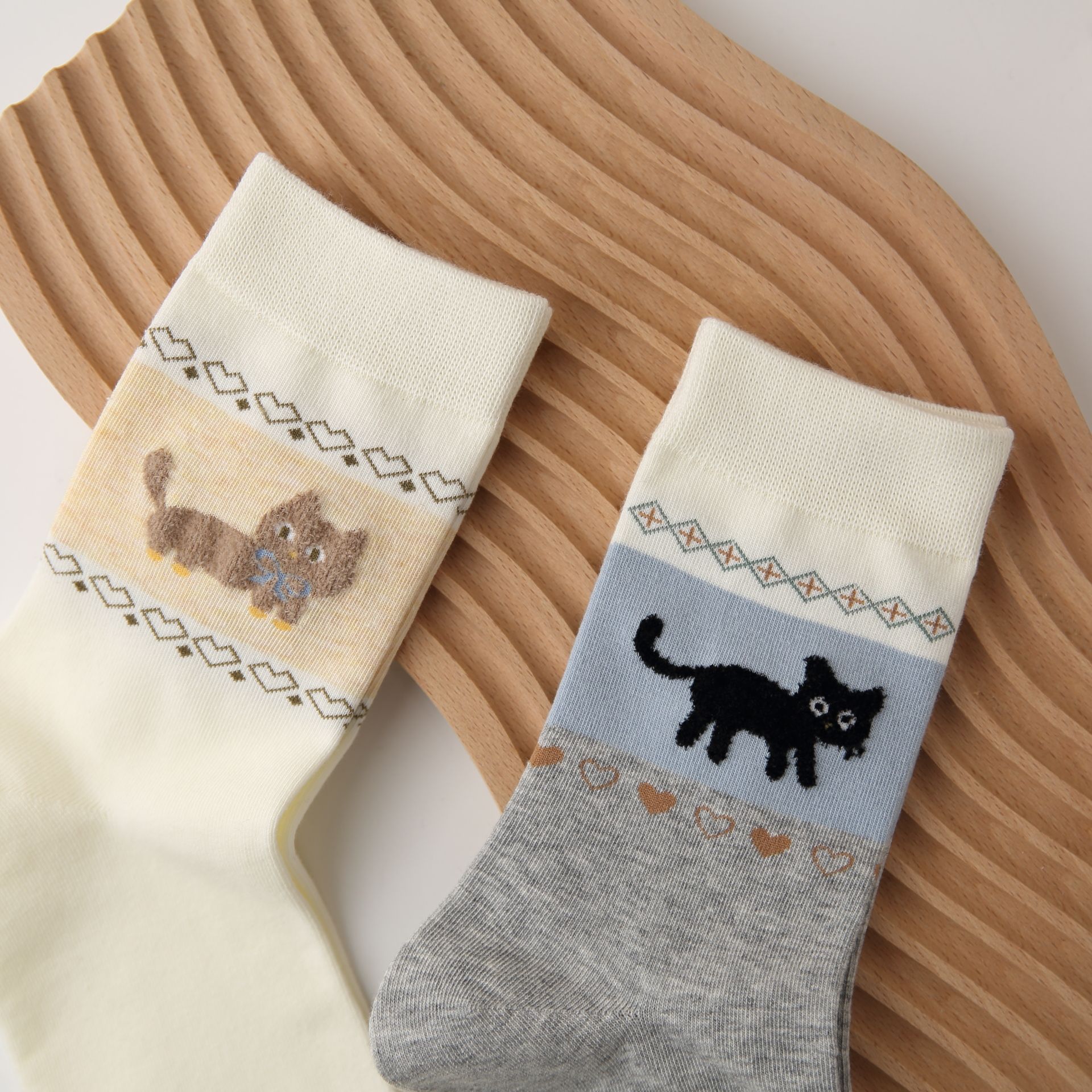 오리지널 양말 여성용 양말 무봉제 양말 레트로 스타일 배색 페어 아일 귀여운 만화 중간 길이 고양이 면 양말