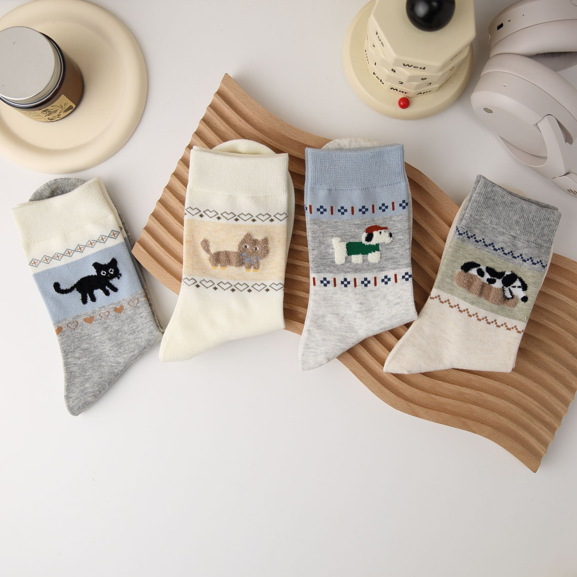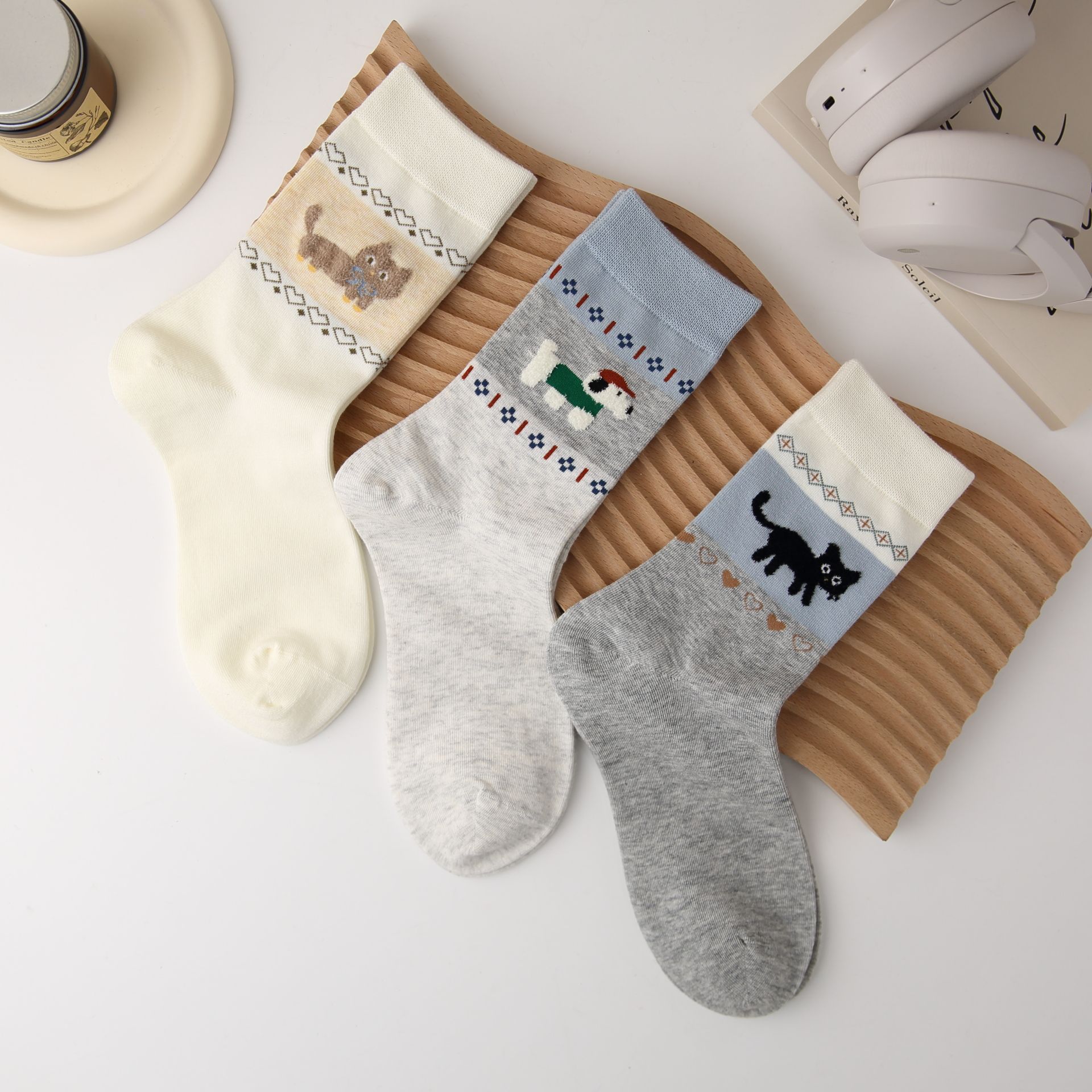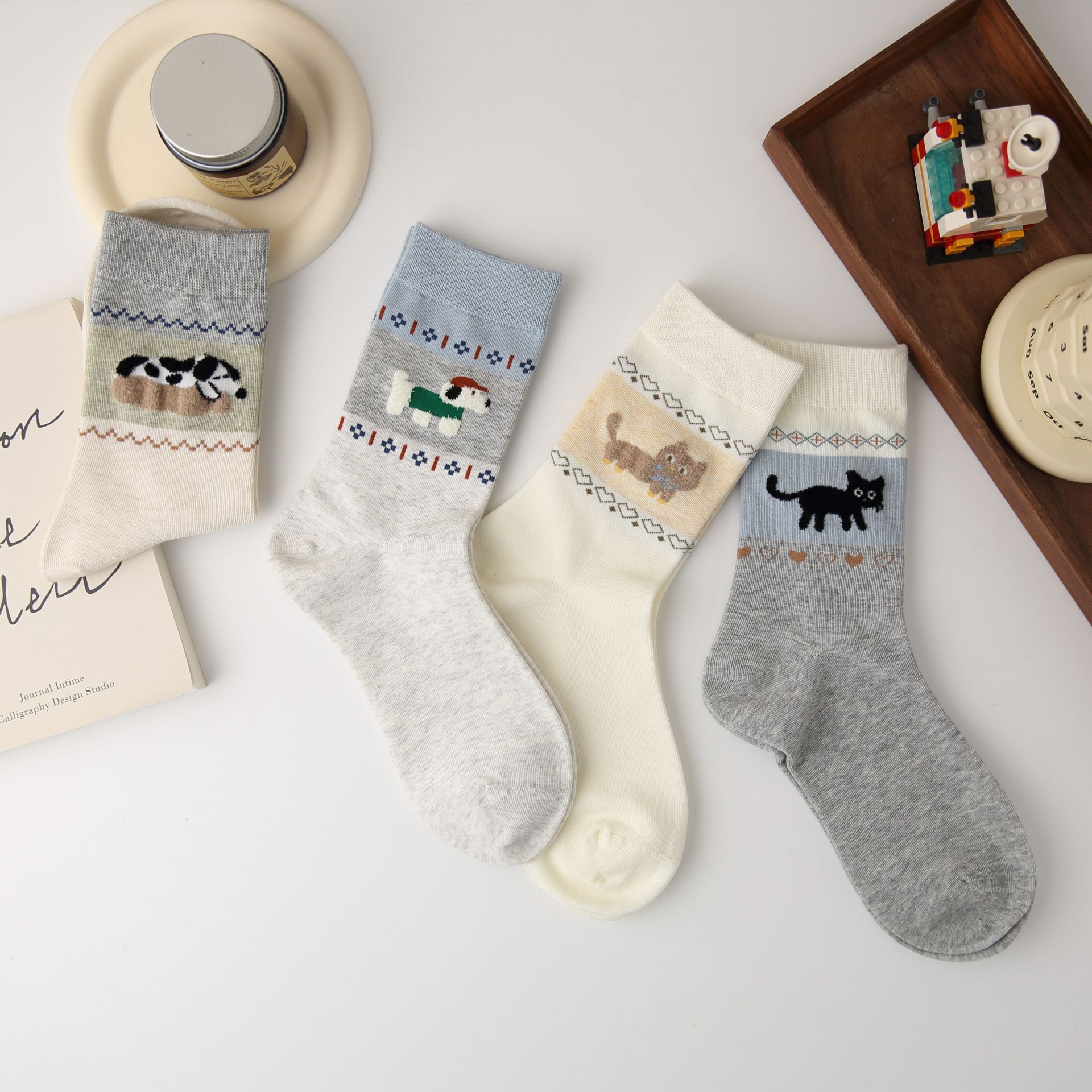 오리지널 양말 여성용 양말 무봉제 양말 레트로 스타일 배색 페어 아일 귀여운 만화 중간 길이 고양이 면 양말