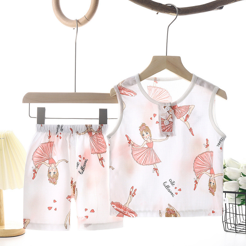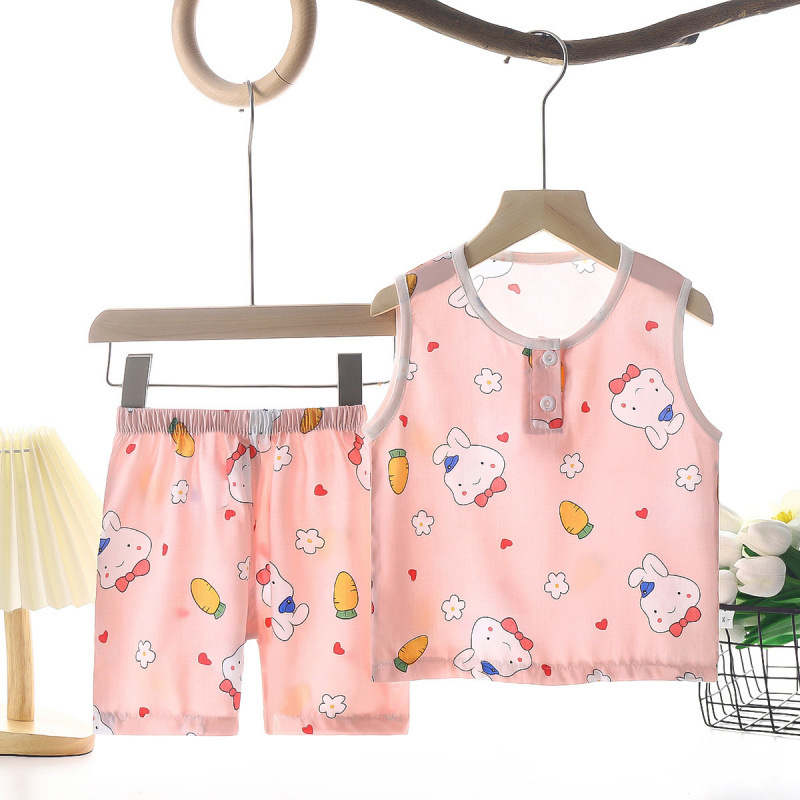 여름 어린이 조끼 세트 소년 소녀를위한 에어컨 세트 여름 반바지 면 실크 파자마 아기 옷 어린이 홈 옷