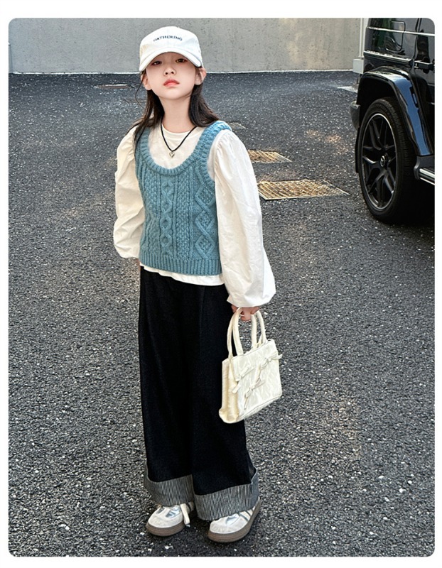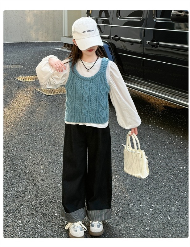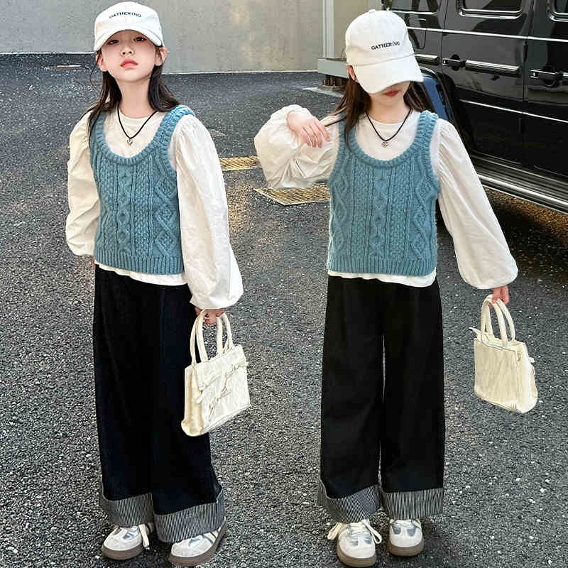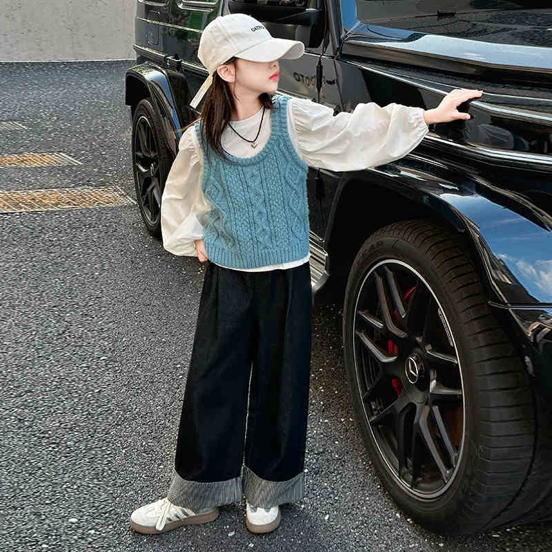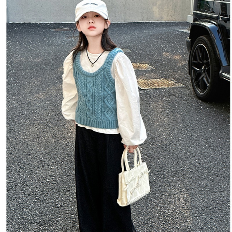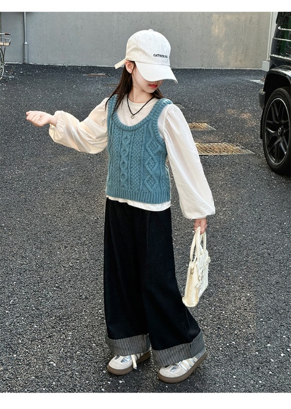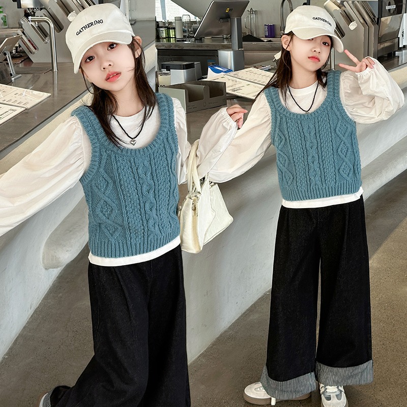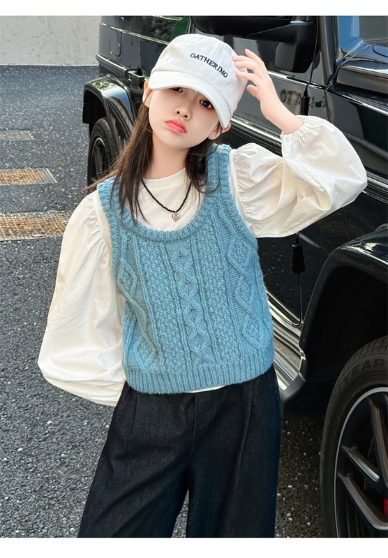 소녀의 봄과 가을 아동복 2025 새로운 올매치 니트웨어 조끼 블루 체닐 조끼스토어 가기