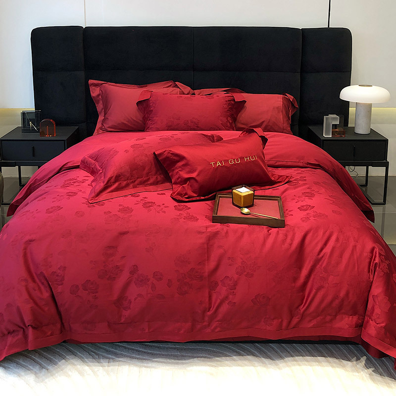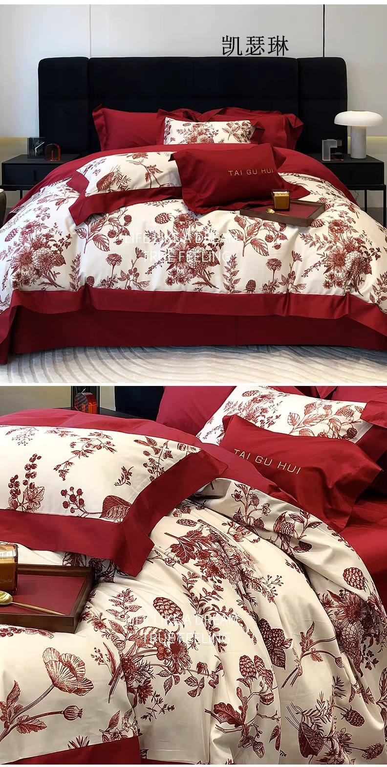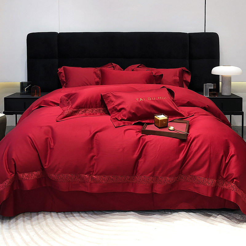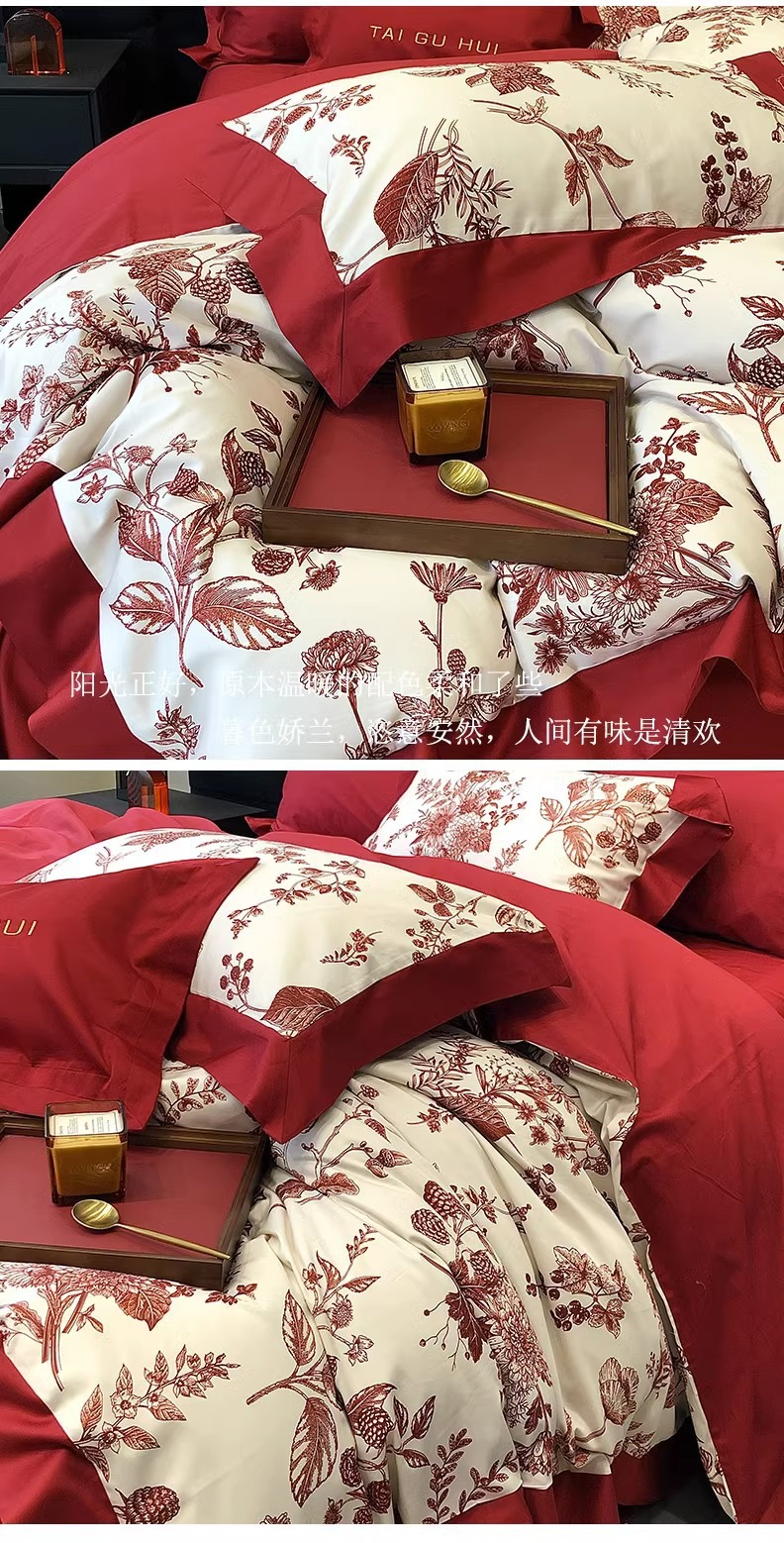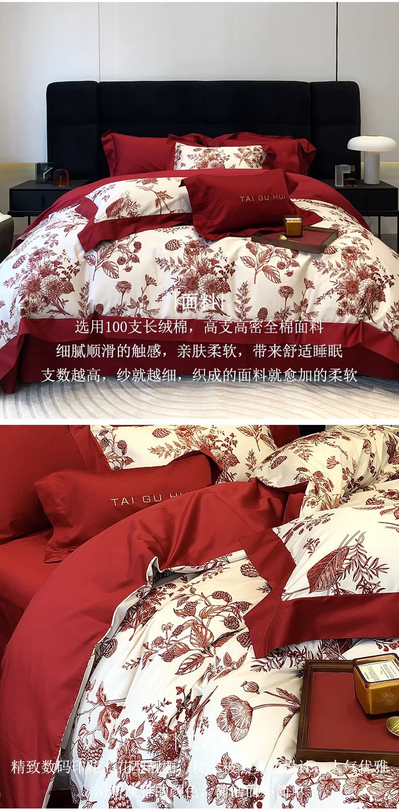 100 긴 스테이플 코튼 웨딩 4 피스 세트 간단한 레드 버건디 웨딩 코튼 양면 침구 4스토어 가기