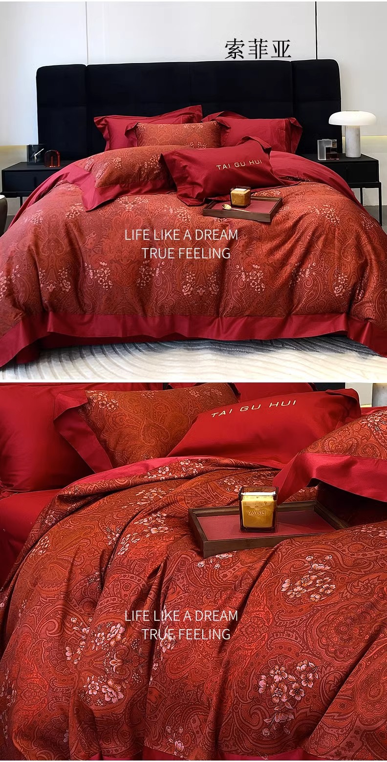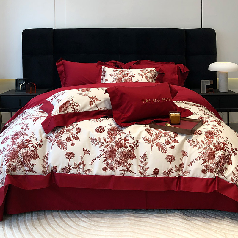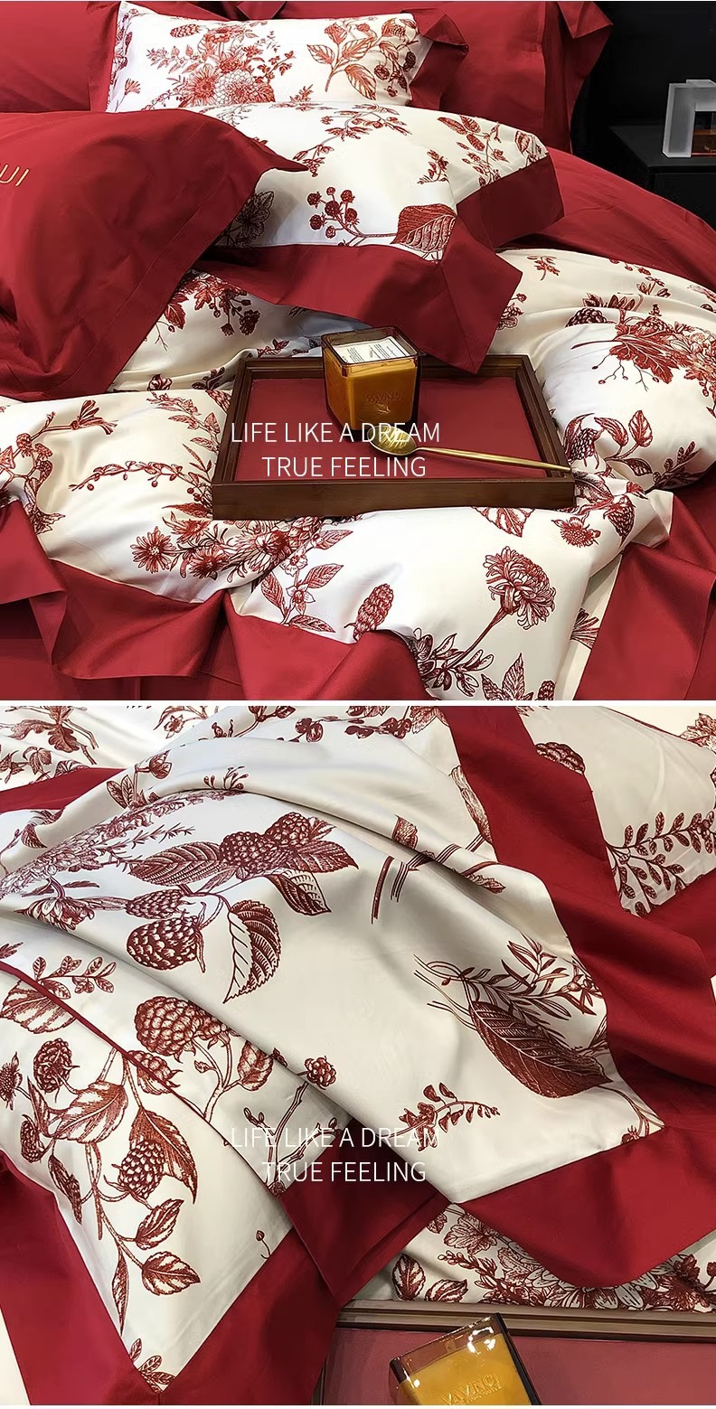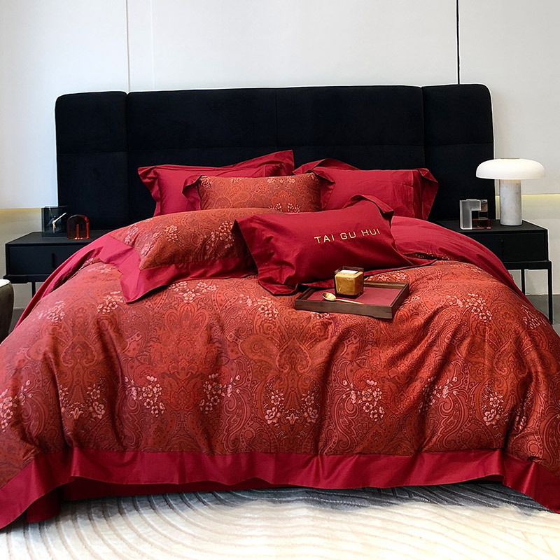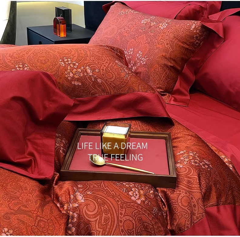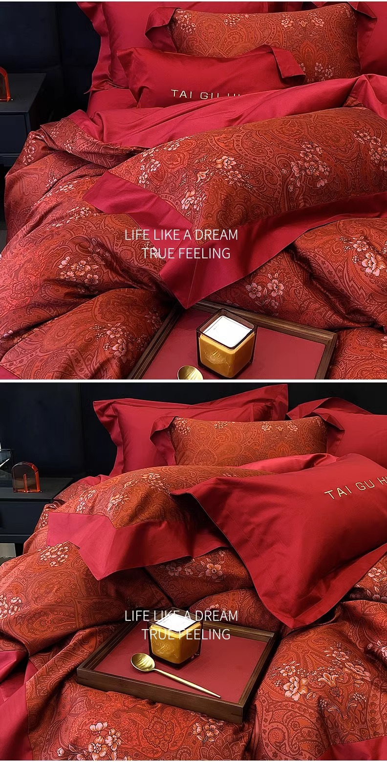 100 긴 스테이플 코튼 웨딩 4 피스 세트 간단한 레드 버건디 웨딩 코튼 양면 침구 4스토어 가기