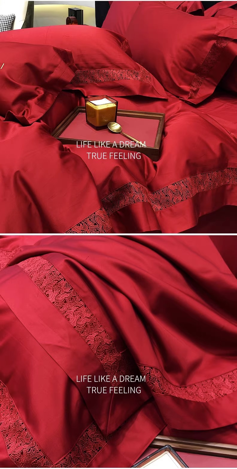 100 긴 스테이플 코튼 웨딩 4 피스 세트 간단한 레드 버건디 웨딩 코튼 양면 침구 4