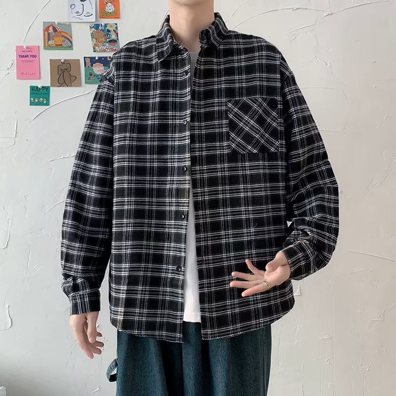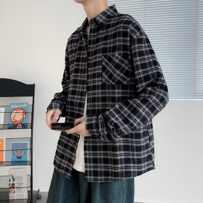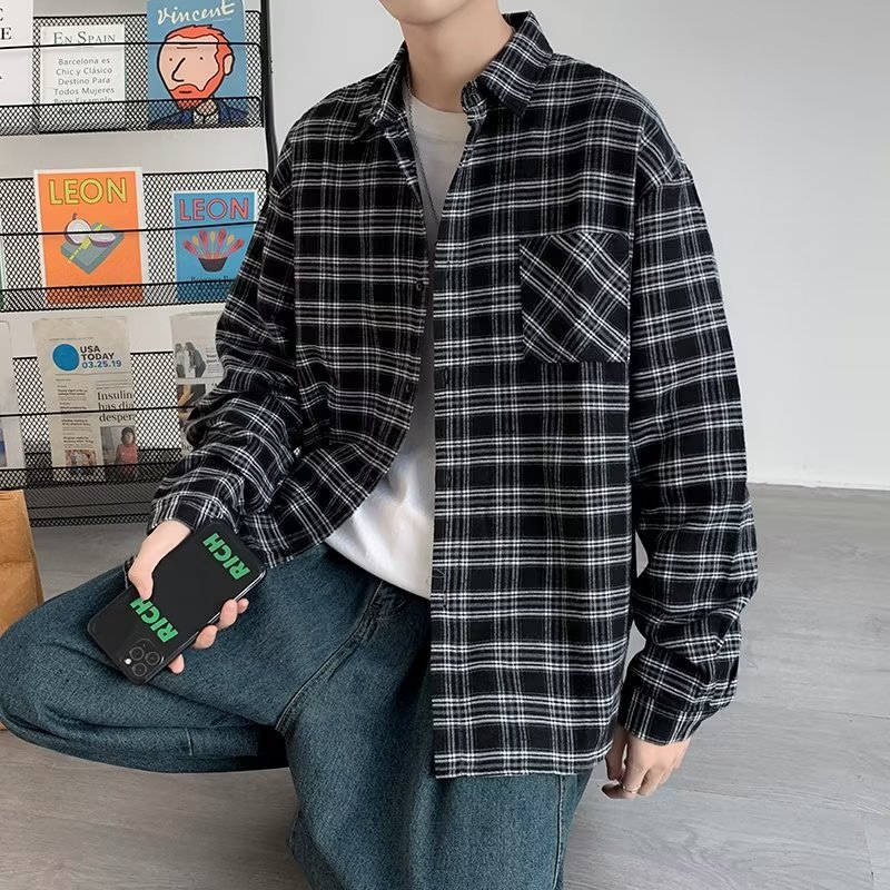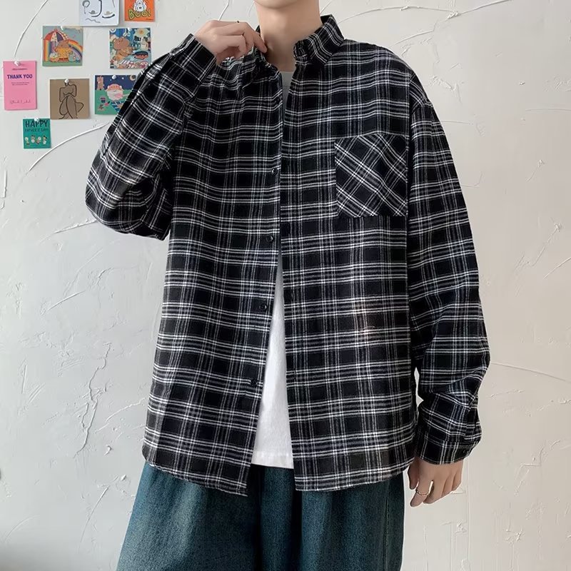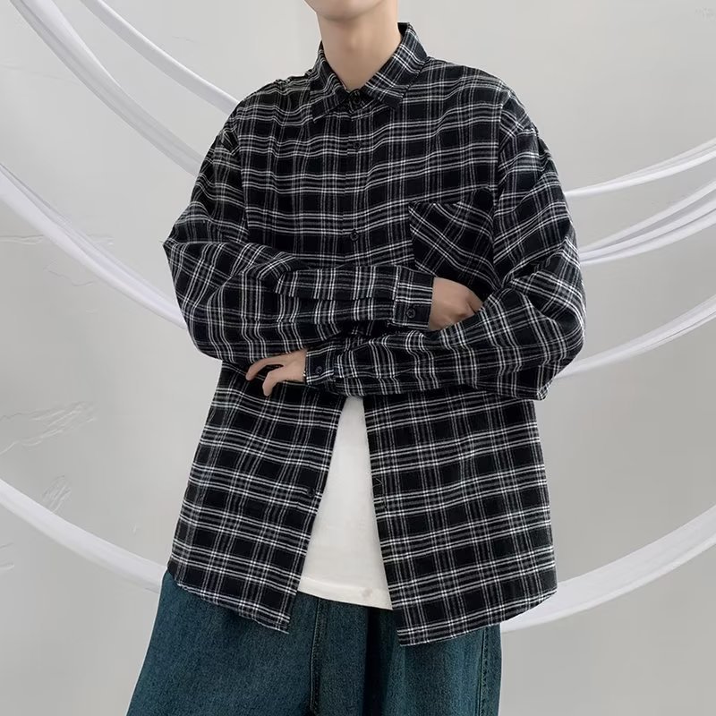 옷깃 잘 생긴 흑백 격자 무늬 긴팔 셔츠 남성 디자인 감각 틈새 고대 홍콩 스타일의 느슨한 셔츠 올 매치 코트