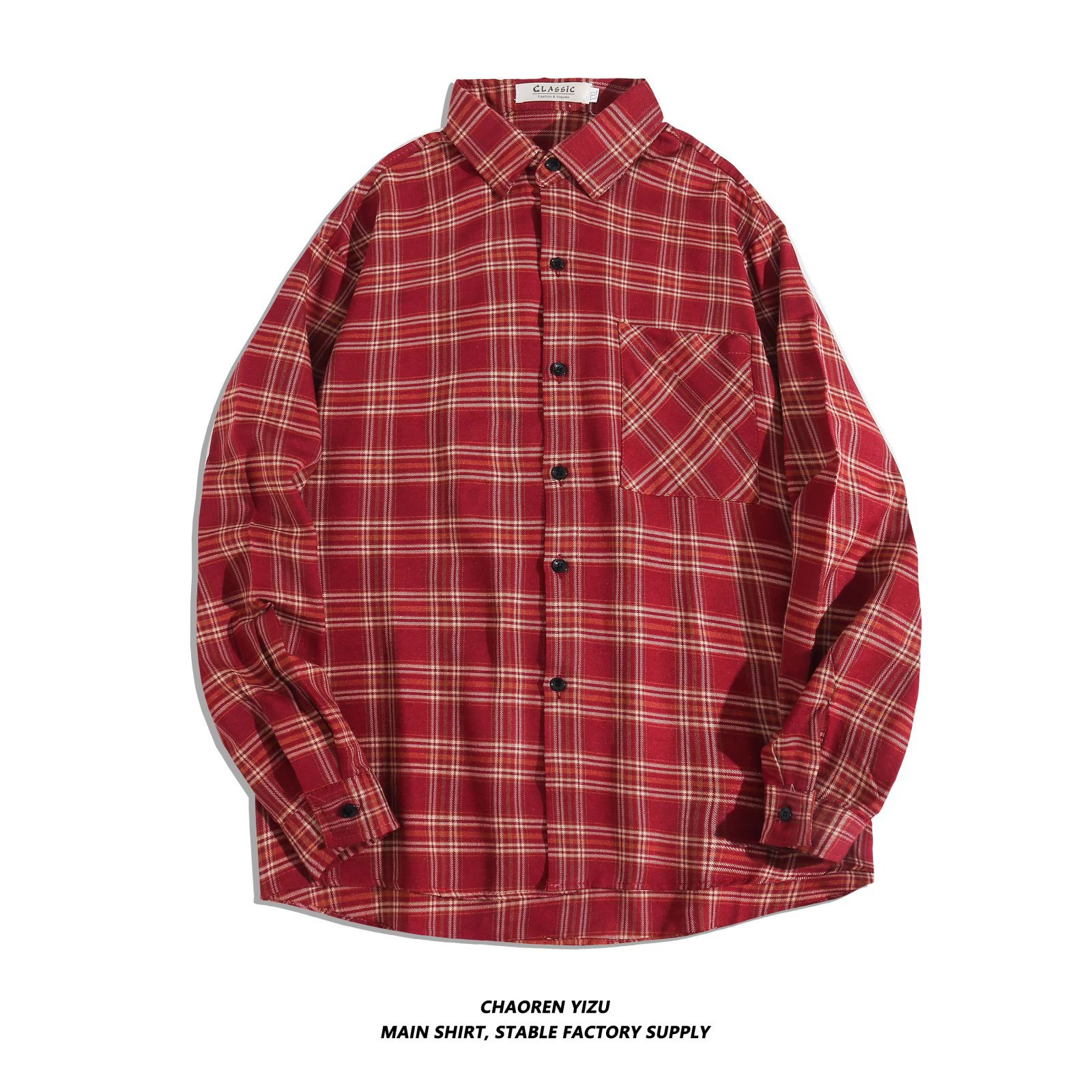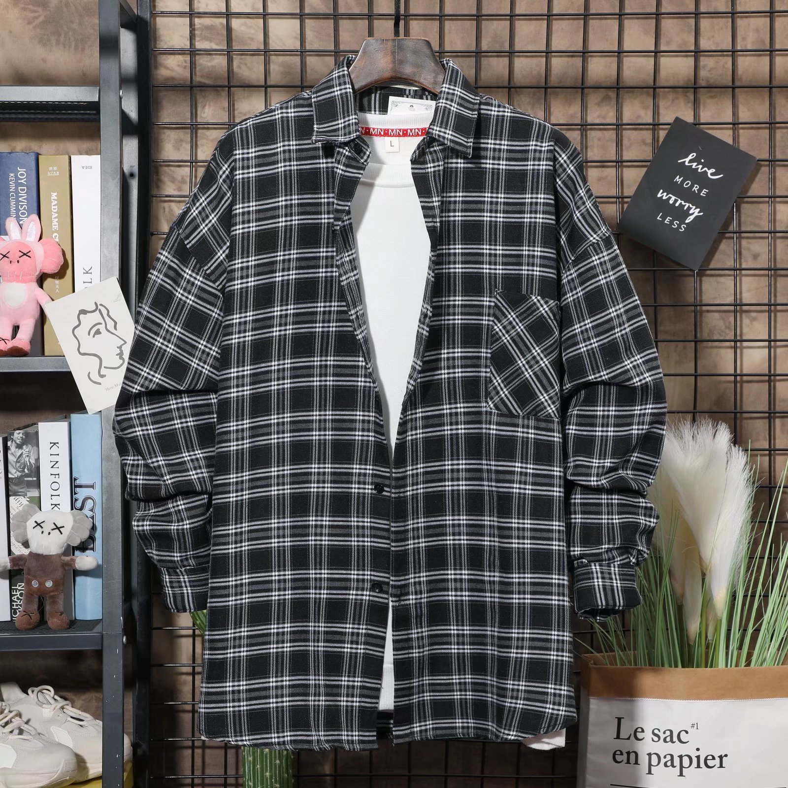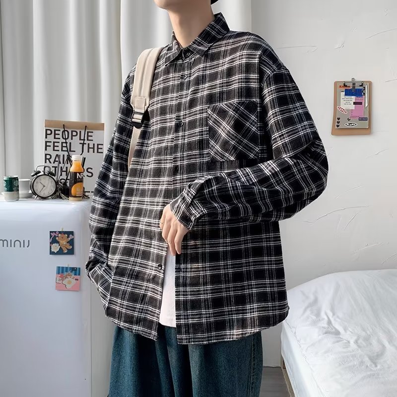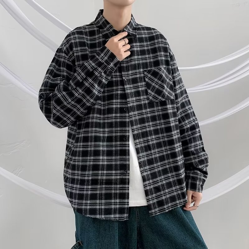 옷깃 잘 생긴 흑백 격자 무늬 긴팔 셔츠 남성 디자인 감각 틈새 고대 홍콩 스타일의 느슨한 셔츠 올 매치 코트