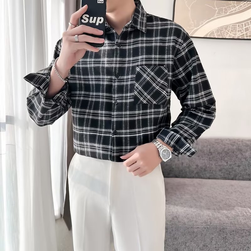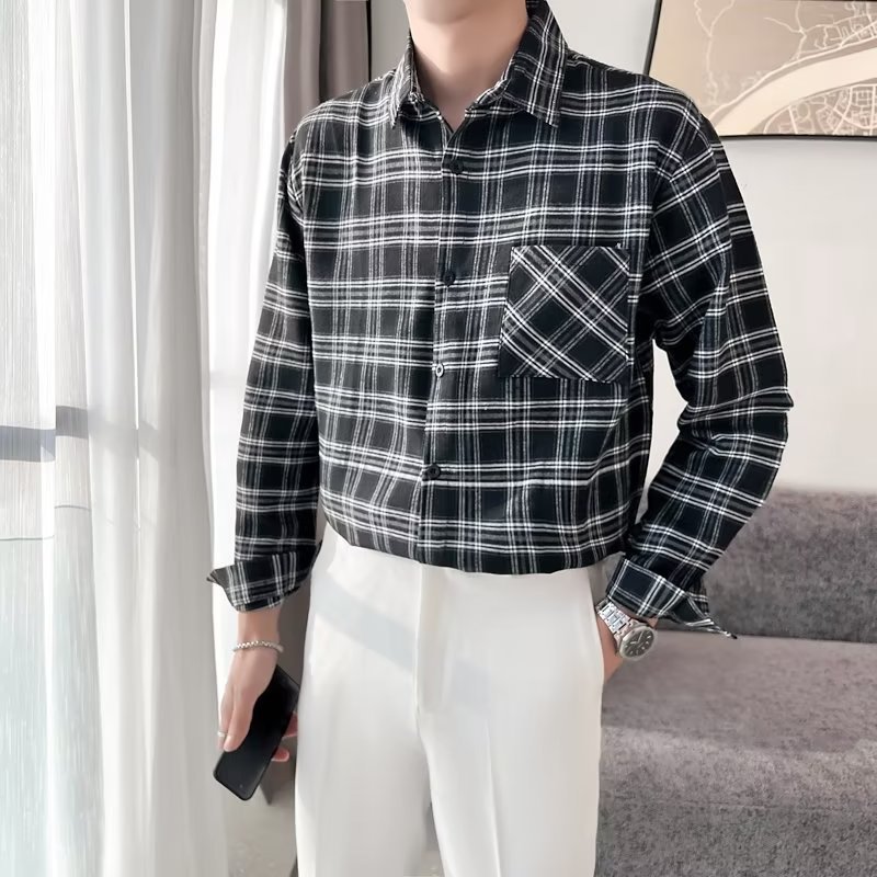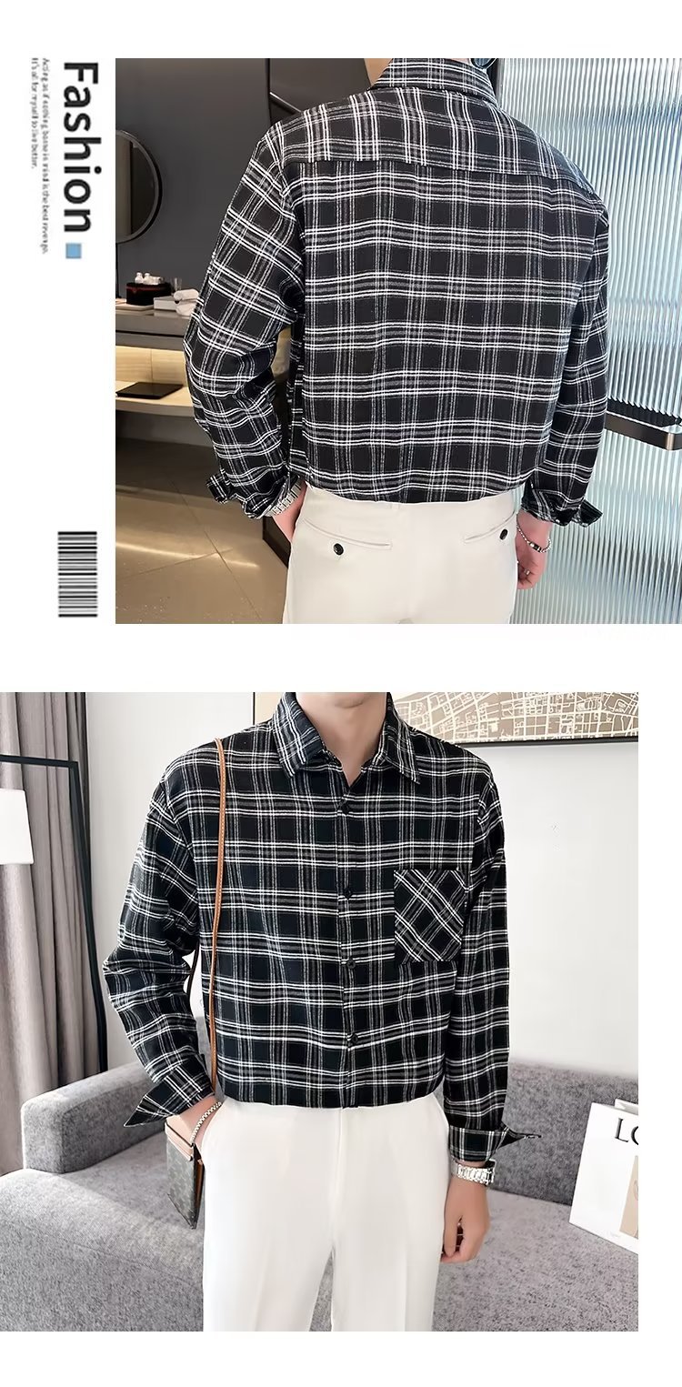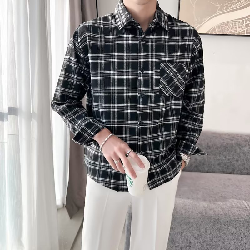 옷깃 잘 생긴 흑백 격자 무늬 긴팔 셔츠 남성 디자인 감각 틈새 고대 홍콩 스타일의 느슨한 셔츠 올 매치 코트스토어 가기