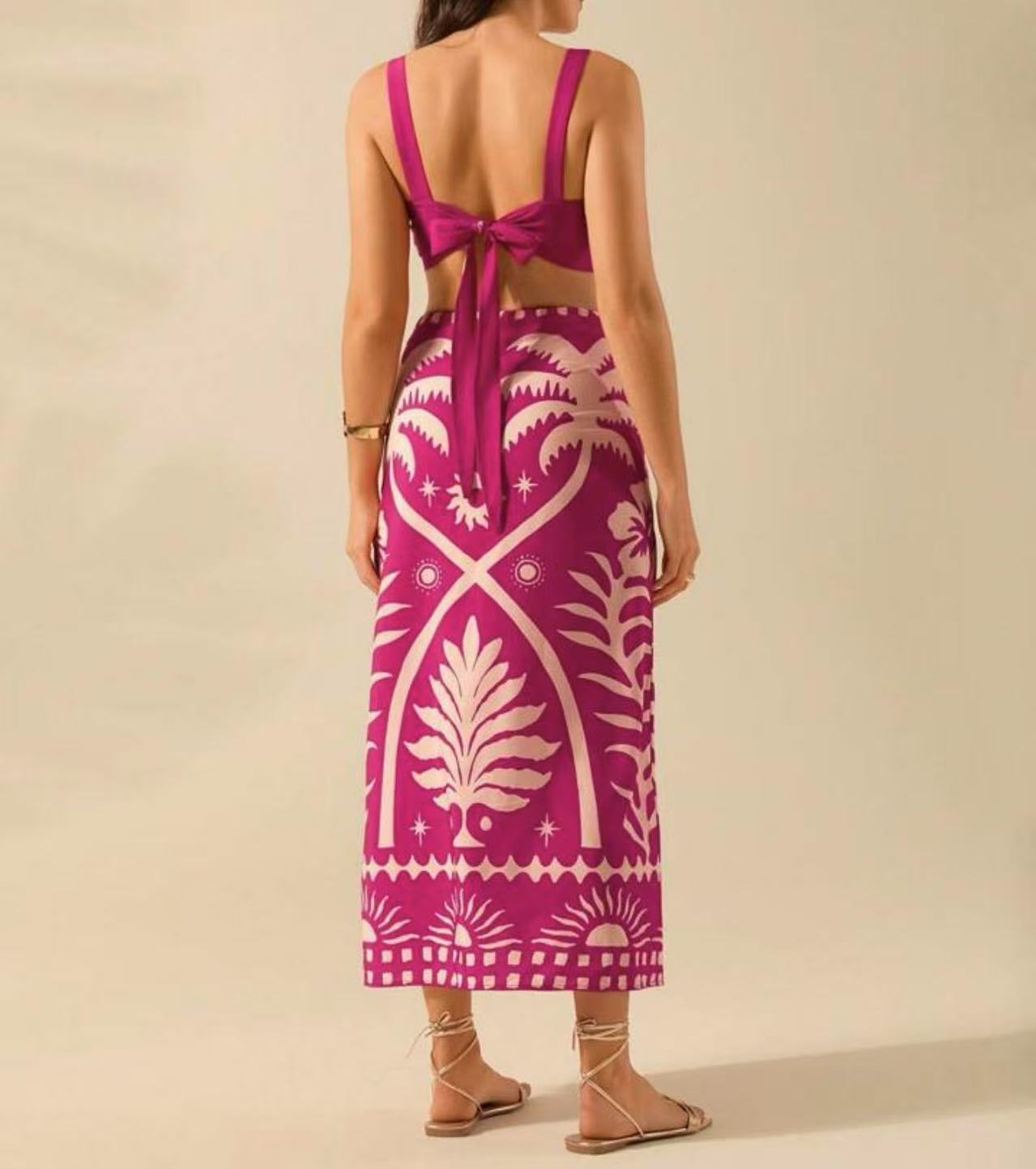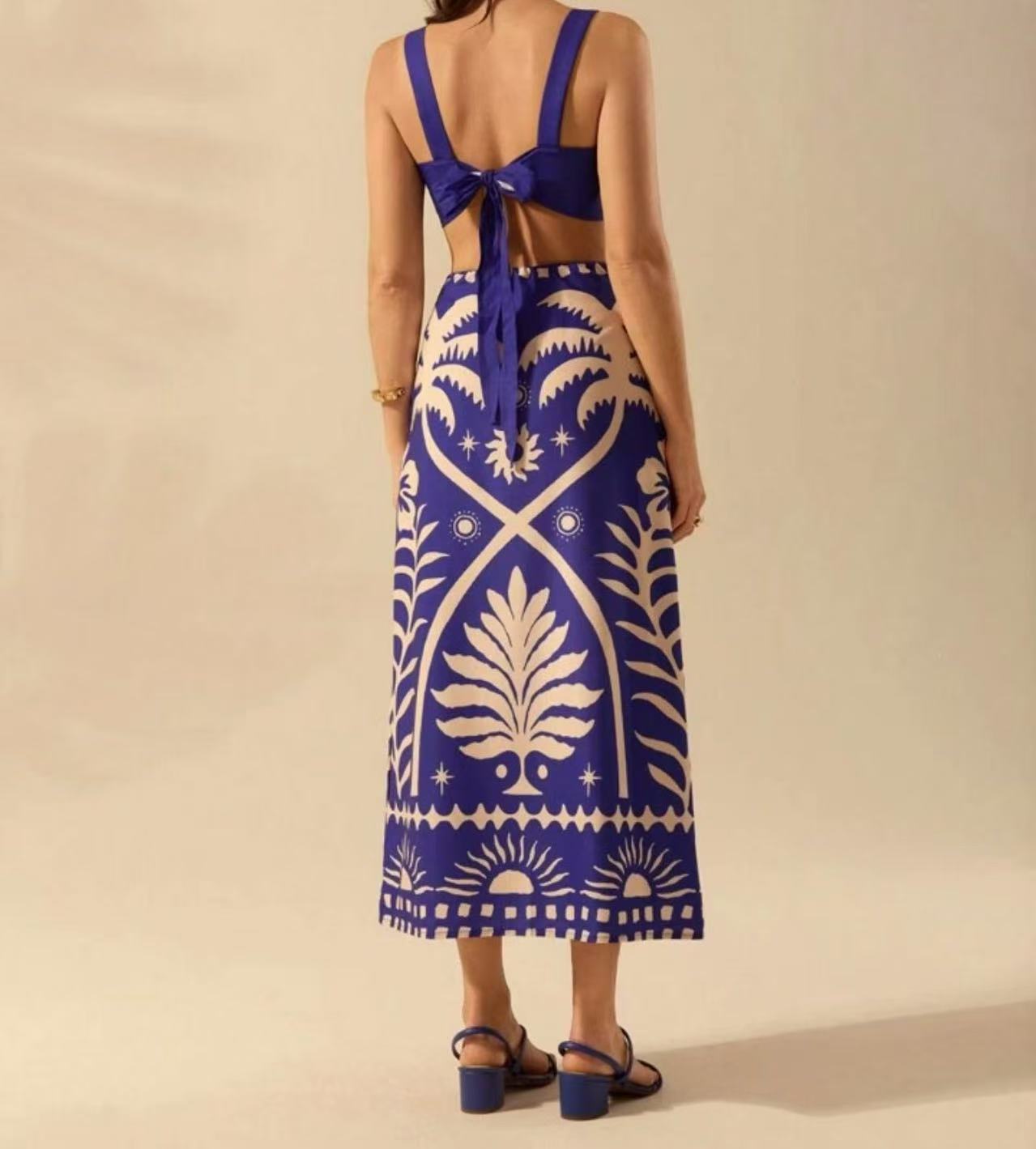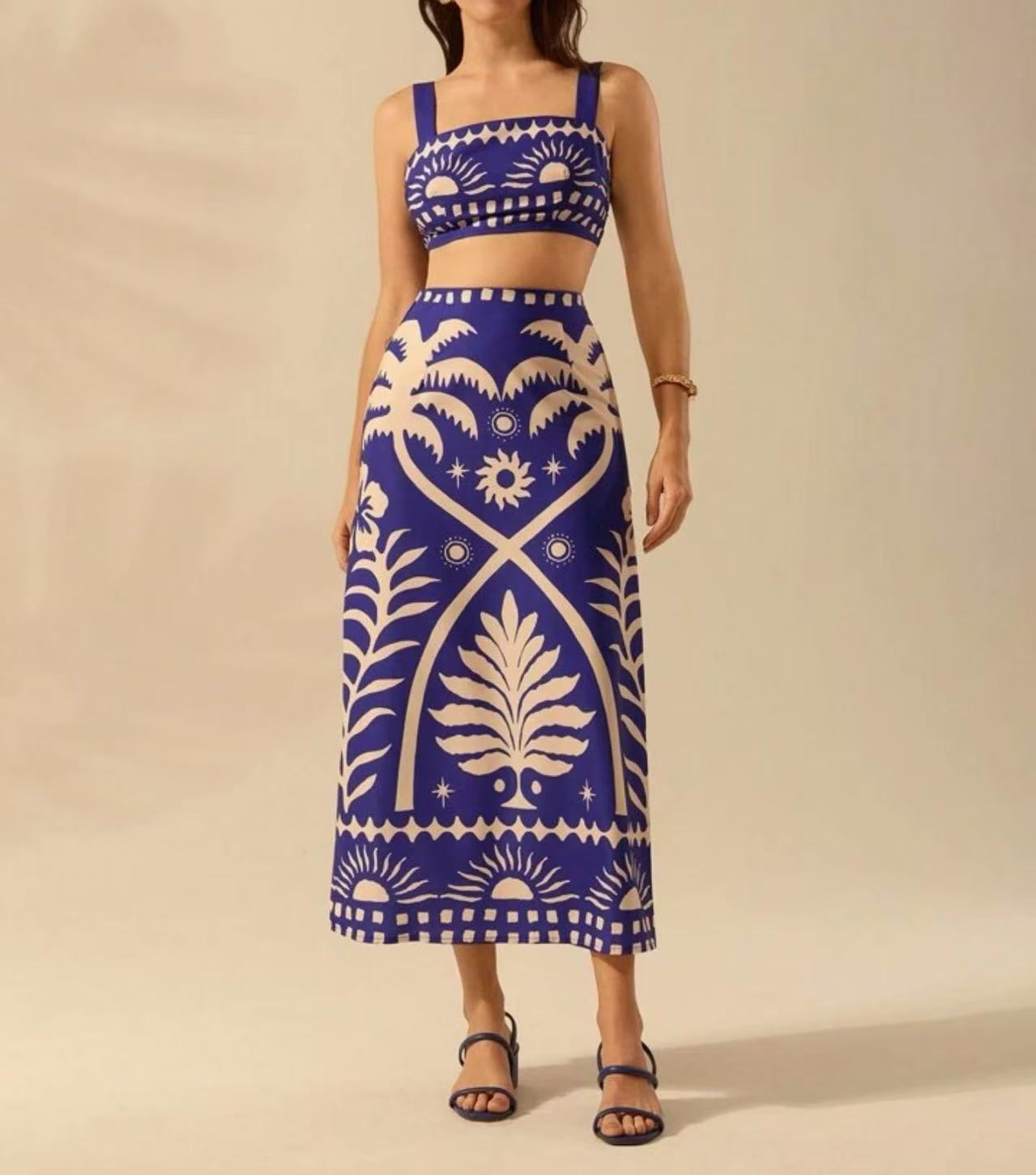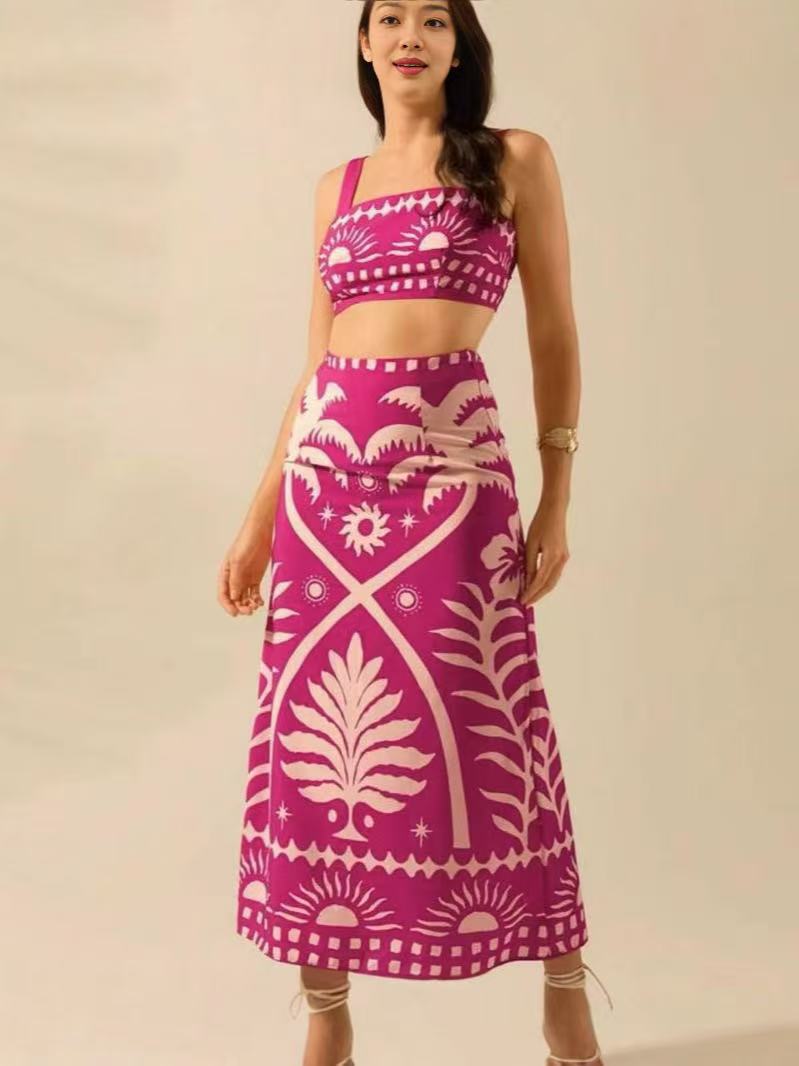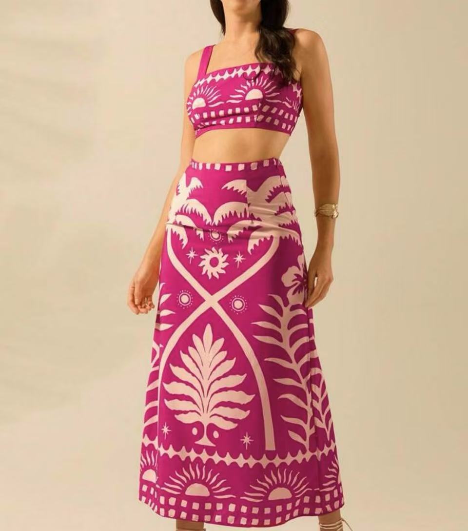 국경 간 아마존 여성 2025 유럽과 미국 여름 새로운 패션 섹시한 인쇄 슬링 긴 치마 세트